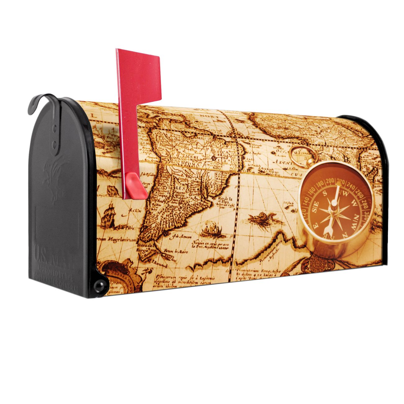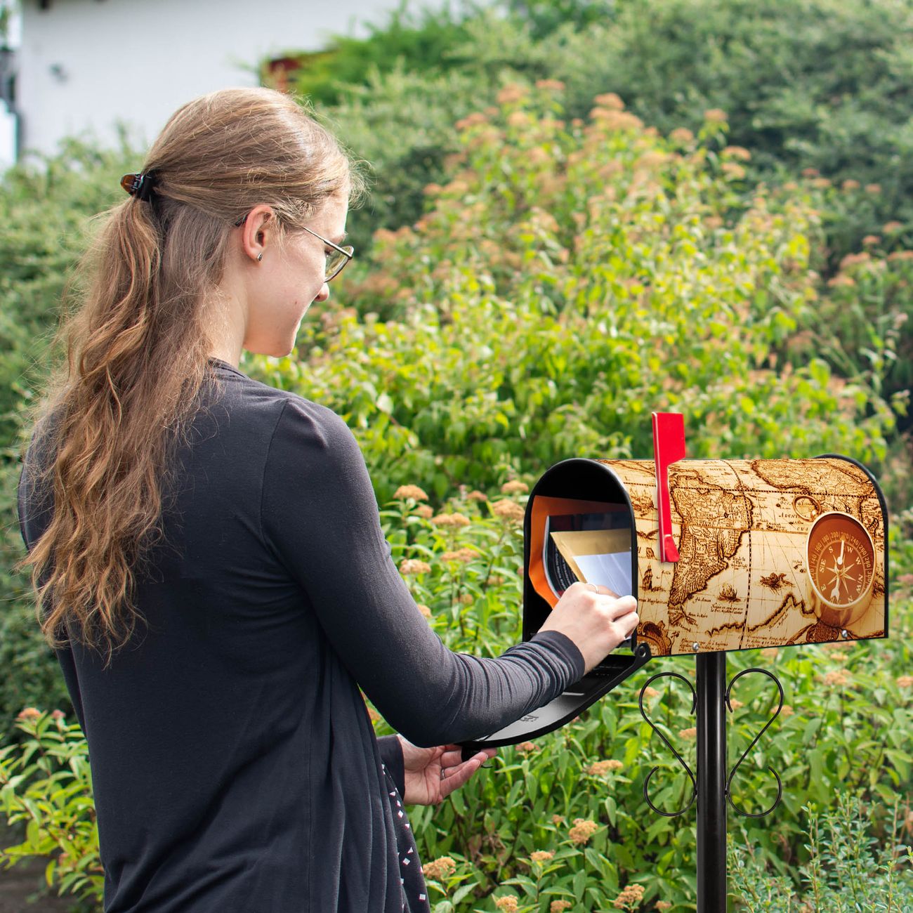 Der amerikanische Briefkasten von banjado mit World Map Motiv bietet Ihnen ausreichend Fassungsvermögen, um große A4 Sendungen und Zeitschriften zu empfangen. Die typisch amerikanische rote Fahne zeigt Ihnen an, wenn Sie Post erhalten haben. Die US-Mailbox besteht aus verzinktem Stahlblech welches lackiert wurde und ist 48 x 22 x 16 CM (BxHxT) groß. Die Folie mit Motiv World Map besteht aus einer wetter- und UV-resistenten Folie, die mit einem Schutzlaminat überzogen ist, sodass die US Mailbox zusätzlich vor Kratzern geschützt ist. An der Unterkante sind 4 Löcher je Seite um die Mailbox, typisch amerikanisch, an einem Holzpfahl oder einem Zaun zu befestigen. Auf Wunsch können Sie bei uns den passenden Standfuß oder die passende Wandhalterung kaufen um die US-Mailbox sicher zu befestigen. Wir bieten Ihnen ebenfalls Namensschilder, bereits beschriftet oder frei zu beschriften, und verschiedene selbst gestaltete Bitte-Keine-Werbung-Aufkleber.