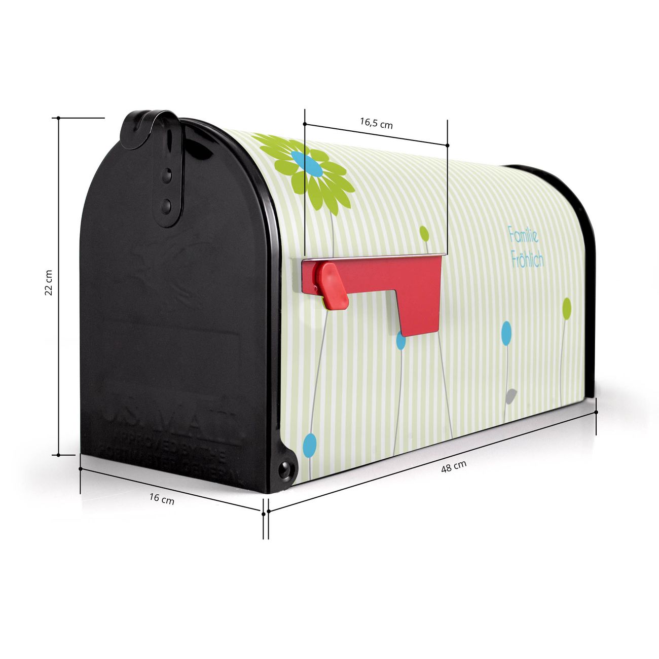 Der amerikanische Briefkasten von banjado mit Zarte Blumen Motiv bietet Ihnen ausreichend Fassungsvermögen, um große A4 Sendungen und Zeitschriften zu empfangen. Die typisch amerikanische rote Fahne zeigt Ihnen an, wenn Sie Post erhalten haben. Die US-Mailbox besteht aus verzinktem Stahlblech welches lackiert wurde und ist 48 x 22 x 16 CM (BxHxT) groß. Die Folie mit Motiv Zarte Blumen besteht aus einer wetter- und UV-resistenten Folie, die mit einem Schutzlaminat überzogen ist, sodass die US Mailbox zusätzlich vor Kratzern geschützt ist. An der Unterkante sind 4 Löcher je Seite um die Mailbox, typisch amerikanisch, an einem Holzpfahl oder einem Zaun zu befestigen. Auf Wunsch können Sie bei uns den passenden Standfuß oder die passende Wandhalterung kaufen um die US-Mailbox sicher zu befestigen. Wir bieten Ihnen ebenfalls Namensschilder, bereits beschriftet oder frei zu beschriften, und verschiedene selbst gestaltete Bitte-Keine-Werbung-Aufkleber.