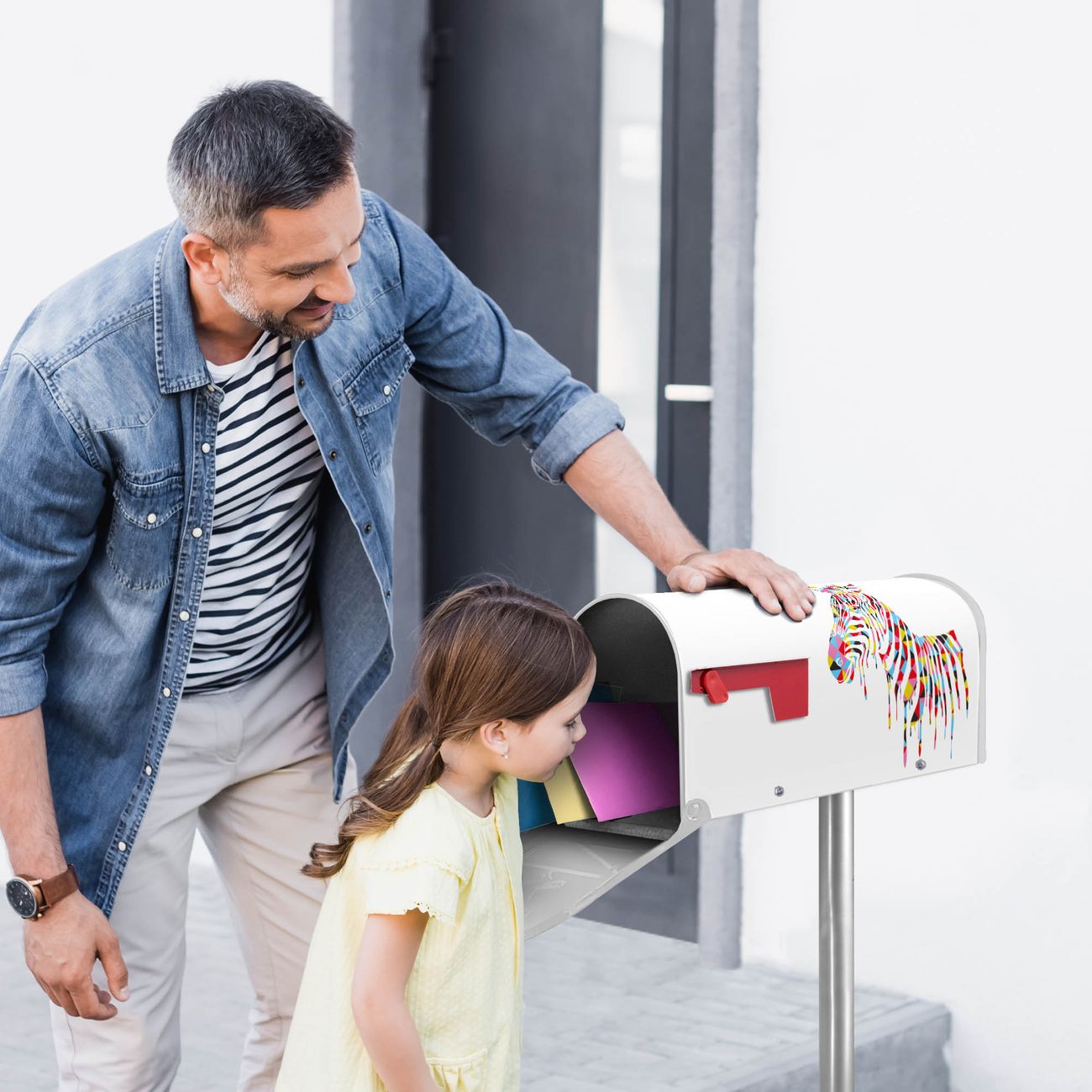 Der amerikanische Briefkasten von banjado mit Zebra Motiv bietet Ihnen ausreichend Fassungsvermögen, um große A4 Sendungen und Zeitschriften zu empfangen. Die typisch amerikanische rote Fahne zeigt Ihnen an, wenn Sie Post erhalten haben. Die US-Mailbox besteht aus verzinktem Stahlblech welches lackiert wurde und ist 48 x 22 x 16 CM (BxHxT) groß. Die Folie mit Motiv Zebra besteht aus einer wetter- und UV-resistenten Folie, die mit einem Schutzlaminat überzogen ist, sodass die US Mailbox zusätzlich vor Kratzern geschützt ist. An der Unterkante sind 4 Löcher je Seite um die Mailbox, typisch amerikanisch, an einem Holzpfahl oder einem Zaun zu befestigen. Auf Wunsch können Sie bei uns den passenden Standfuß oder die passende Wandhalterung kaufen um die US-Mailbox sicher zu befestigen. Wir bieten Ihnen ebenfalls Namensschilder, bereits beschriftet oder frei zu beschriften, und verschiedene selbst gestaltete Bitte-Keine-Werbung-Aufkleber.