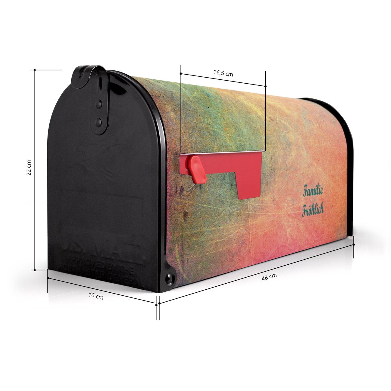 Der amerikanische Briefkasten von banjado mit Zerkratzt 2 Motiv bietet Ihnen ausreichend Fassungsvermögen, um große A4 Sendungen und Zeitschriften zu empfangen. Die typisch amerikanische rote Fahne zeigt Ihnen an, wenn Sie Post erhalten haben. Die US-Mailbox besteht aus verzinktem Stahlblech welches lackiert wurde und ist 48 x 22 x 16 CM (BxHxT) groß. Die Folie mit Motiv Zerkratzt 2 besteht aus einer wetter- und UV-resistenten Folie, die mit einem Schutzlaminat überzogen ist, sodass die US Mailbox zusätzlich vor Kratzern geschützt ist. An der Unterkante sind 4 Löcher je Seite um die Mailbox, typisch amerikanisch, an einem Holzpfahl oder einem Zaun zu befestigen. Auf Wunsch können Sie bei uns den passenden Standfuß oder die passende Wandhalterung kaufen um die US-Mailbox sicher zu befestigen. Wir bieten Ihnen ebenfalls Namensschilder, bereits beschriftet oder frei zu beschriften, und verschiedene selbst gestaltete Bitte-Keine-Werbung-Aufkleber.