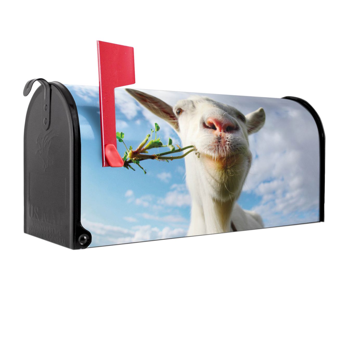 Unser amerikanischer Briefkasten mit dem Motiv Ziege 2 hat ein sehr ansprechendes und ausgefallenes Design, ist in der Grundfarbe weiß, grün oder schwarz erhältlich. Damit entlocken Sie Ihren Nachbarn und dem Postboten immer wieder ein Lächeln. Die Mailbox ist ein Original Import aus Mississippi USA und wird von unserer kleinen Manufaktur in Sachsen von Hand veredelt. Die US-Mailbox bietet ausreichend Platz auch für große Sendungen, eine Fahne die Ihnen Post anzeigt, wetterfestes und äußerst stabiles Material - so macht Post empfangen Freude.