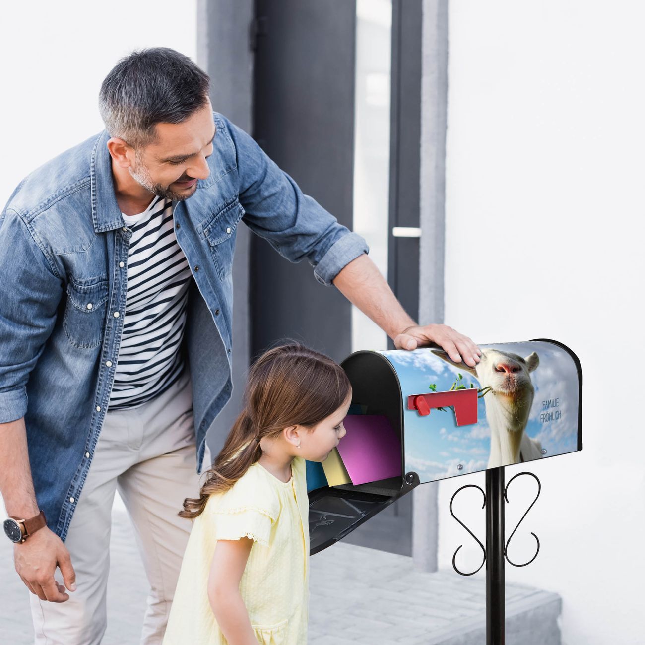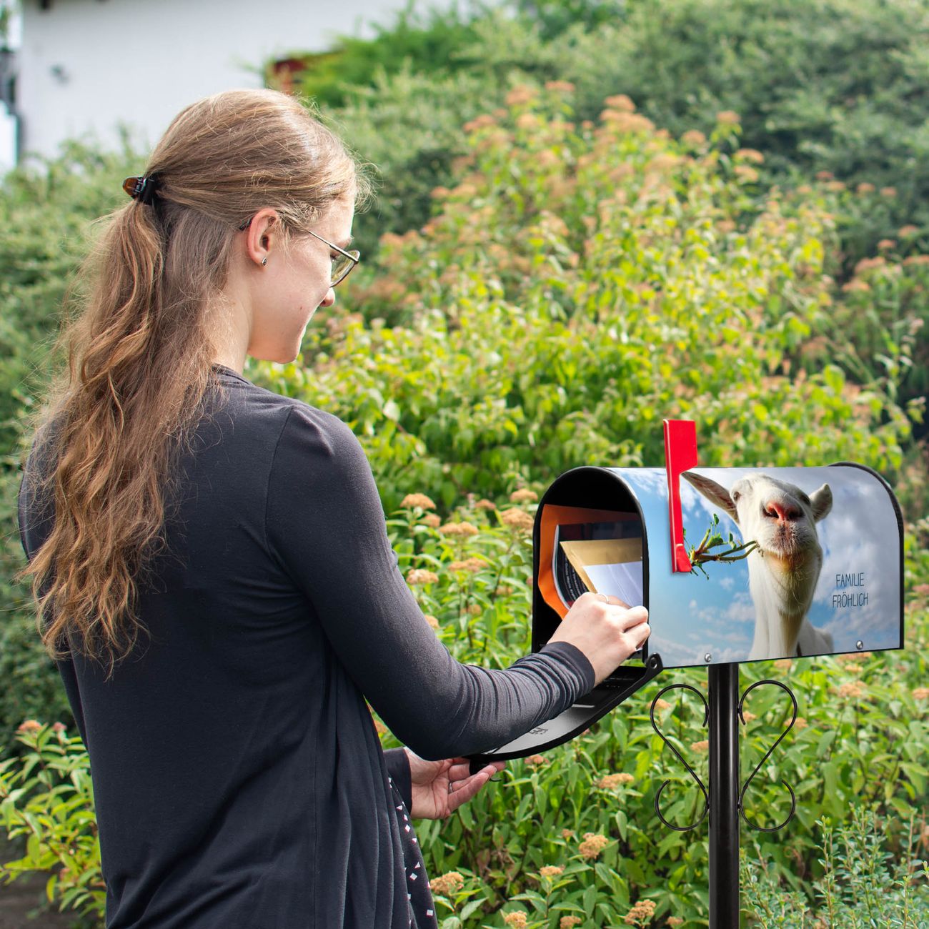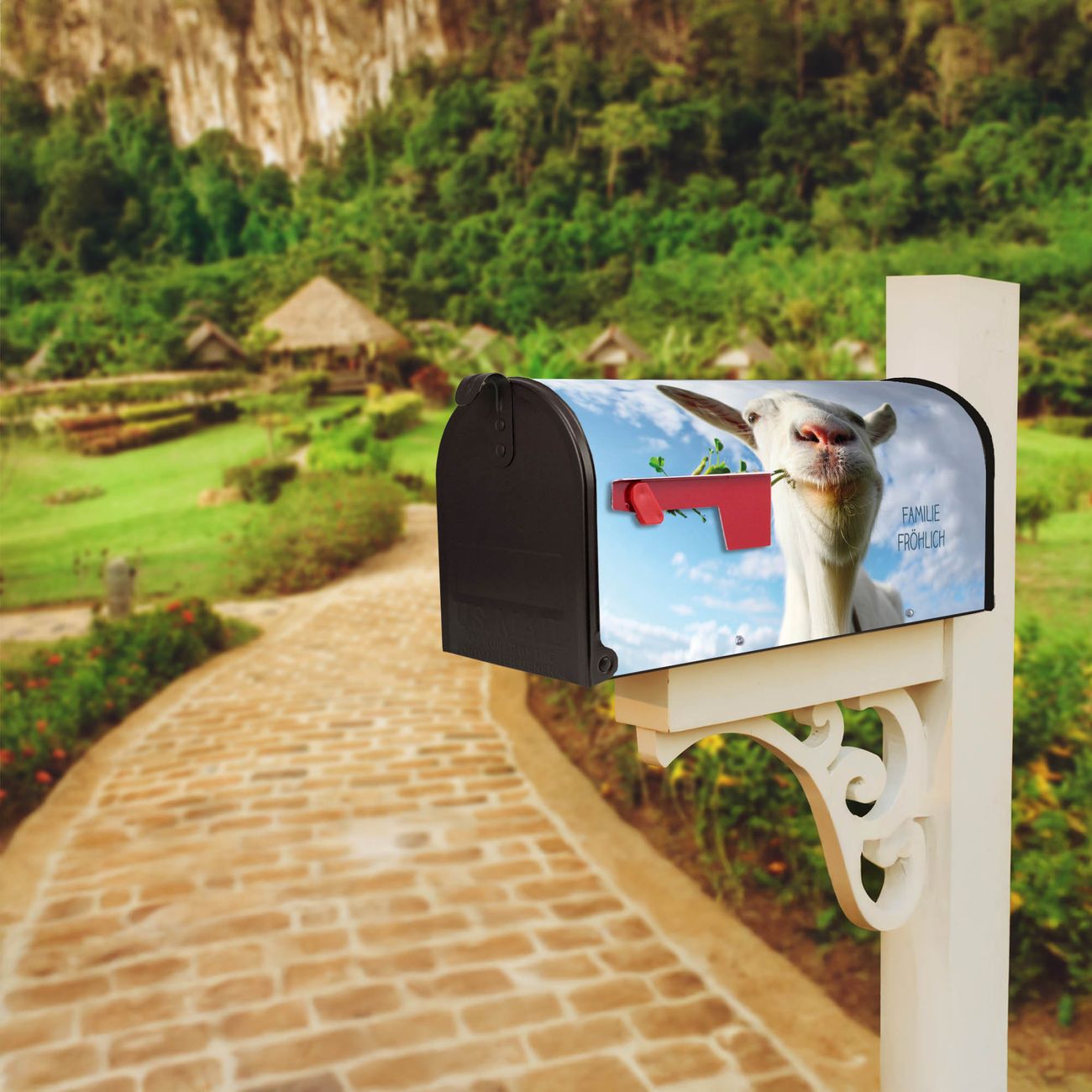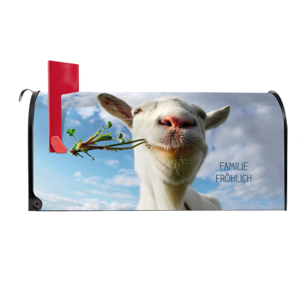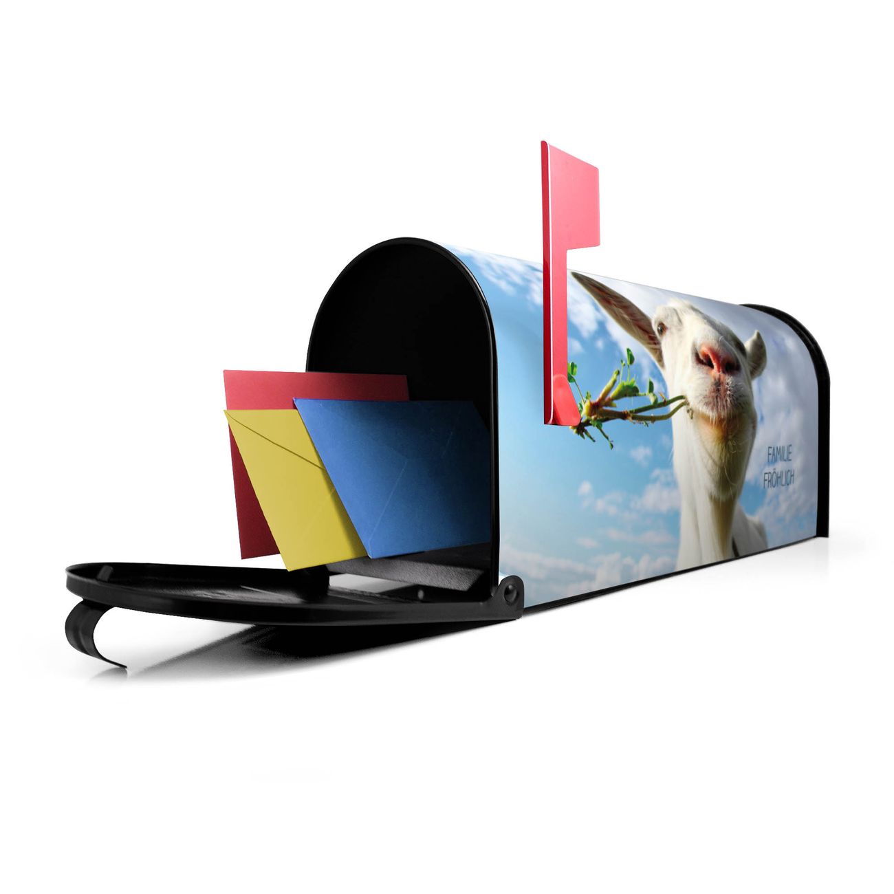 Unser amerikanischer Briefkasten mit dem Motiv Ziege 2 hat ein sehr ansprechendes und ausgefallenes Design, ist in der Grundfarbe weiß, grün oder schwarz erhältlich. Damit entlocken Sie Ihren Nachbarn und dem Postboten immer wieder ein Lächeln. Die Mailbox ist ein Original Import aus Mississippi USA und wird von unserer kleinen Manufaktur in Sachsen von Hand veredelt. Die US-Mailbox bietet ausreichend Platz auch für große Sendungen, eine Fahne die Ihnen Post anzeigt, wetterfestes und äußerst stabiles Material - so macht Post empfangen Freude.