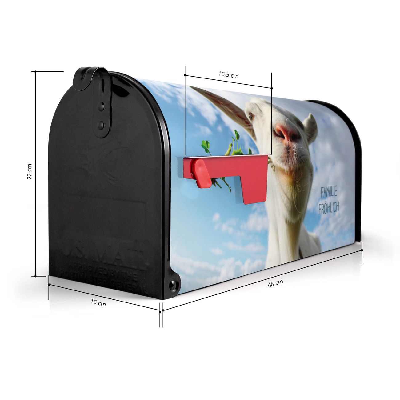 Der amerikanische Briefkasten von banjado mit Ziege 2 Motiv bietet Ihnen ausreichend Fassungsvermögen, um große A4 Sendungen und Zeitschriften zu empfangen. Die typisch amerikanische rote Fahne zeigt Ihnen an, wenn Sie Post erhalten haben. Die US-Mailbox besteht aus verzinktem Stahlblech welches lackiert wurde und ist 48 x 22 x 16 CM (BxHxT) groß. Die Folie mit Motiv Ziege 2 besteht aus einer wetter- und UV-resistenten Folie, die mit einem Schutzlaminat überzogen ist, sodass die US Mailbox zusätzlich vor Kratzern geschützt ist. An der Unterkante sind 4 Löcher je Seite um die Mailbox, typisch amerikanisch, an einem Holzpfahl oder einem Zaun zu befestigen. Auf Wunsch können Sie bei uns den passenden Standfuß oder die passende Wandhalterung kaufen um die US-Mailbox sicher zu befestigen. Wir bieten Ihnen ebenfalls Namensschilder, bereits beschriftet oder frei zu beschriften, und verschiedene selbst gestaltete Bitte-Keine-Werbung-Aufkleber.
