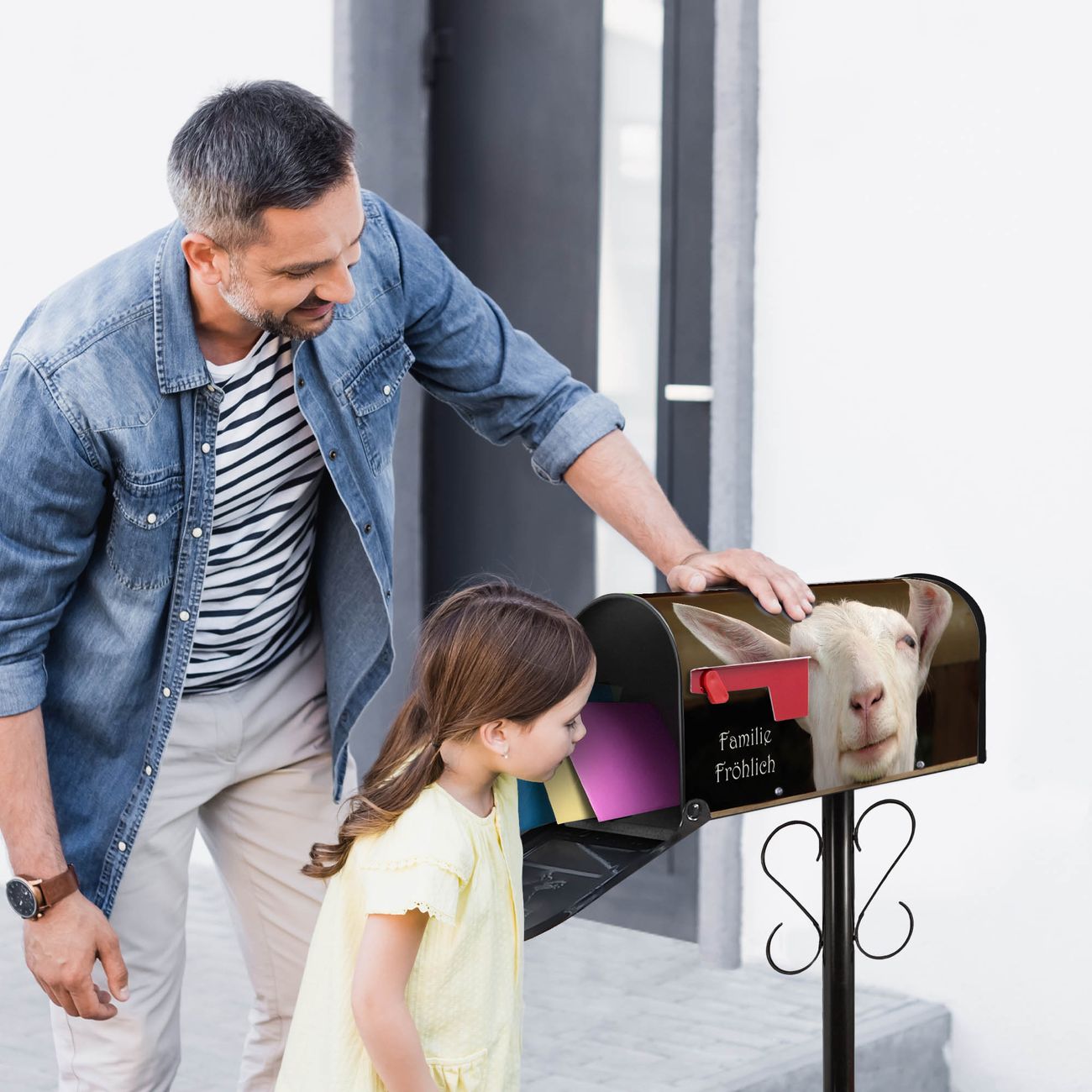 Unser amerikanischer Briefkasten mit dem Motiv Ziege hat ein sehr ansprechendes und ausgefallenes Design, ist in der Grundfarbe weiß, grün oder schwarz erhältlich. Damit entlocken Sie Ihren Nachbarn und dem Postboten immer wieder ein Lächeln. Die Mailbox ist ein Original Import aus Mississippi USA und wird von unserer kleinen Manufaktur in Sachsen von Hand veredelt. Die US-Mailbox bietet ausreichend Platz auch für große Sendungen, eine Fahne die Ihnen Post anzeigt, wetterfestes und äußerst stabiles Material - so macht Post empfangen Freude.