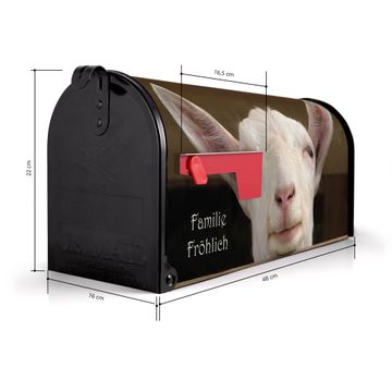 Der amerikanische Briefkasten von banjado mit Ziege Motiv bietet Ihnen ausreichend Fassungsvermögen, um große A4 Sendungen und Zeitschriften zu empfangen. Die typisch amerikanische rote Fahne zeigt Ihnen an, wenn Sie Post erhalten haben. Die US-Mailbox besteht aus verzinktem Stahlblech welches lackiert wurde und ist 48 x 22 x 16 CM (BxHxT) groß. Die Folie mit Motiv Ziege besteht aus einer wetter- und UV-resistenten Folie, die mit einem Schutzlaminat überzogen ist, sodass die US Mailbox zusätzlich vor Kratzern geschützt ist. An der Unterkante sind 4 Löcher je Seite um die Mailbox, typisch amerikanisch, an einem Holzpfahl oder einem Zaun zu befestigen. Auf Wunsch können Sie bei uns den passenden Standfuß oder die passende Wandhalterung kaufen um die US-Mailbox sicher zu befestigen. Wir bieten Ihnen ebenfalls Namensschilder, bereits beschriftet oder frei zu beschriften, und verschiedene selbst gestaltete Bitte-Keine-Werbung-Aufkleber.