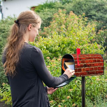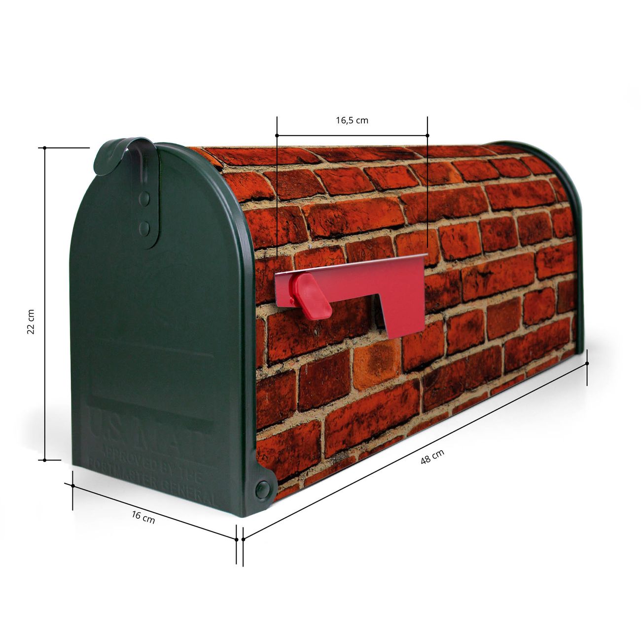 Der amerikanische Briefkasten von banjado mit Ziegelwand Motiv bietet Ihnen ausreichend Fassungsvermögen, um große A4 Sendungen und Zeitschriften zu empfangen. Die typisch amerikanische rote Fahne zeigt Ihnen an, wenn Sie Post erhalten haben. Die US-Mailbox besteht aus verzinktem Stahlblech welches lackiert wurde und ist 48 x 22 x 16 CM (BxHxT) groß. Die Folie mit Motiv Ziegelwand besteht aus einer wetter- und UV-resistenten Folie, die mit einem Schutzlaminat überzogen ist, sodass die US Mailbox zusätzlich vor Kratzern geschützt ist. An der Unterkante sind 4 Löcher je Seite um die Mailbox, typisch amerikanisch, an einem Holzpfahl oder einem Zaun zu befestigen. Auf Wunsch können Sie bei uns den passenden Standfuß oder die passende Wandhalterung kaufen um die US-Mailbox sicher zu befestigen. Wir bieten Ihnen ebenfalls Namensschilder, bereits beschriftet oder frei zu beschriften, und verschiedene selbst gestaltete Bitte-Keine-Werbung-Aufkleber.
