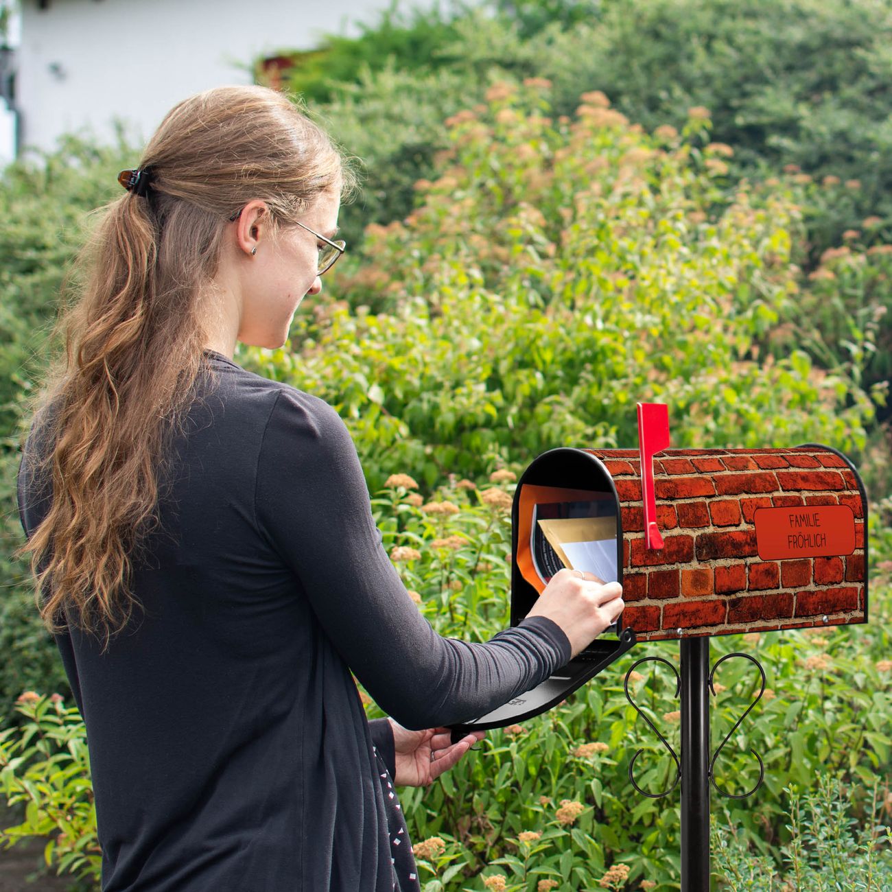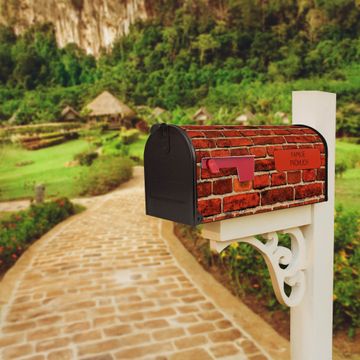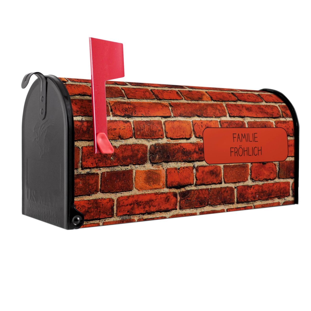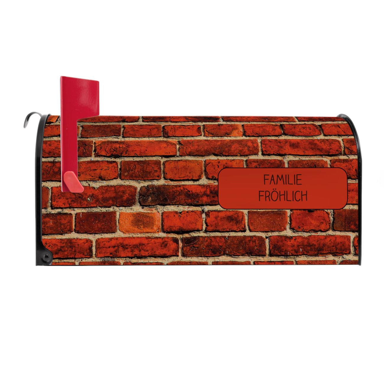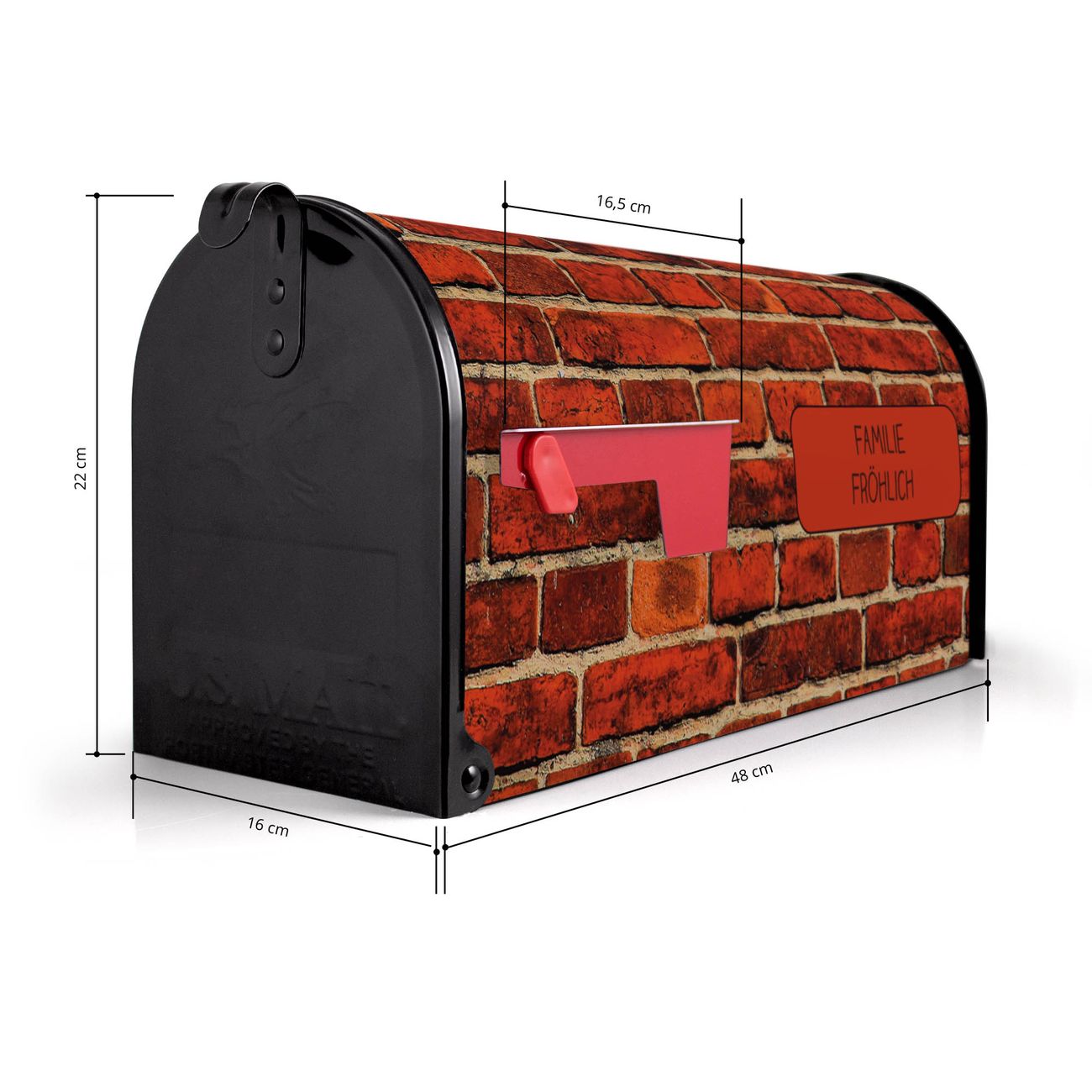 Der amerikanische Briefkasten von banjado mit Ziegelwand Motiv bietet Ihnen ausreichend Fassungsvermögen, um große A4 Sendungen und Zeitschriften zu empfangen. Die typisch amerikanische rote Fahne zeigt Ihnen an, wenn Sie Post erhalten haben. Die US-Mailbox besteht aus verzinktem Stahlblech welches lackiert wurde und ist 48 x 22 x 16 CM (BxHxT) groß. Die Folie mit Motiv Ziegelwand besteht aus einer wetter- und UV-resistenten Folie, die mit einem Schutzlaminat überzogen ist, sodass die US Mailbox zusätzlich vor Kratzern geschützt ist. An der Unterkante sind 4 Löcher je Seite um die Mailbox, typisch amerikanisch, an einem Holzpfahl oder einem Zaun zu befestigen. Auf Wunsch können Sie bei uns den passenden Standfuß oder die passende Wandhalterung kaufen um die US-Mailbox sicher zu befestigen. Wir bieten Ihnen ebenfalls Namensschilder, bereits beschriftet oder frei zu beschriften, und verschiedene selbst gestaltete Bitte-Keine-Werbung-Aufkleber.