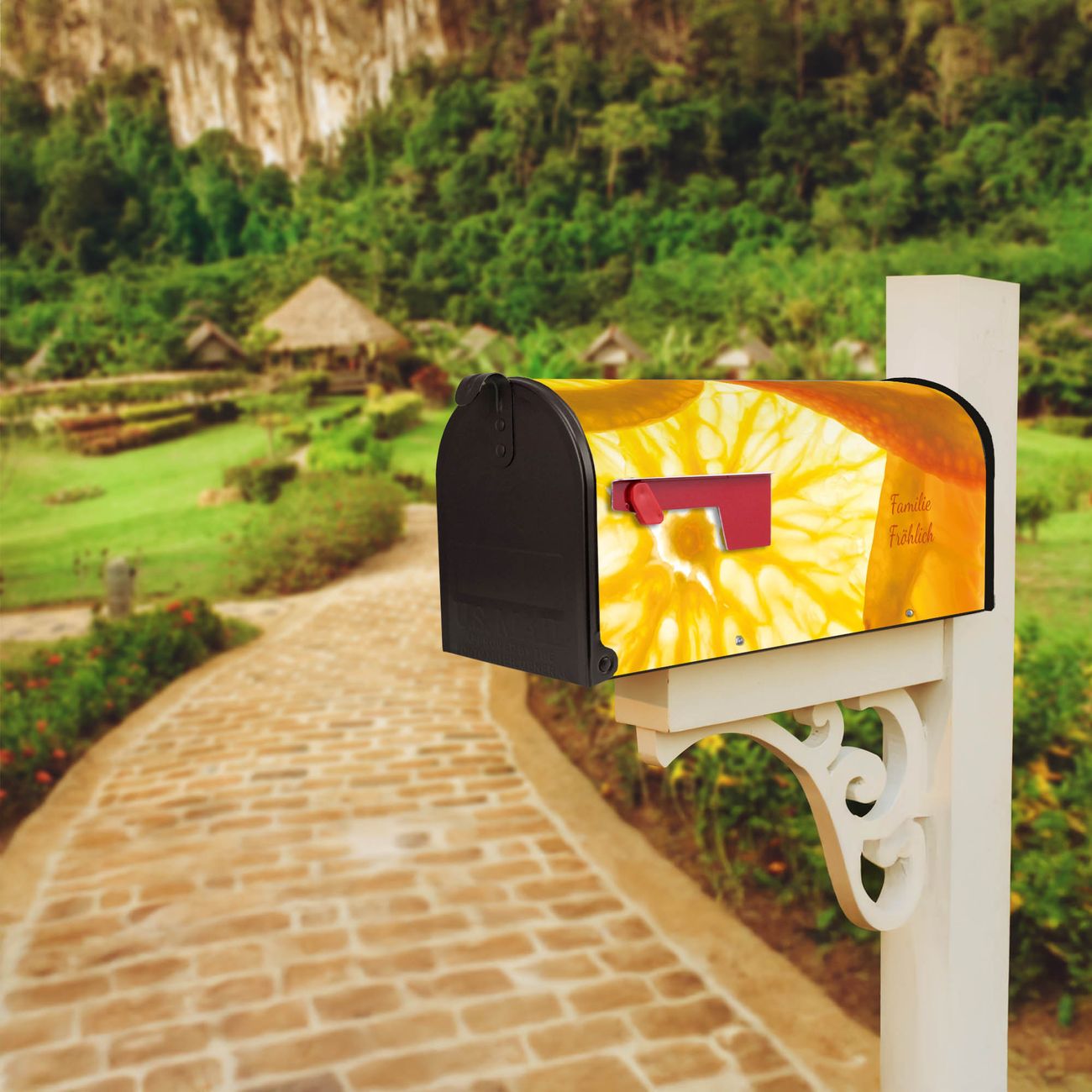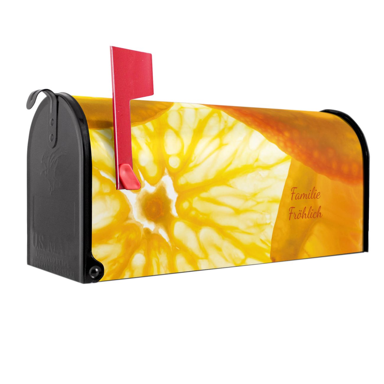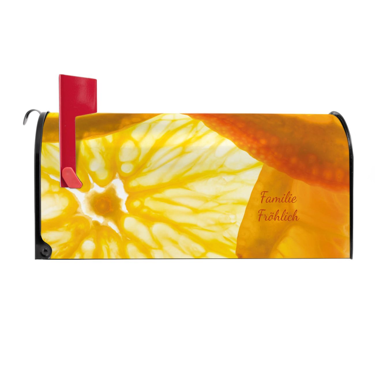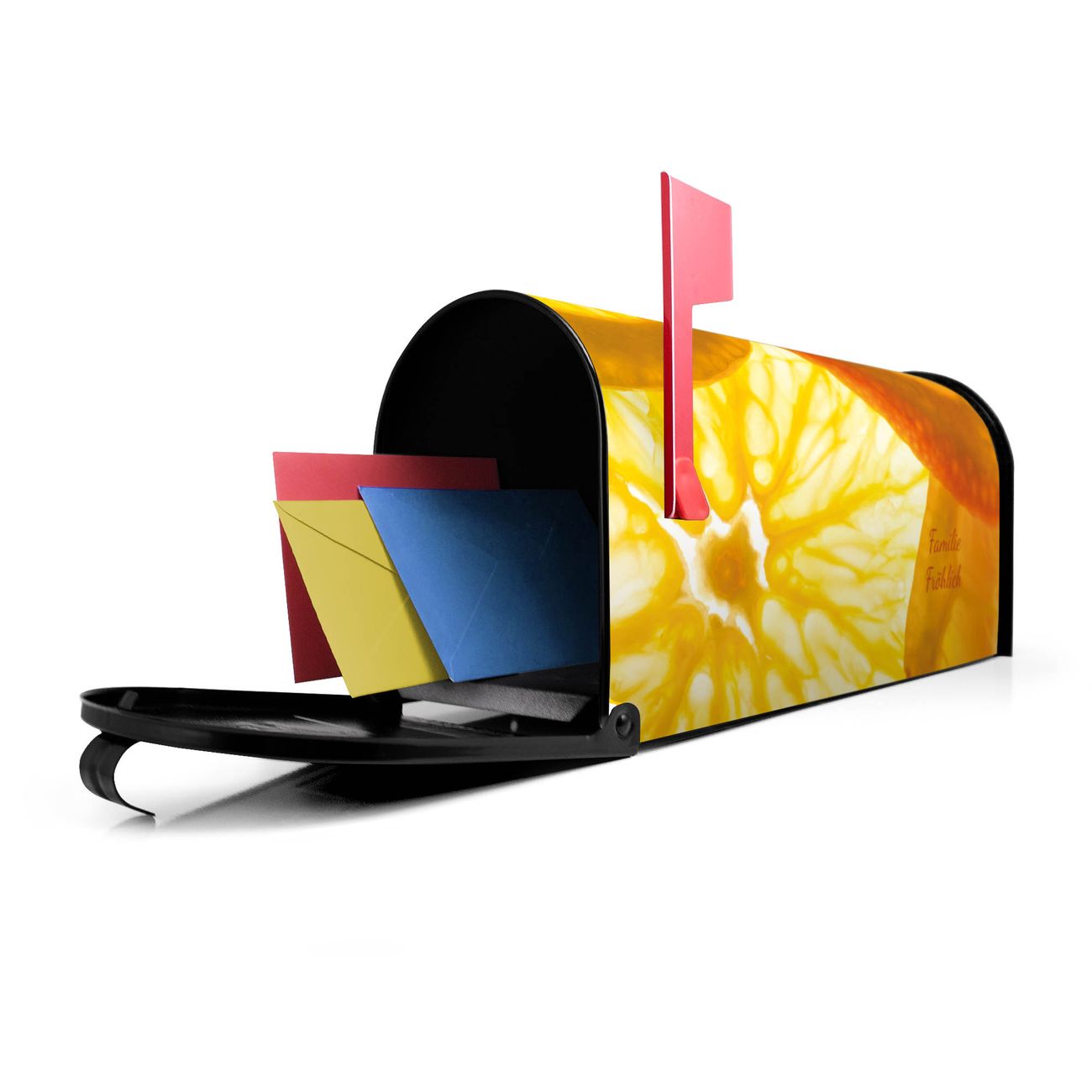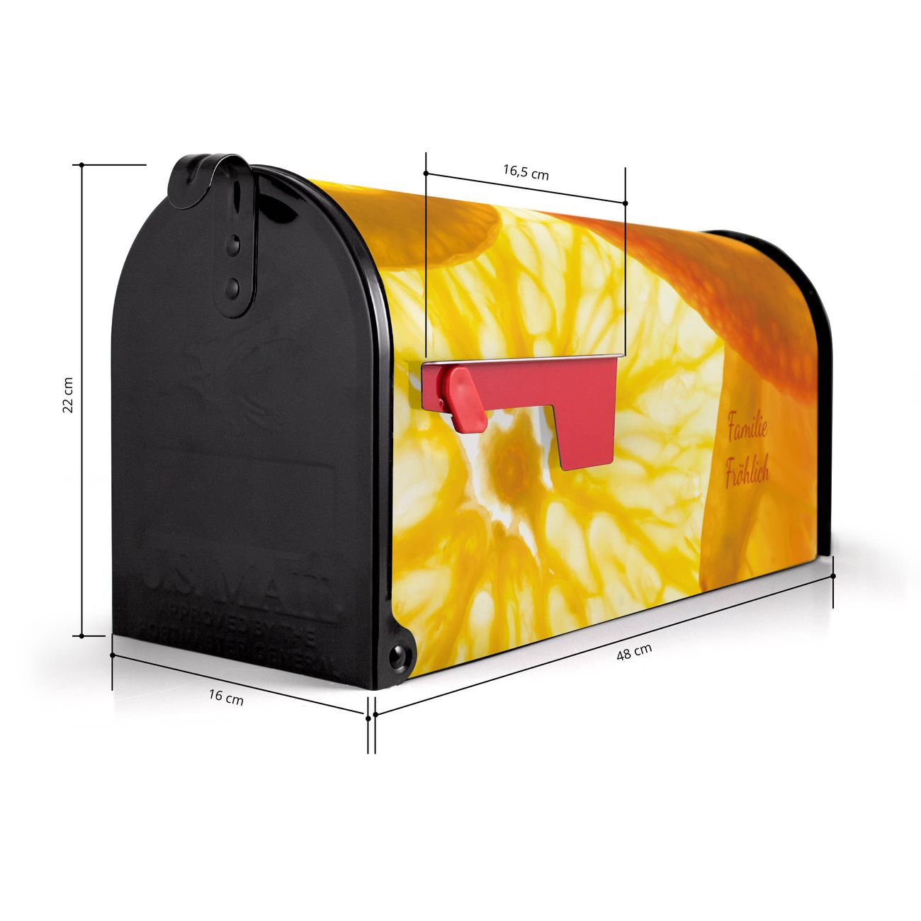 Der amerikanische Briefkasten von banjado mit Zitrusfrüchte Motiv bietet Ihnen ausreichend Fassungsvermögen, um große A4 Sendungen und Zeitschriften zu empfangen. Die typisch amerikanische rote Fahne zeigt Ihnen an, wenn Sie Post erhalten haben. Die US-Mailbox besteht aus verzinktem Stahlblech welches lackiert wurde und ist 48 x 22 x 16 CM (BxHxT) groß. Die Folie mit Motiv Zitrusfrüchte besteht aus einer wetter- und UV-resistenten Folie, die mit einem Schutzlaminat überzogen ist, sodass die US Mailbox zusätzlich vor Kratzern geschützt ist. An der Unterkante sind 4 Löcher je Seite um die Mailbox, typisch amerikanisch, an einem Holzpfahl oder einem Zaun zu befestigen. Auf Wunsch können Sie bei uns den passenden Standfuß oder die passende Wandhalterung kaufen um die US-Mailbox sicher zu befestigen. Wir bieten Ihnen ebenfalls Namensschilder, bereits beschriftet oder frei zu beschriften, und verschiedene selbst gestaltete Bitte-Keine-Werbung-Aufkleber.