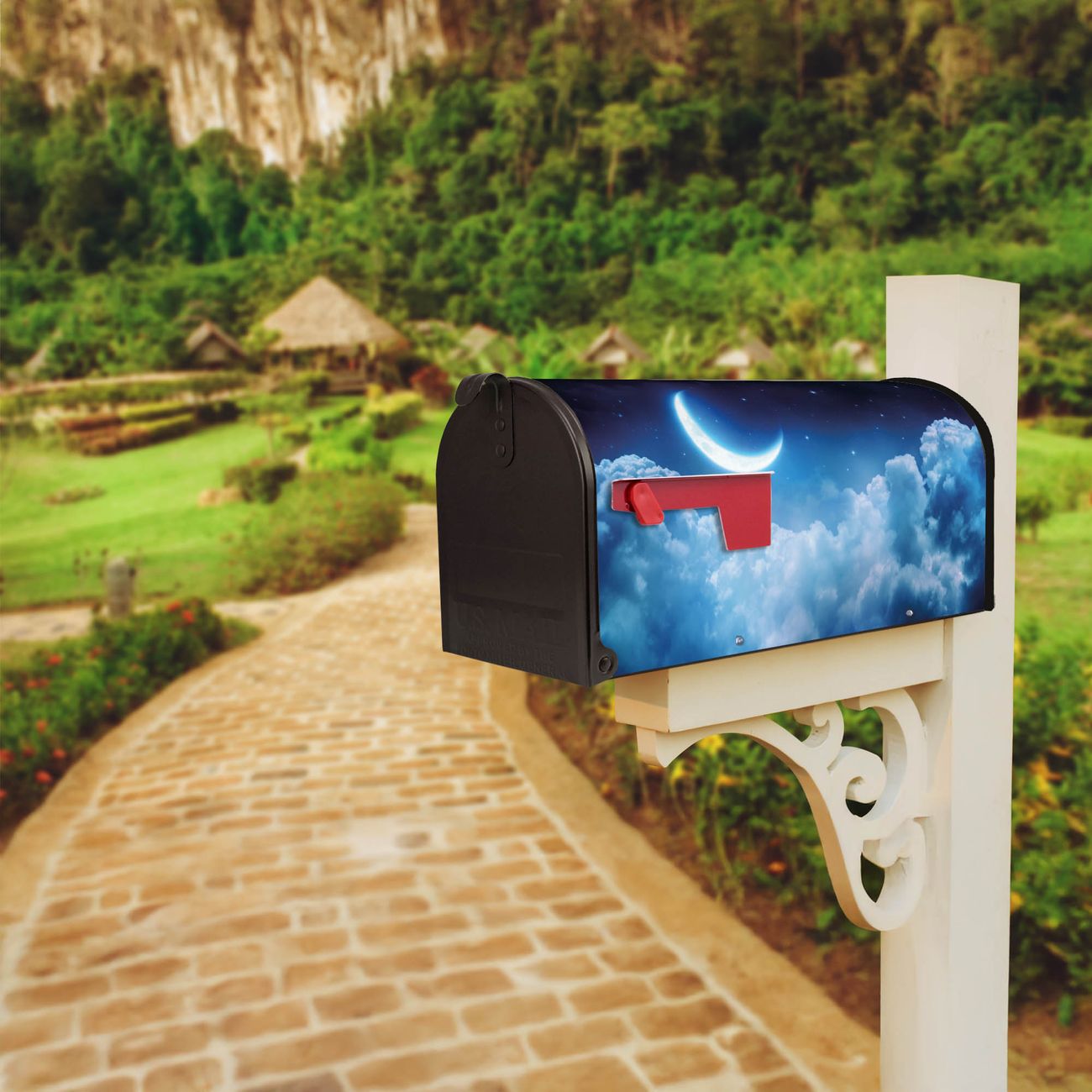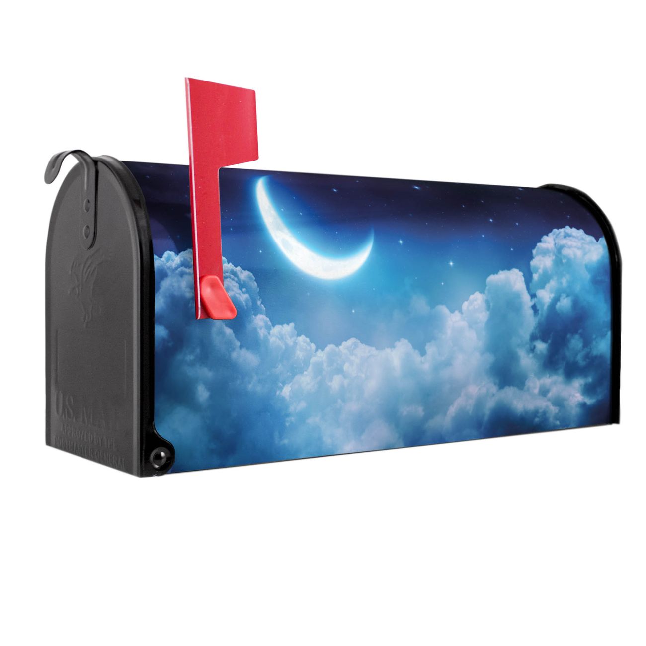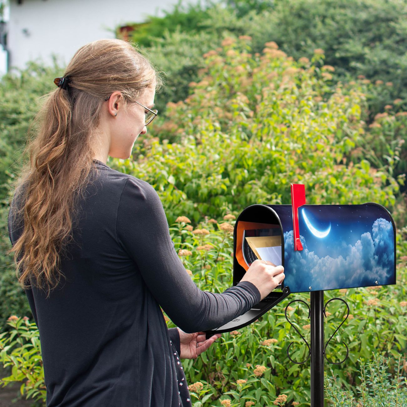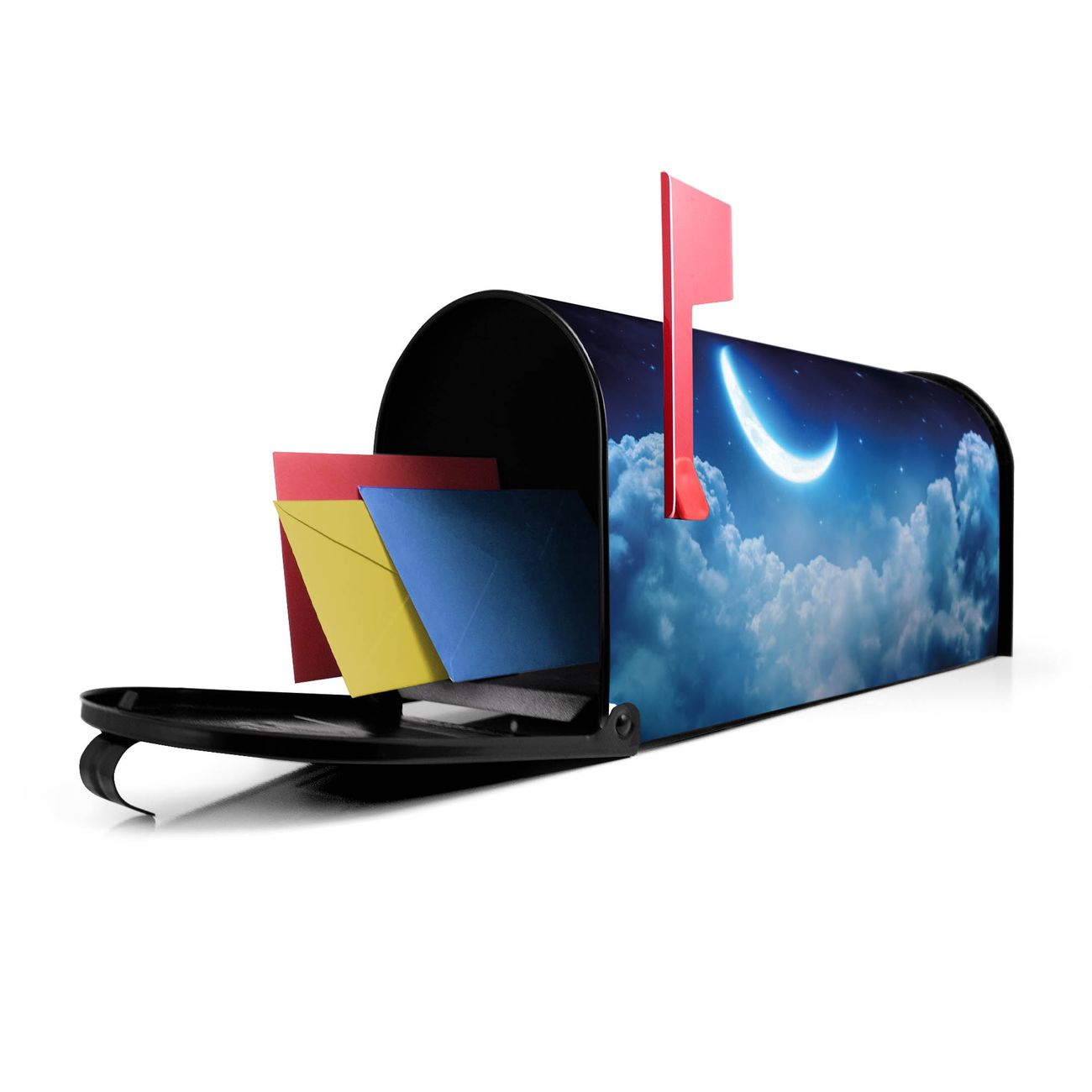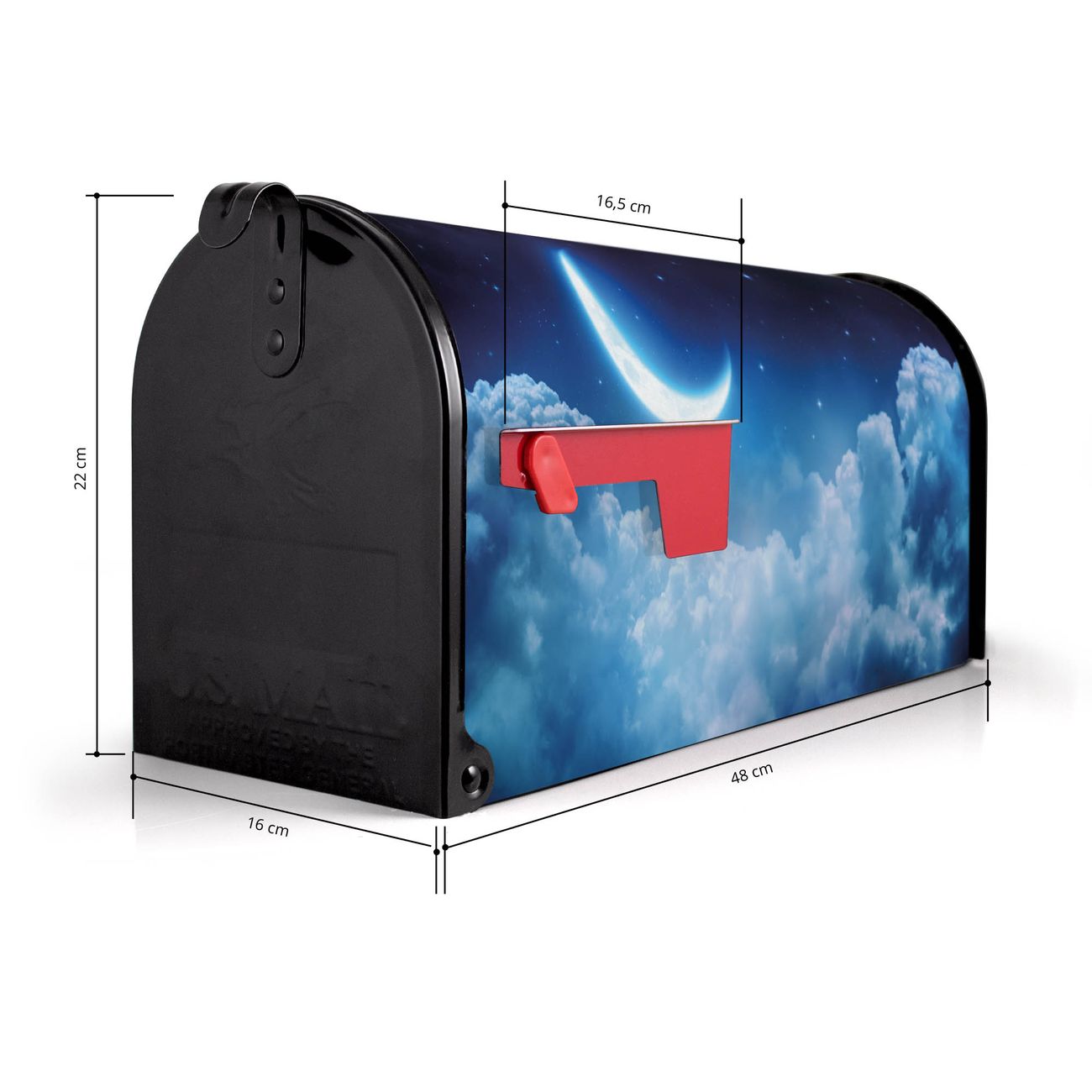 Der amerikanische Briefkasten von banjado mit zunehmender Mond Motiv bietet Ihnen ausreichend Fassungsvermögen, um große A4 Sendungen und Zeitschriften zu empfangen. Die typisch amerikanische rote Fahne zeigt Ihnen an, wenn Sie Post erhalten haben. Die US-Mailbox besteht aus verzinktem Stahlblech welches lackiert wurde und ist 48 x 22 x 16 CM (BxHxT) groß. Die Folie mit Motiv zunehmender Mond besteht aus einer wetter- und UV-resistenten Folie, die mit einem Schutzlaminat überzogen ist, sodass die US Mailbox zusätzlich vor Kratzern geschützt ist. An der Unterkante sind 4 Löcher je Seite um die Mailbox, typisch amerikanisch, an einem Holzpfahl oder einem Zaun zu befestigen. Auf Wunsch können Sie bei uns den passenden Standfuß oder die passende Wandhalterung kaufen um die US-Mailbox sicher zu befestigen. Wir bieten Ihnen ebenfalls Namensschilder, bereits beschriftet oder frei zu beschriften, und verschiedene selbst gestaltete Bitte-Keine-Werbung-Aufkleber.