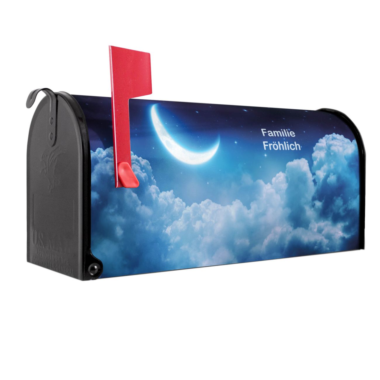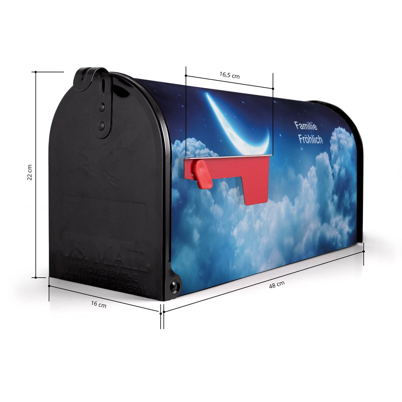 Der amerikanische Briefkasten von banjado mit zunehmender Mond Motiv bietet Ihnen ausreichend Fassungsvermögen, um große A4 Sendungen und Zeitschriften zu empfangen. Die typisch amerikanische rote Fahne zeigt Ihnen an, wenn Sie Post erhalten haben. Die US-Mailbox besteht aus verzinktem Stahlblech welches lackiert wurde und ist 48 x 22 x 16 CM (BxHxT) groß. Die Folie mit Motiv zunehmender Mond besteht aus einer wetter- und UV-resistenten Folie, die mit einem Schutzlaminat überzogen ist, sodass die US Mailbox zusätzlich vor Kratzern geschützt ist. An der Unterkante sind 4 Löcher je Seite um die Mailbox, typisch amerikanisch, an einem Holzpfahl oder einem Zaun zu befestigen. Auf Wunsch können Sie bei uns den passenden Standfuß oder die passende Wandhalterung kaufen um die US-Mailbox sicher zu befestigen. Wir bieten Ihnen ebenfalls Namensschilder, bereits beschriftet oder frei zu beschriften, und verschiedene selbst gestaltete Bitte-Keine-Werbung-Aufkleber.