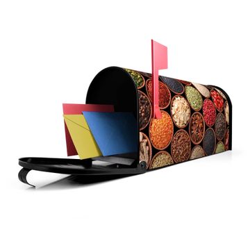 Der amerikanische Briefkasten von banjado mit Zutaten Motiv bietet Ihnen ausreichend Fassungsvermögen, um große A4 Sendungen und Zeitschriften zu empfangen. Die typisch amerikanische rote Fahne zeigt Ihnen an, wenn Sie Post erhalten haben. Die US-Mailbox besteht aus verzinktem Stahlblech welches lackiert wurde und ist 48 x 22 x 16 CM (BxHxT) groß. Die Folie mit Motiv Zutaten besteht aus einer wetter- und UV-resistenten Folie, die mit einem Schutzlaminat überzogen ist, sodass die US Mailbox zusätzlich vor Kratzern geschützt ist. An der Unterkante sind 4 Löcher je Seite um die Mailbox, typisch amerikanisch, an einem Holzpfahl oder einem Zaun zu befestigen. Auf Wunsch können Sie bei uns den passenden Standfuß oder die passende Wandhalterung kaufen um die US-Mailbox sicher zu befestigen. Wir bieten Ihnen ebenfalls Namensschilder, bereits beschriftet oder frei zu beschriften, und verschiedene selbst gestaltete Bitte-Keine-Werbung-Aufkleber.