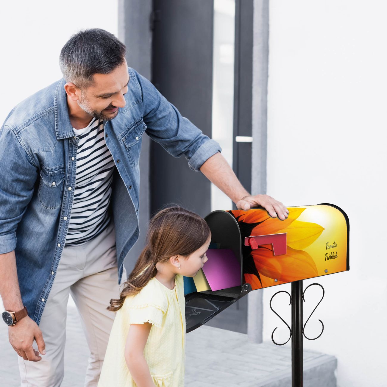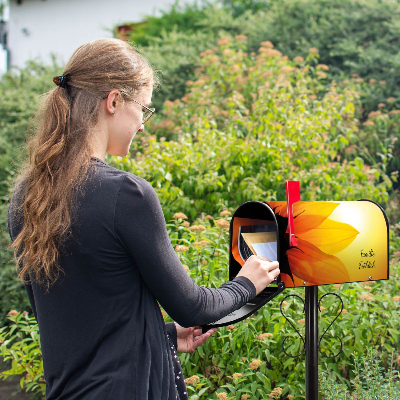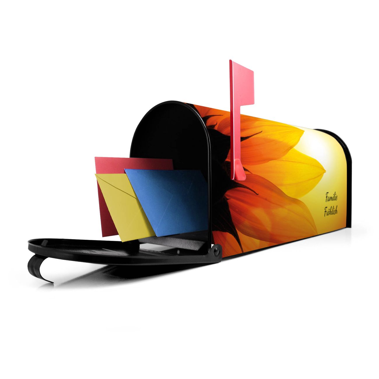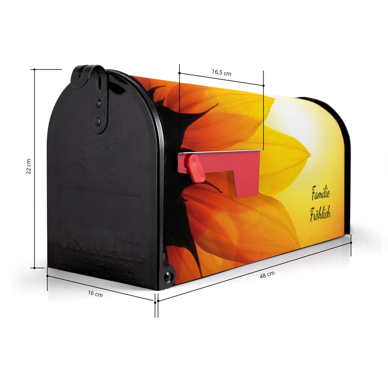 Der amerikanische Briefkasten von banjado mit Zwei Sonnen Motiv bietet Ihnen ausreichend Fassungsvermögen, um große A4 Sendungen und Zeitschriften zu empfangen. Die typisch amerikanische rote Fahne zeigt Ihnen an, wenn Sie Post erhalten haben. Die US-Mailbox besteht aus verzinktem Stahlblech welches lackiert wurde und ist 48 x 22 x 16 CM (BxHxT) groß. Die Folie mit Motiv Zwei Sonnen besteht aus einer wetter- und UV-resistenten Folie, die mit einem Schutzlaminat überzogen ist, sodass die US Mailbox zusätzlich vor Kratzern geschützt ist. An der Unterkante sind 4 Löcher je Seite um die Mailbox, typisch amerikanisch, an einem Holzpfahl oder einem Zaun zu befestigen. Auf Wunsch können Sie bei uns den passenden Standfuß oder die passende Wandhalterung kaufen um die US-Mailbox sicher zu befestigen. Wir bieten Ihnen ebenfalls Namensschilder, bereits beschriftet oder frei zu beschriften, und verschiedene selbst gestaltete Bitte-Keine-Werbung-Aufkleber.