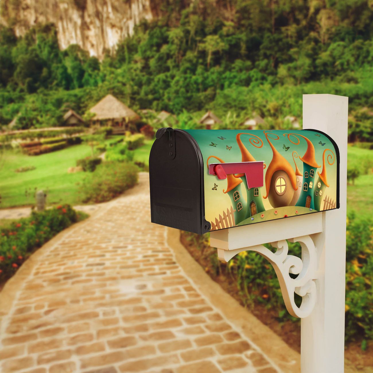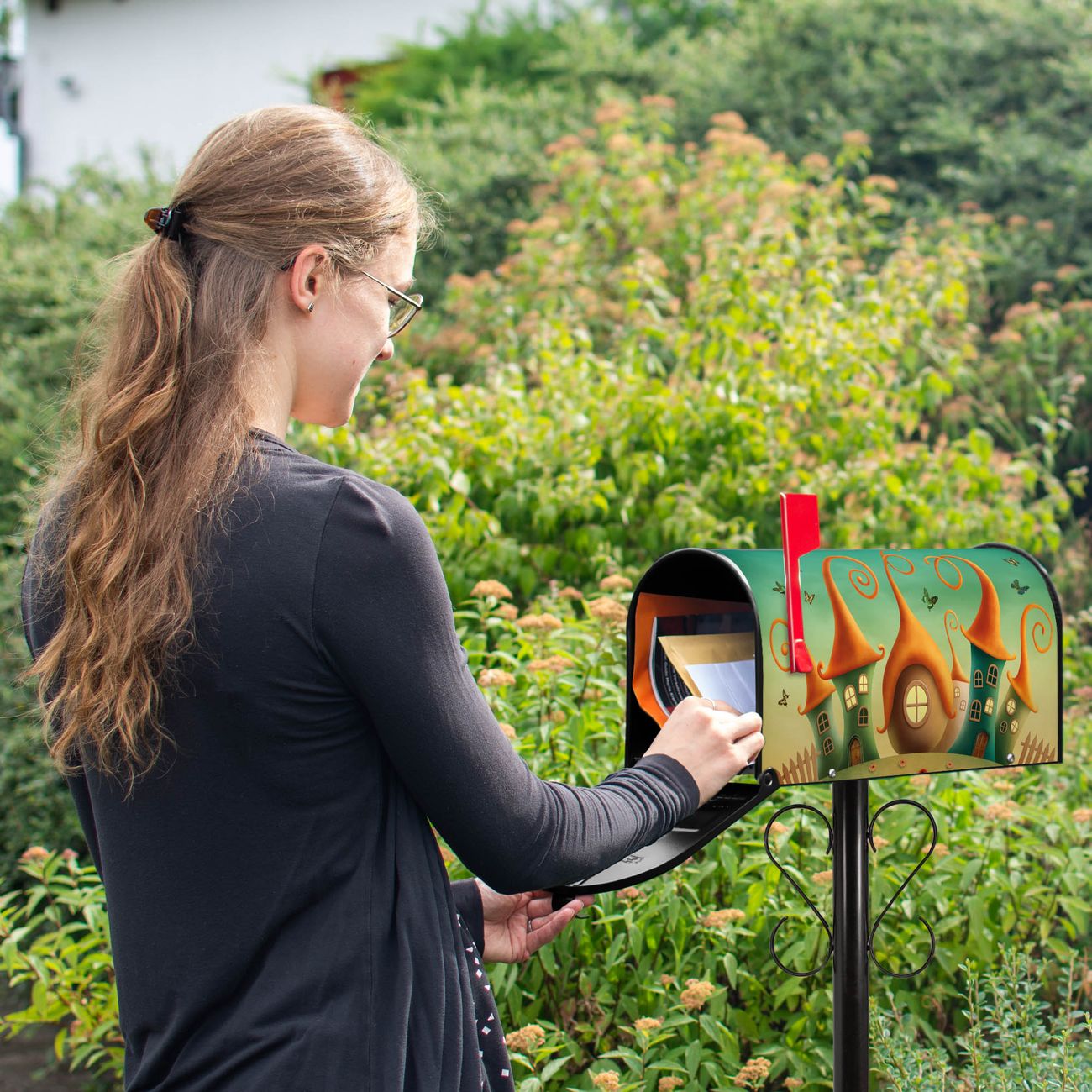 Der amerikanische Briefkasten von banjado mit Zwergenhausen Motiv bietet Ihnen ausreichend Fassungsvermögen, um große A4 Sendungen und Zeitschriften zu empfangen. Die typisch amerikanische rote Fahne zeigt Ihnen an, wenn Sie Post erhalten haben. Die US-Mailbox besteht aus verzinktem Stahlblech welches lackiert wurde und ist 48 x 22 x 16 CM (BxHxT) groß. Die Folie mit Motiv Zwergenhausen besteht aus einer wetter- und UV-resistenten Folie, die mit einem Schutzlaminat überzogen ist, sodass die US Mailbox zusätzlich vor Kratzern geschützt ist. An der Unterkante sind 4 Löcher je Seite um die Mailbox, typisch amerikanisch, an einem Holzpfahl oder einem Zaun zu befestigen. Auf Wunsch können Sie bei uns den passenden Standfuß oder die passende Wandhalterung kaufen um die US-Mailbox sicher zu befestigen. Wir bieten Ihnen ebenfalls Namensschilder, bereits beschriftet oder frei zu beschriften, und verschiedene selbst gestaltete Bitte-Keine-Werbung-Aufkleber.