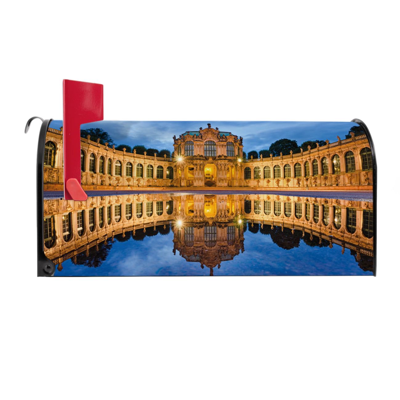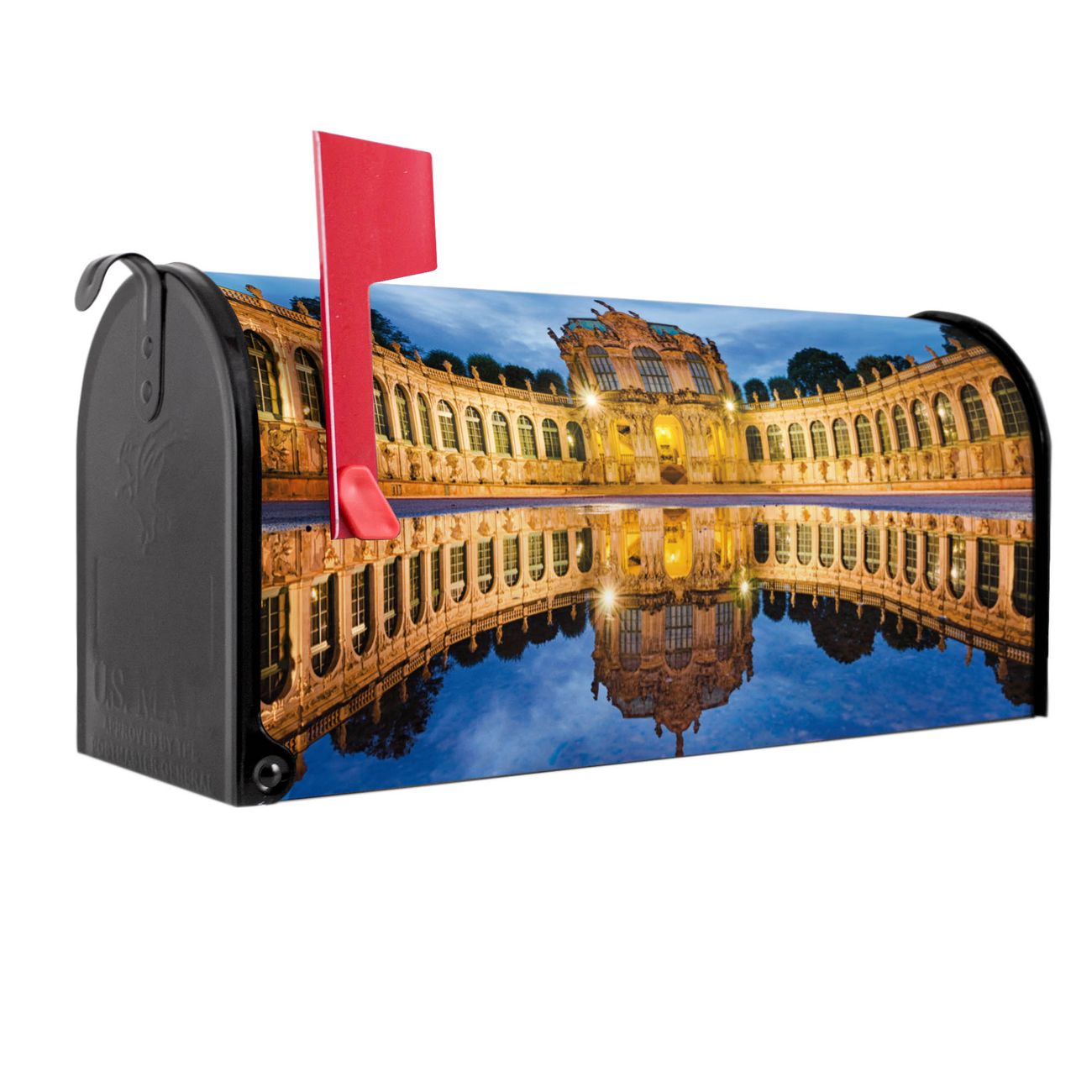 Unser amerikanischer Briefkasten mit dem Motiv Zwinger Dresden hat ein sehr ansprechendes und ausgefallenes Design, ist in der Grundfarbe weiß, grün oder schwarz erhältlich. Damit entlocken Sie Ihren Nachbarn und dem Postboten immer wieder ein Lächeln. Die Mailbox ist ein Original Import aus Mississippi USA und wird von unserer kleinen Manufaktur in Sachsen von Hand veredelt. Die US-Mailbox bietet ausreichend Platz auch für große Sendungen, eine Fahne die Ihnen Post anzeigt, wetterfestes und äußerst stabiles Material - so macht Post empfangen Freude.