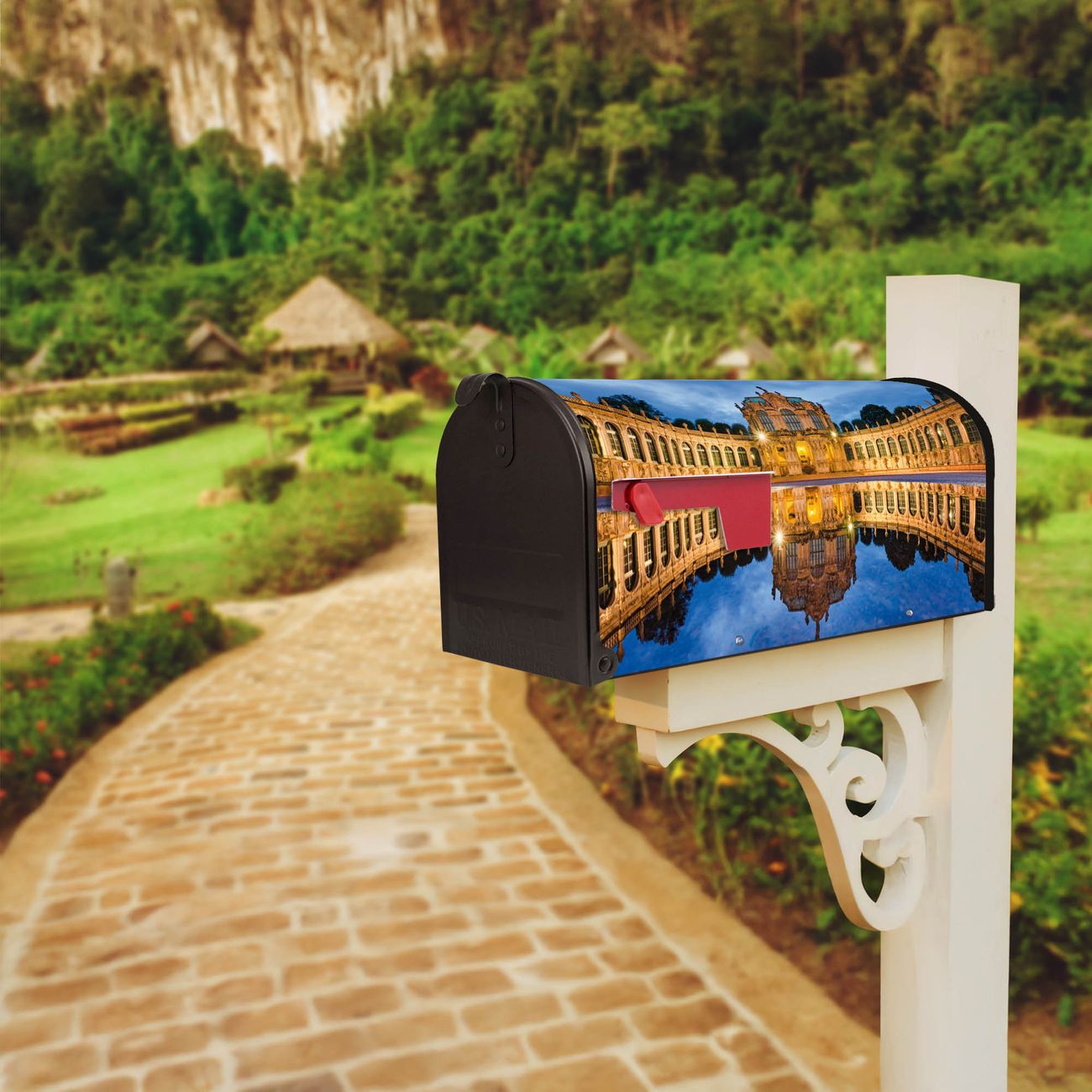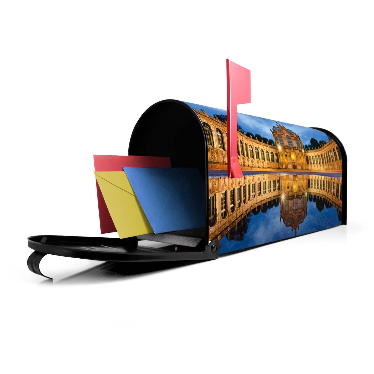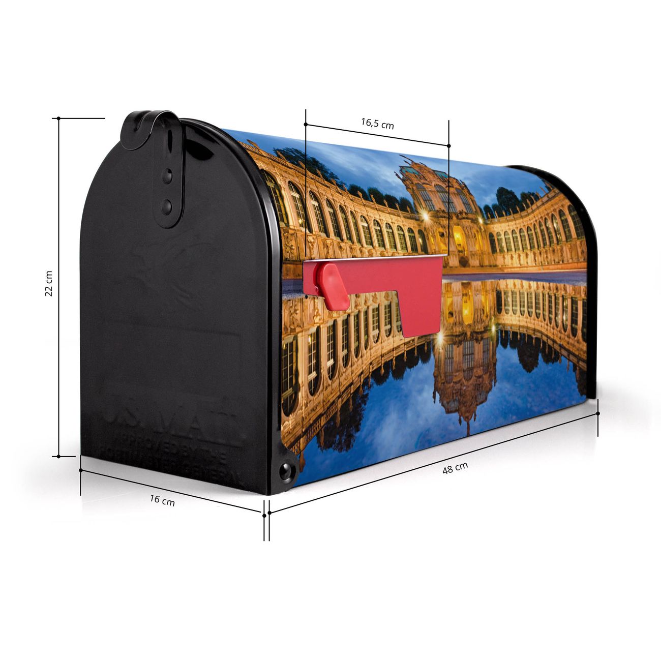 Der amerikanische Briefkasten von banjado mit Zwinger Dresden Motiv bietet Ihnen ausreichend Fassungsvermögen, um große A4 Sendungen und Zeitschriften zu empfangen. Die typisch amerikanische rote Fahne zeigt Ihnen an, wenn Sie Post erhalten haben. Die US-Mailbox besteht aus verzinktem Stahlblech welches lackiert wurde und ist 48 x 22 x 16 CM (BxHxT) groß. Die Folie mit Motiv Zwinger Dresden besteht aus einer wetter- und UV-resistenten Folie, die mit einem Schutzlaminat überzogen ist, sodass die US Mailbox zusätzlich vor Kratzern geschützt ist. An der Unterkante sind 4 Löcher je Seite um die Mailbox, typisch amerikanisch, an einem Holzpfahl oder einem Zaun zu befestigen. Auf Wunsch können Sie bei uns den passenden Standfuß oder die passende Wandhalterung kaufen um die US-Mailbox sicher zu befestigen. Wir bieten Ihnen ebenfalls Namensschilder, bereits beschriftet oder frei zu beschriften, und verschiedene selbst gestaltete Bitte-Keine-Werbung-Aufkleber.
