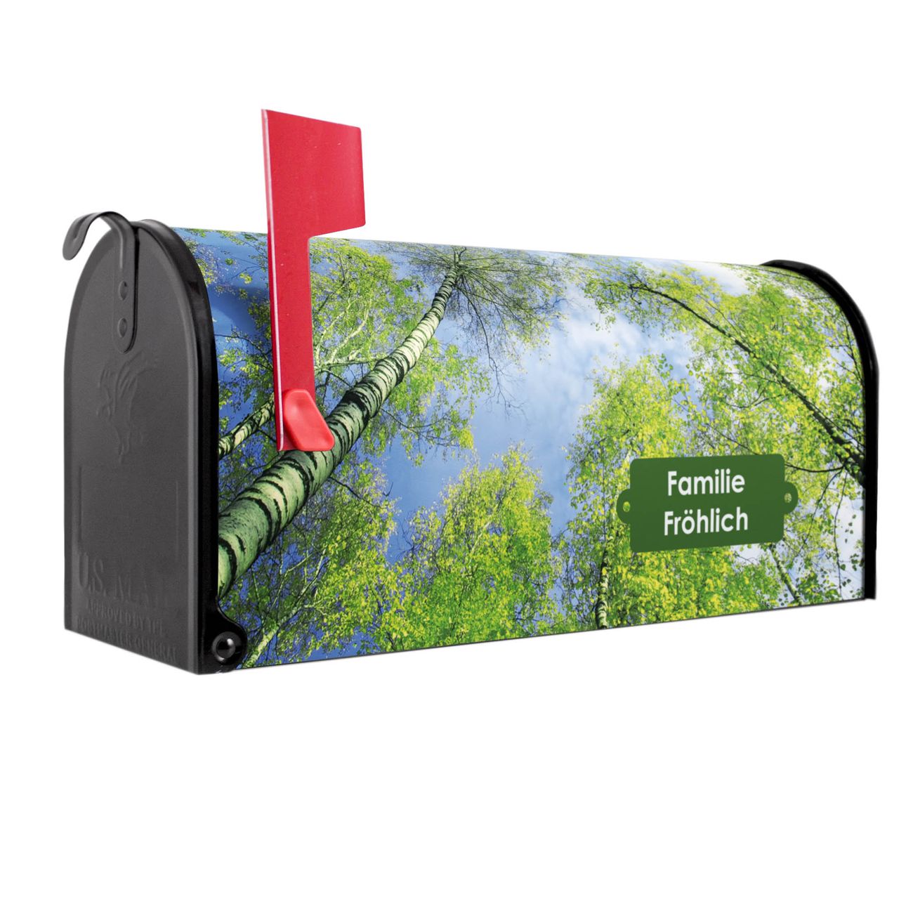 Der amerikanische Briefkasten von banjado mit Zwischen Bäumen 3 Motiv bietet Ihnen ausreichend Fassungsvermögen, um große A4 Sendungen und Zeitschriften zu empfangen. Die typisch amerikanische rote Fahne zeigt Ihnen an, wenn Sie Post erhalten haben. Die US-Mailbox besteht aus verzinktem Stahlblech welches lackiert wurde und ist 48 x 22 x 16 CM (BxHxT) groß. Die Folie mit Motiv Zwischen Bäumen 3 besteht aus einer wetter- und UV-resistenten Folie, die mit einem Schutzlaminat überzogen ist, sodass die US Mailbox zusätzlich vor Kratzern geschützt ist. An der Unterkante sind 4 Löcher je Seite um die Mailbox, typisch amerikanisch, an einem Holzpfahl oder einem Zaun zu befestigen. Auf Wunsch können Sie bei uns den passenden Standfuß oder die passende Wandhalterung kaufen um die US-Mailbox sicher zu befestigen. Wir bieten Ihnen ebenfalls Namensschilder, bereits beschriftet oder frei zu beschriften, und verschiedene selbst gestaltete Bitte-Keine-Werbung-Aufkleber.