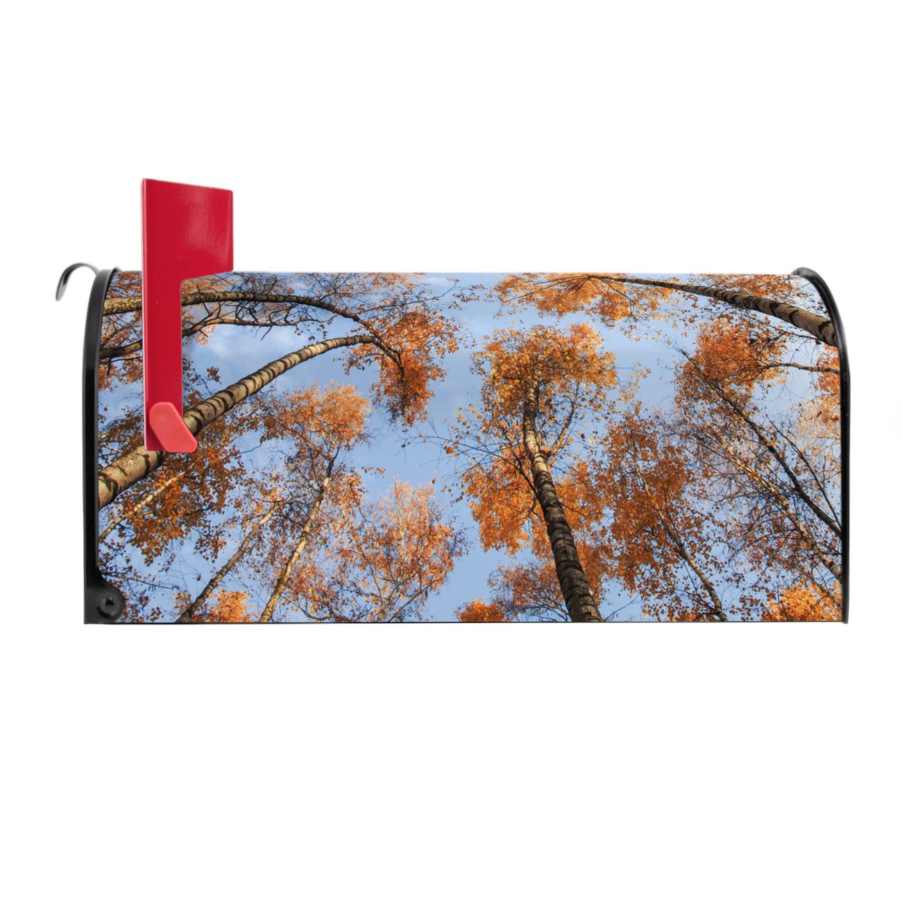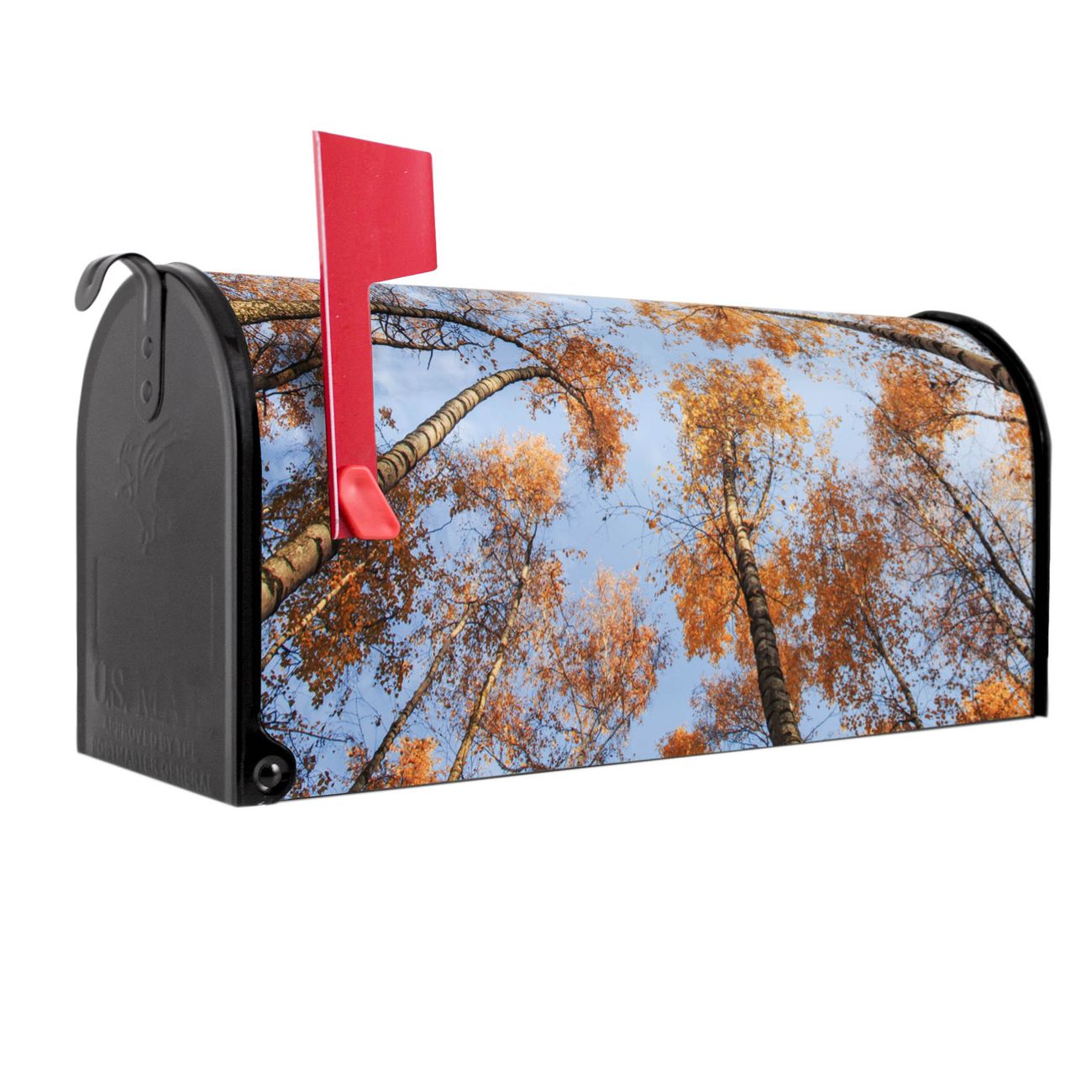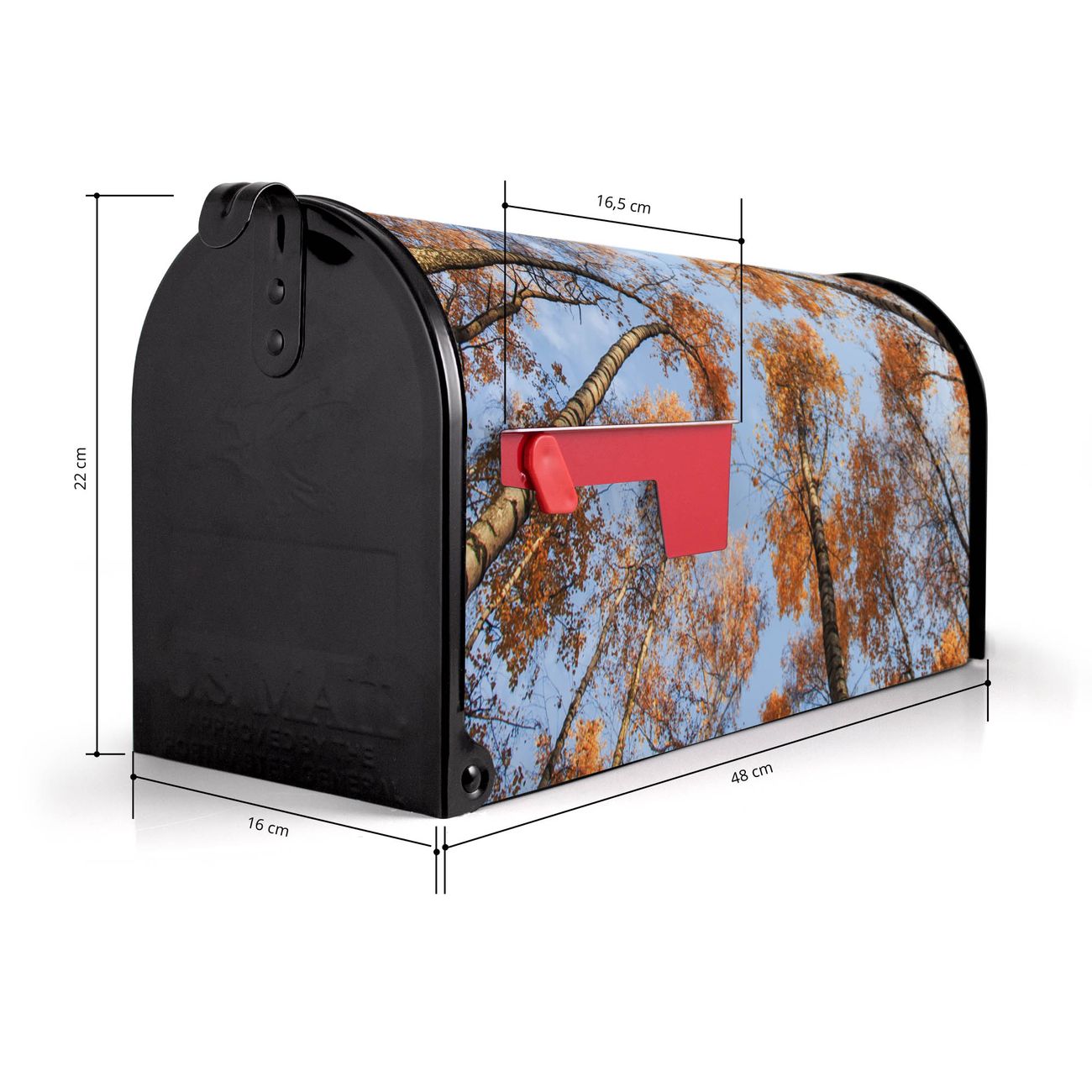 Der amerikanische Briefkasten von banjado mit Zwischen Bäumen 4 Motiv bietet Ihnen ausreichend Fassungsvermögen, um große A4 Sendungen und Zeitschriften zu empfangen. Die typisch amerikanische rote Fahne zeigt Ihnen an, wenn Sie Post erhalten haben. Die US-Mailbox besteht aus verzinktem Stahlblech welches lackiert wurde und ist 48 x 22 x 16 CM (BxHxT) groß. Die Folie mit Motiv Zwischen Bäumen 4 besteht aus einer wetter- und UV-resistenten Folie, die mit einem Schutzlaminat überzogen ist, sodass die US Mailbox zusätzlich vor Kratzern geschützt ist. An der Unterkante sind 4 Löcher je Seite um die Mailbox, typisch amerikanisch, an einem Holzpfahl oder einem Zaun zu befestigen. Auf Wunsch können Sie bei uns den passenden Standfuß oder die passende Wandhalterung kaufen um die US-Mailbox sicher zu befestigen. Wir bieten Ihnen ebenfalls Namensschilder, bereits beschriftet oder frei zu beschriften, und verschiedene selbst gestaltete Bitte-Keine-Werbung-Aufkleber.
