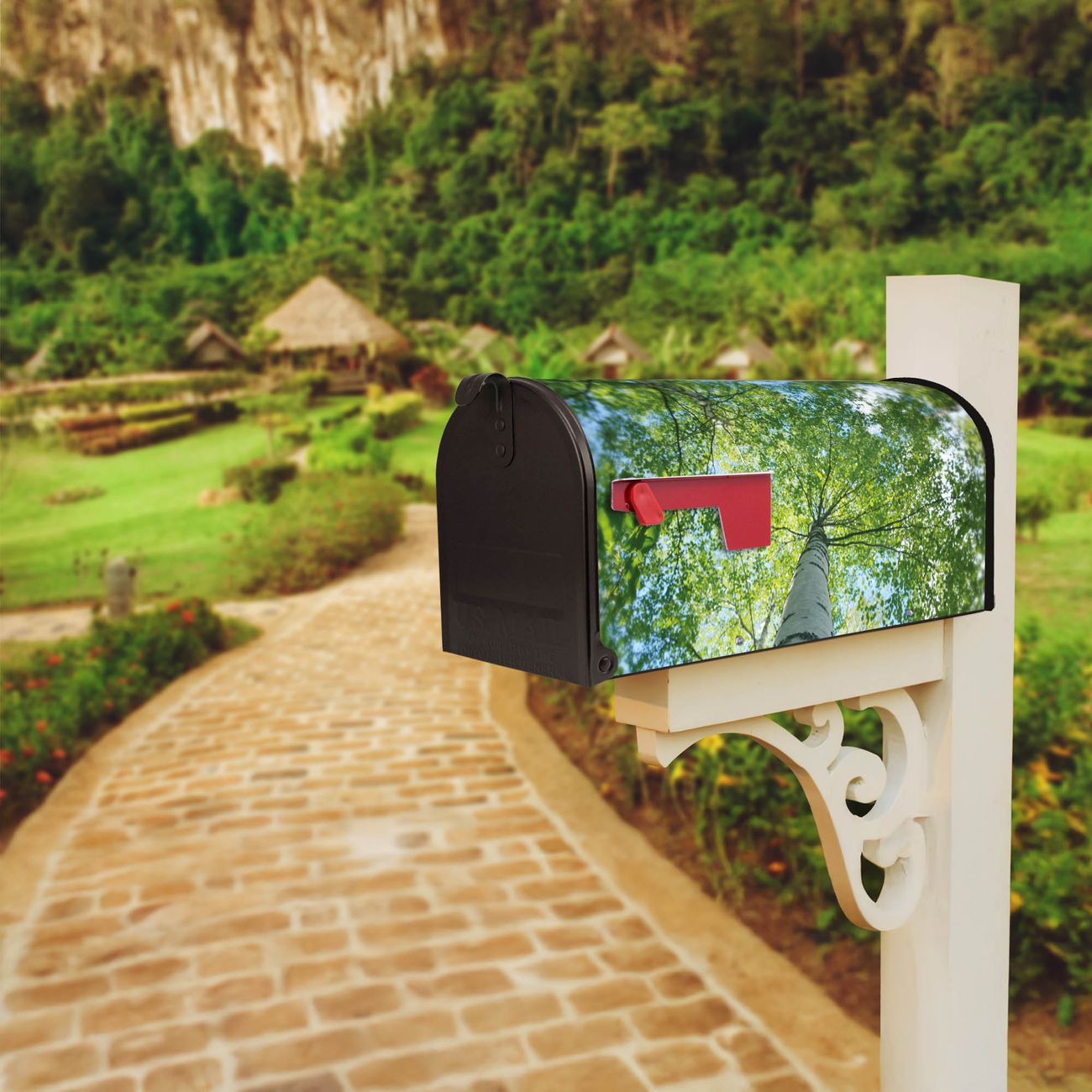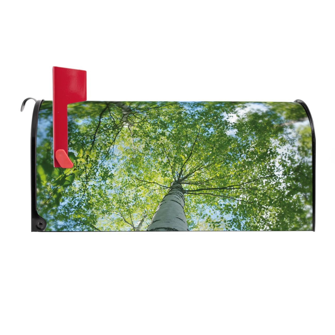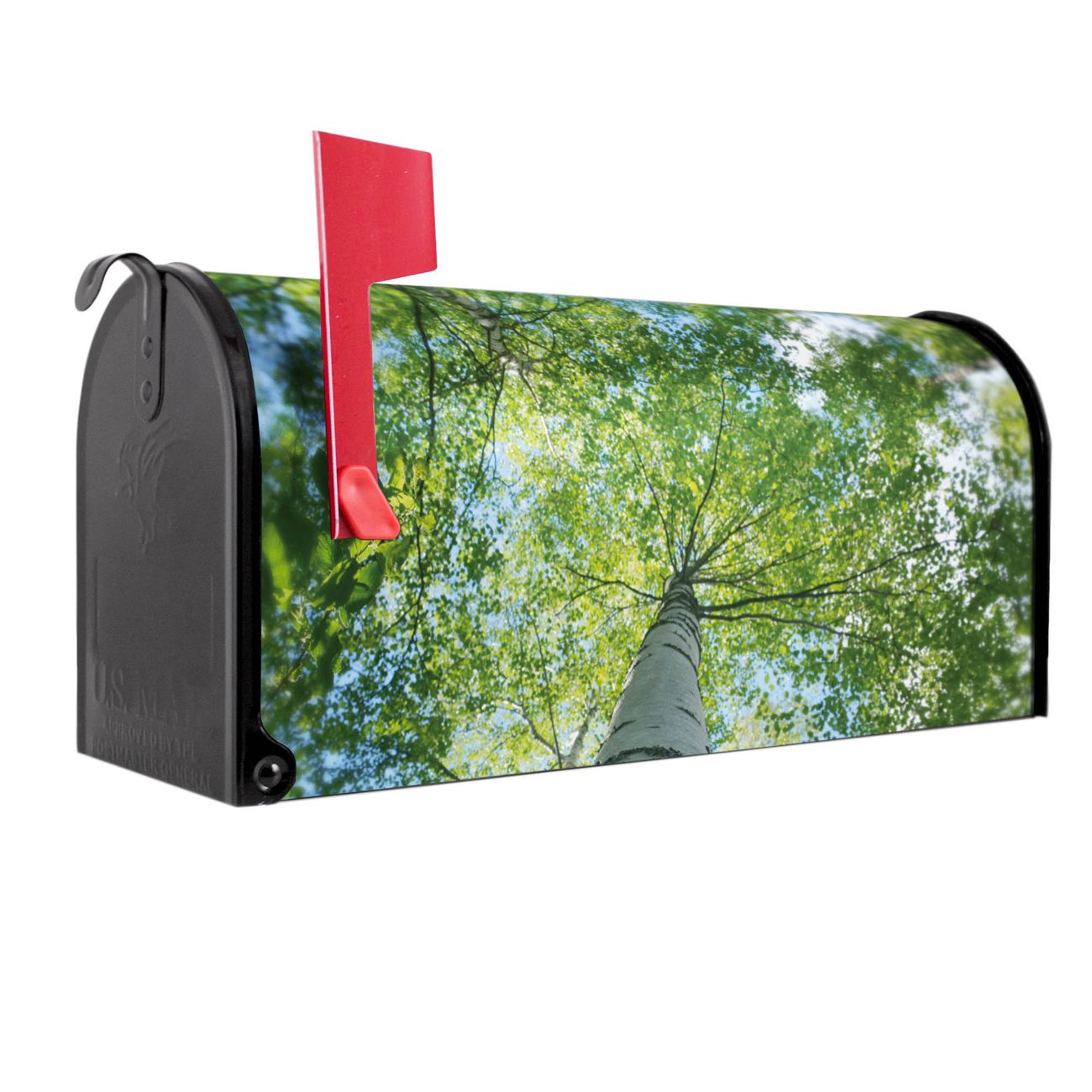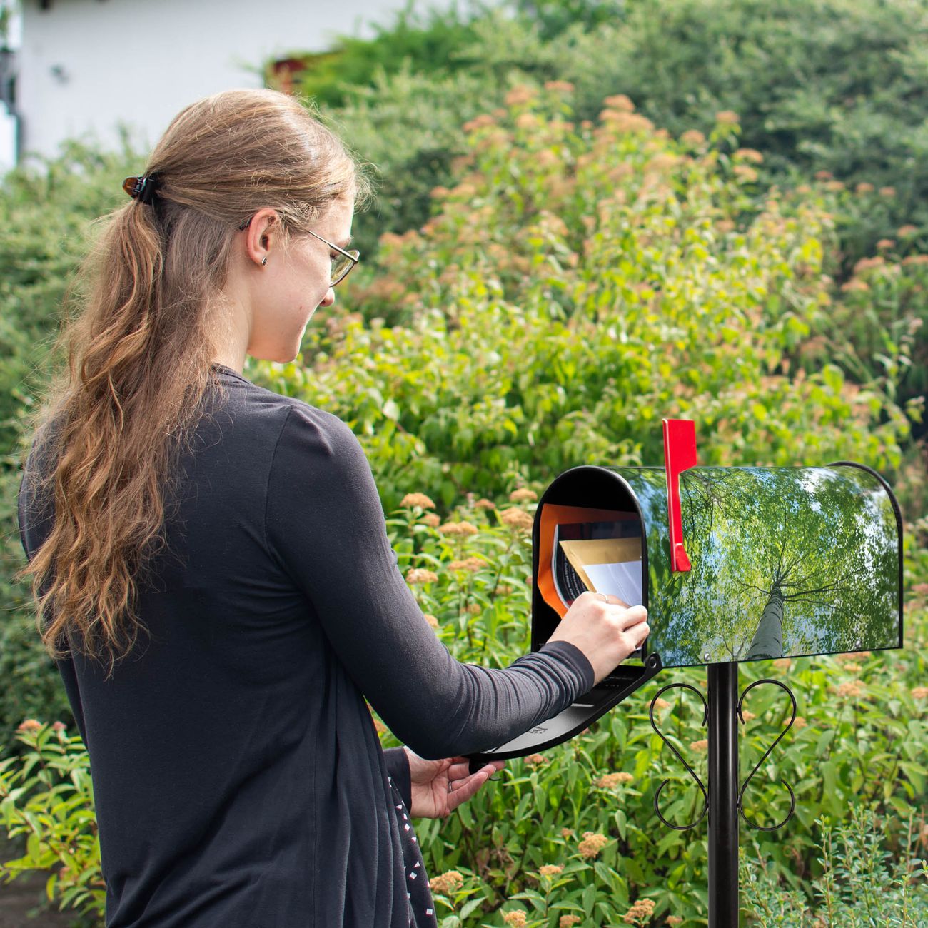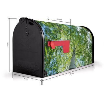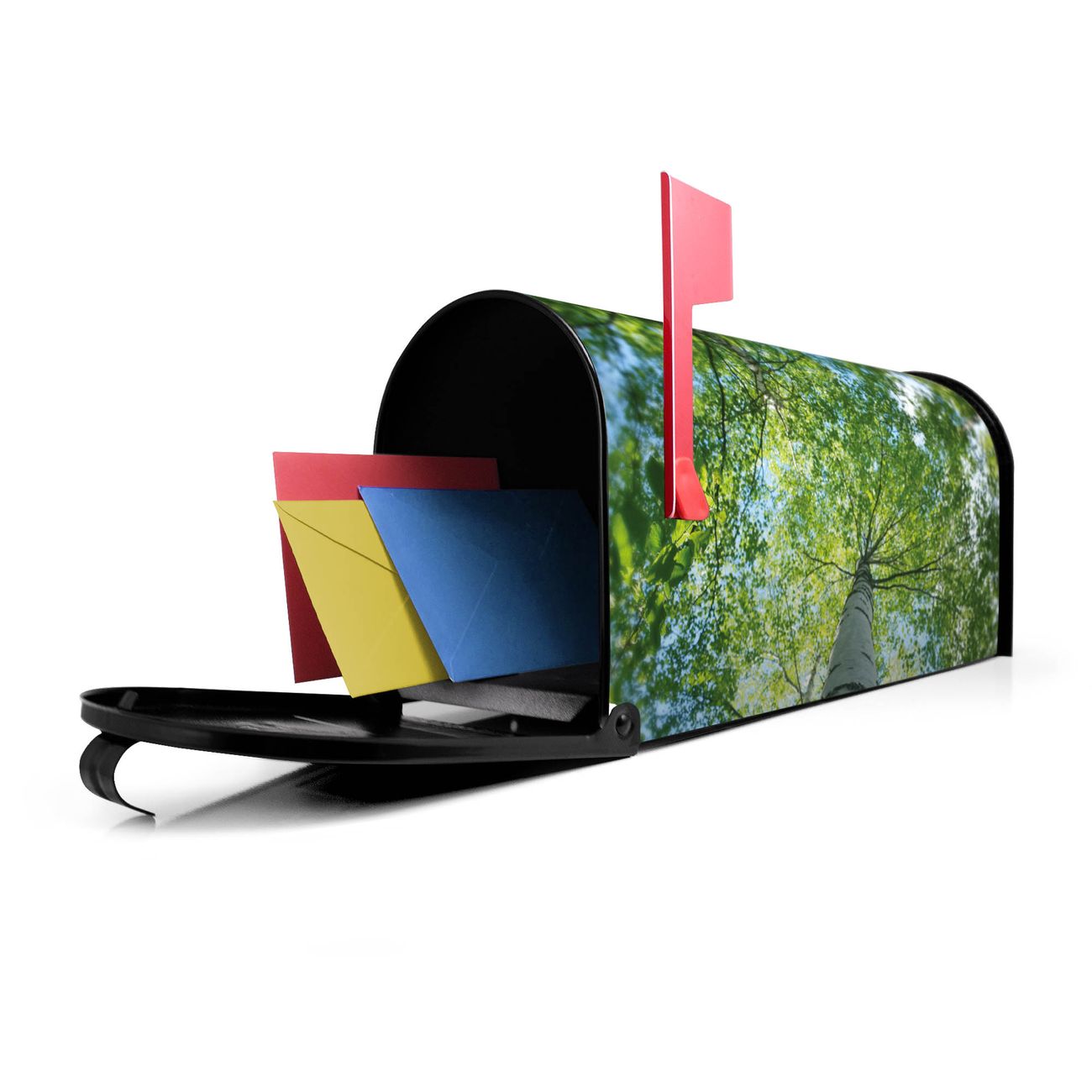 Der amerikanische Briefkasten von banjado mit Zwischen Bäumen 5 Motiv bietet Ihnen ausreichend Fassungsvermögen, um große A4 Sendungen und Zeitschriften zu empfangen. Die typisch amerikanische rote Fahne zeigt Ihnen an, wenn Sie Post erhalten haben. Die US-Mailbox besteht aus verzinktem Stahlblech welches lackiert wurde und ist 48 x 22 x 16 CM (BxHxT) groß. Die Folie mit Motiv Zwischen Bäumen 5 besteht aus einer wetter- und UV-resistenten Folie, die mit einem Schutzlaminat überzogen ist, sodass die US Mailbox zusätzlich vor Kratzern geschützt ist. An der Unterkante sind 4 Löcher je Seite um die Mailbox, typisch amerikanisch, an einem Holzpfahl oder einem Zaun zu befestigen. Auf Wunsch können Sie bei uns den passenden Standfuß oder die passende Wandhalterung kaufen um die US-Mailbox sicher zu befestigen. Wir bieten Ihnen ebenfalls Namensschilder, bereits beschriftet oder frei zu beschriften, und verschiedene selbst gestaltete Bitte-Keine-Werbung-Aufkleber.