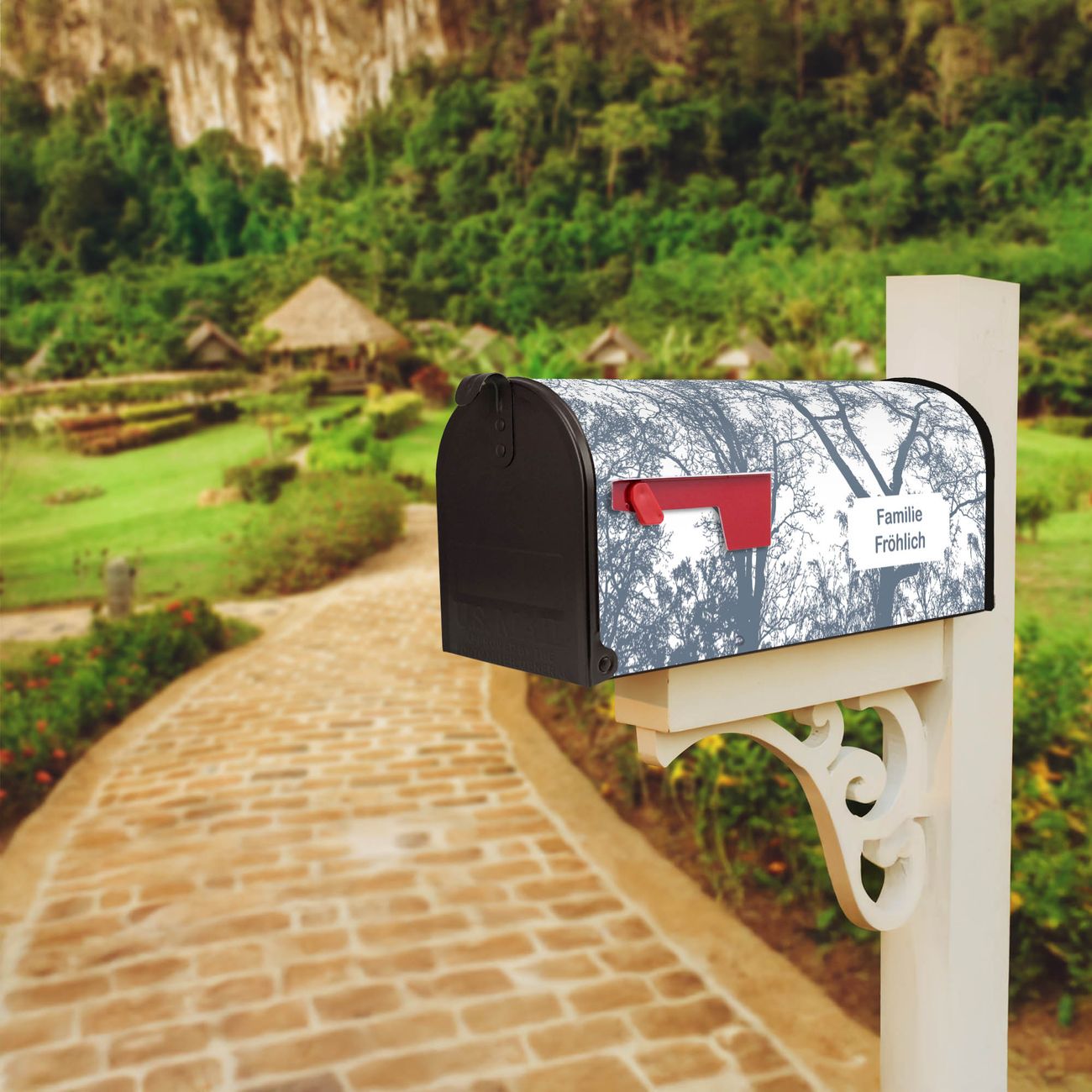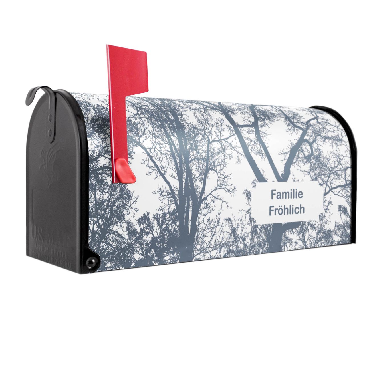 Der amerikanische Briefkasten von banjado mit Zwischen Bäumen 7 Motiv bietet Ihnen ausreichend Fassungsvermögen, um große A4 Sendungen und Zeitschriften zu empfangen. Die typisch amerikanische rote Fahne zeigt Ihnen an, wenn Sie Post erhalten haben. Die US-Mailbox besteht aus verzinktem Stahlblech welches lackiert wurde und ist 48 x 22 x 16 CM (BxHxT) groß. Die Folie mit Motiv Zwischen Bäumen 7 besteht aus einer wetter- und UV-resistenten Folie, die mit einem Schutzlaminat überzogen ist, sodass die US Mailbox zusätzlich vor Kratzern geschützt ist. An der Unterkante sind 4 Löcher je Seite um die Mailbox, typisch amerikanisch, an einem Holzpfahl oder einem Zaun zu befestigen. Auf Wunsch können Sie bei uns den passenden Standfuß oder die passende Wandhalterung kaufen um die US-Mailbox sicher zu befestigen. Wir bieten Ihnen ebenfalls Namensschilder, bereits beschriftet oder frei zu beschriften, und verschiedene selbst gestaltete Bitte-Keine-Werbung-Aufkleber.