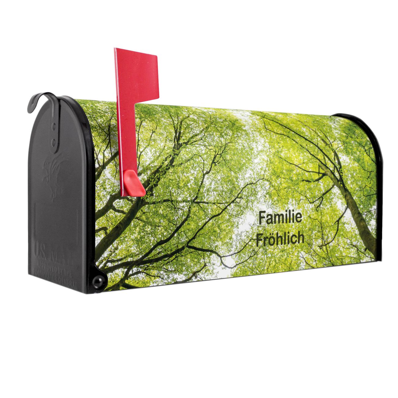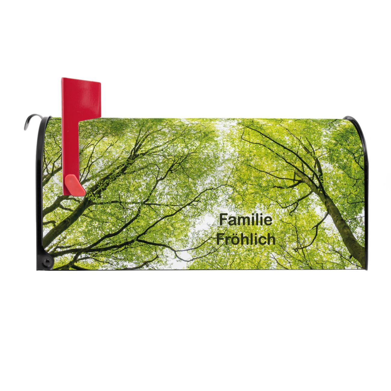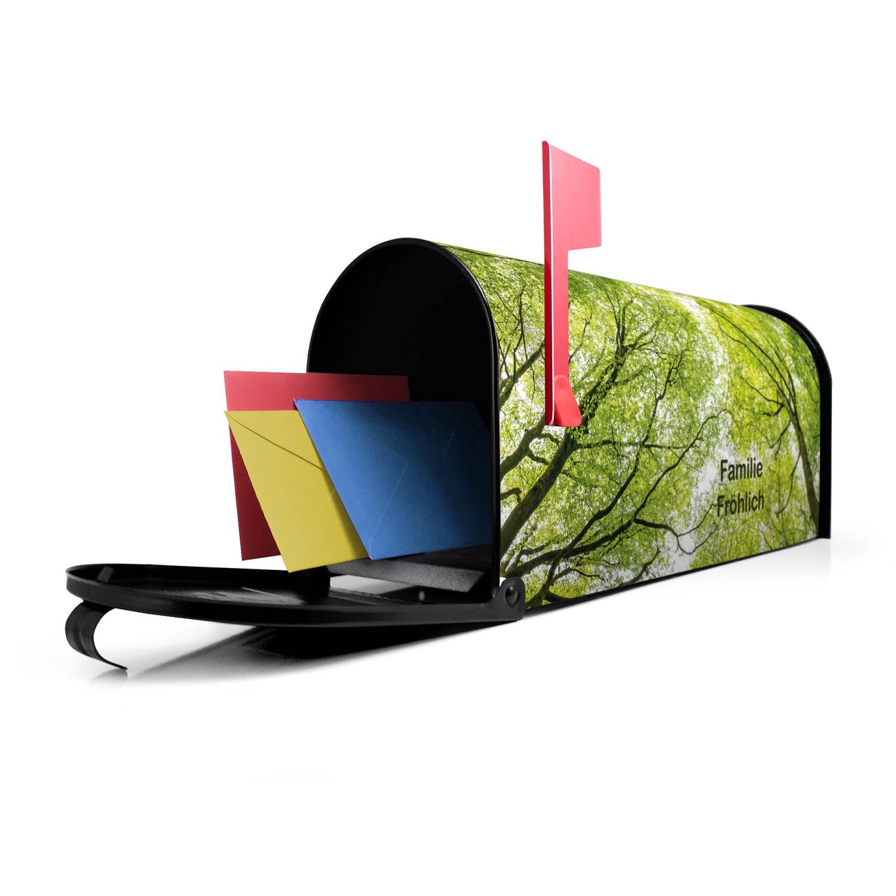 Der amerikanische Briefkasten von banjado mit Zwischen Bäumen Motiv bietet Ihnen ausreichend Fassungsvermögen, um große A4 Sendungen und Zeitschriften zu empfangen. Die typisch amerikanische rote Fahne zeigt Ihnen an, wenn Sie Post erhalten haben. Die US-Mailbox besteht aus verzinktem Stahlblech welches lackiert wurde und ist 48 x 22 x 16 CM (BxHxT) groß. Die Folie mit Motiv Zwischen Bäumen besteht aus einer wetter- und UV-resistenten Folie, die mit einem Schutzlaminat überzogen ist, sodass die US Mailbox zusätzlich vor Kratzern geschützt ist. An der Unterkante sind 4 Löcher je Seite um die Mailbox, typisch amerikanisch, an einem Holzpfahl oder einem Zaun zu befestigen. Auf Wunsch können Sie bei uns den passenden Standfuß oder die passende Wandhalterung kaufen um die US-Mailbox sicher zu befestigen. Wir bieten Ihnen ebenfalls Namensschilder, bereits beschriftet oder frei zu beschriften, und verschiedene selbst gestaltete Bitte-Keine-Werbung-Aufkleber.