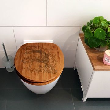 Mit dem banjado Toilettensitz in Bambus verbinden Sie Design und Funktionalität. Sie erhalten den WC-Sitz mit bewährter Holz Qualität und Universal Scharnieren. Das Motiv wird mit einem Laser in das Holz gebrannt. Durch die fein gelaserten Linien wird der WC-Sitz zu einem Blickfang in Ihrem Bad.
