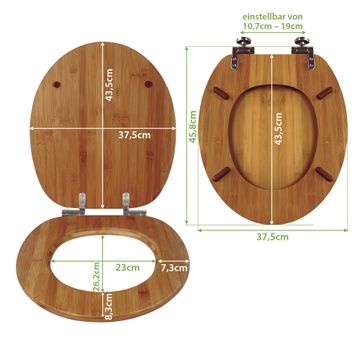 Der Klodeckel besteht aus robustem Bambus, die Scharniere sind aus bruchsicherem Metall - Materialien die Ihnen eine leichte und hygienische Reinigung ermöglichen. Die Gesamtgröße beträgt 45,8cm x 37,5cm x 5,5cm. Der WC-Sitz besitzt eine Absenkautomatik für höchsten Bedienkomfort. Der WC Sitz ist universal geeignet für alle gängigen Toilettenschüsseln. Mit Hilfe der detaillierten Aufbauanleitung ermöglichen wir eine schnelle und unkomplizierte Montage. Für ein hygienisches und leichtes Reinigen können Sie den Toilettendeckel genauso einfach wieder abnehmen. Bitte beachten Sie, das es sich dabei um ein Naturprodukt handelt und dadurch Abweichungen zu unseren Produktbildern auftreten können.