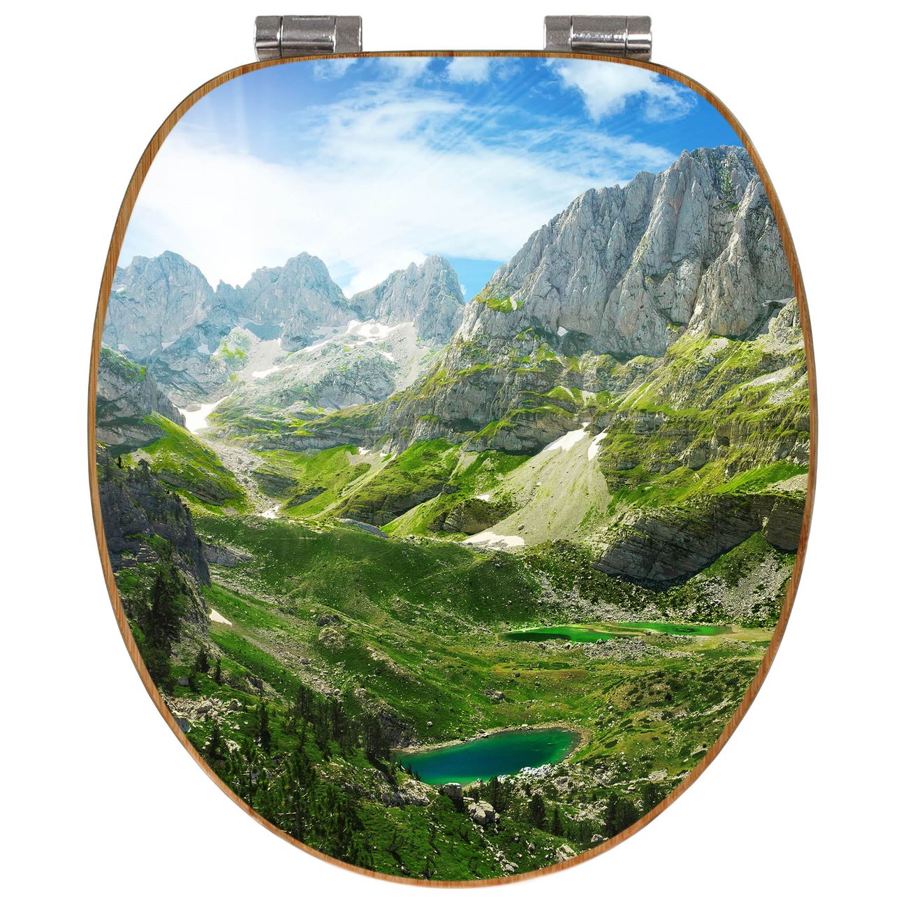 Mit dem banjado Toilettensitz in Bambus verbinden Sie Design und Funktionalität. Sie erhalten den WC-Sitz mit bewährter Holz Qualität und Universal Scharnieren. Das Motiv Motiv Bergsee Alpen besteht aus einer schutzlaminierten Motivfolie, die durch das Schutzlaminat zusätzlich vor Kratzern schützt. Durch diesen Motivdruck wird der WC-Sitz zu einem Blickfang in Ihrem Bad.