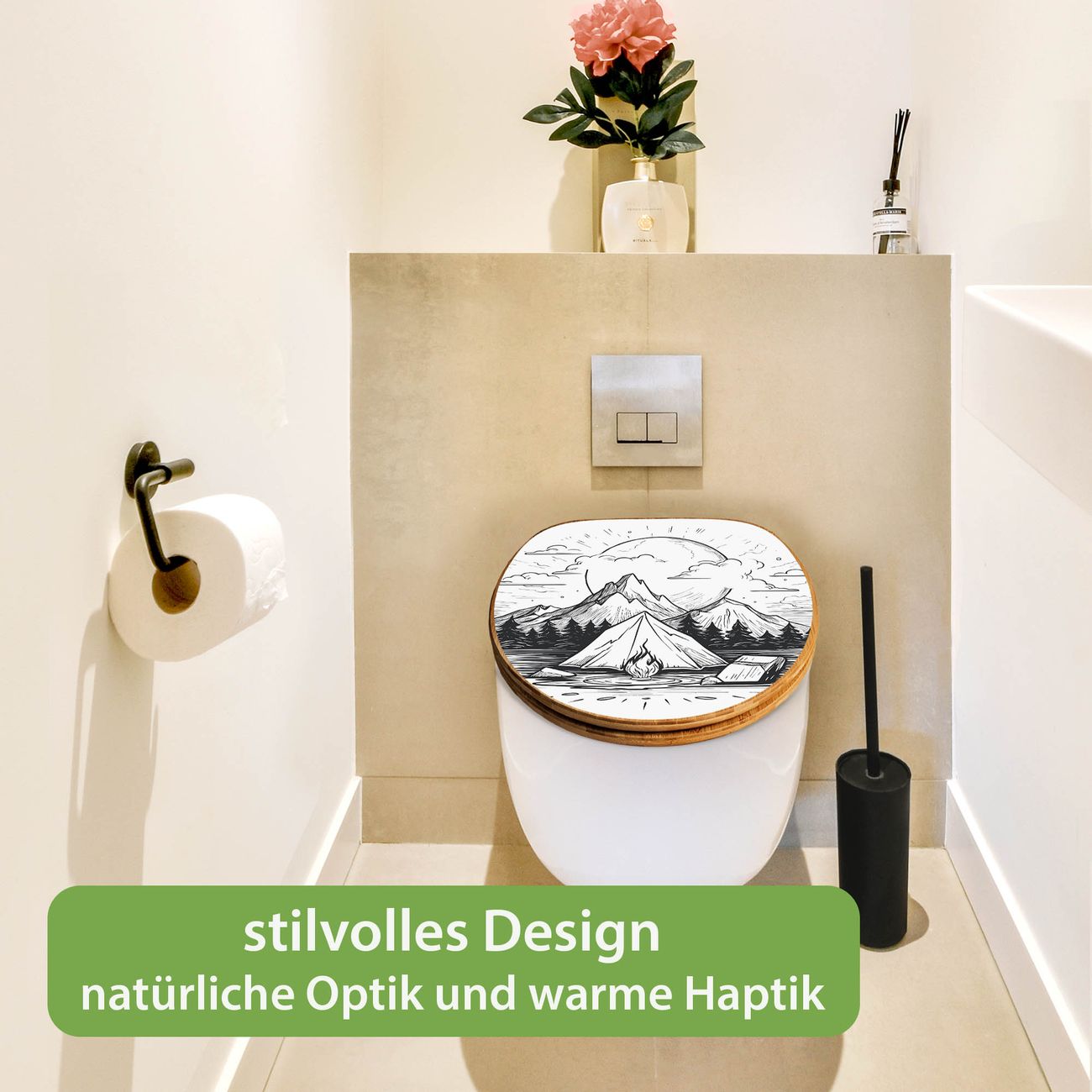 Mit dem banjado Toilettensitz in Bambus verbinden Sie Design und Funktionalität. Sie erhalten den WC-Sitz mit bewährter Holz Qualität und Universal Scharnieren. Das Motiv Motiv Camping im Mondschein besteht aus einer schutzlaminierten Motivfolie, die durch das Schutzlaminat zusätzlich vor Kratzern schützt. Durch diesen Motivdruck wird der WC-Sitz zu einem Blickfang in Ihrem Bad.