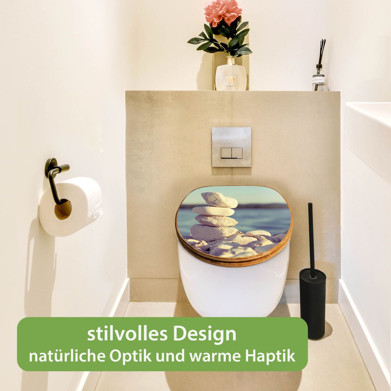 Mit dem banjado Toilettensitz in Bambus verbinden Sie Design und Funktionalität. Sie erhalten den WC-Sitz mit bewährter Holz Qualität und Universal Scharnieren. Das Motiv Motiv Leichte Steine besteht aus einer schutzlaminierten Motivfolie, die durch das Schutzlaminat zusätzlich vor Kratzern schützt. Durch diesen Motivdruck wird der WC-Sitz zu einem Blickfang in Ihrem Bad.