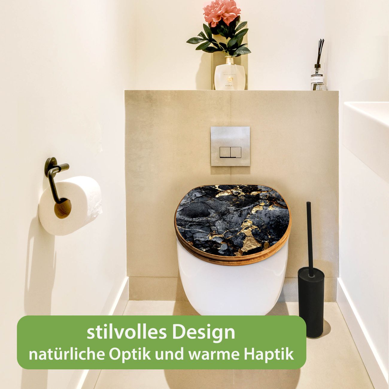 Mit dem banjado Toilettensitz in Bambus verbinden Sie Design und Funktionalität. Sie erhalten den WC-Sitz mit bewährter Holz Qualität und Universal Scharnieren. Das Motiv Motiv Schwarzer Marmor mit Gold 1 besteht aus einer schutzlaminierten Motivfolie, die durch das Schutzlaminat zusätzlich vor Kratzern schützt. Durch diesen Motivdruck wird der WC-Sitz zu einem Blickfang in Ihrem Bad.
