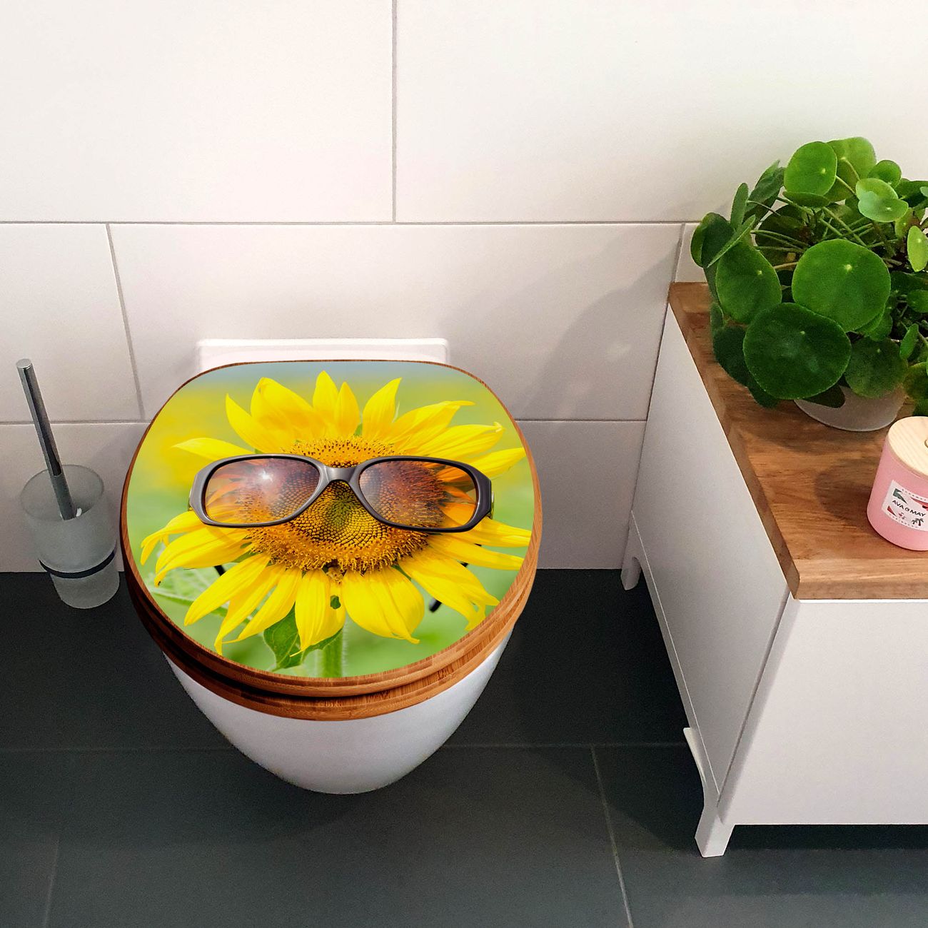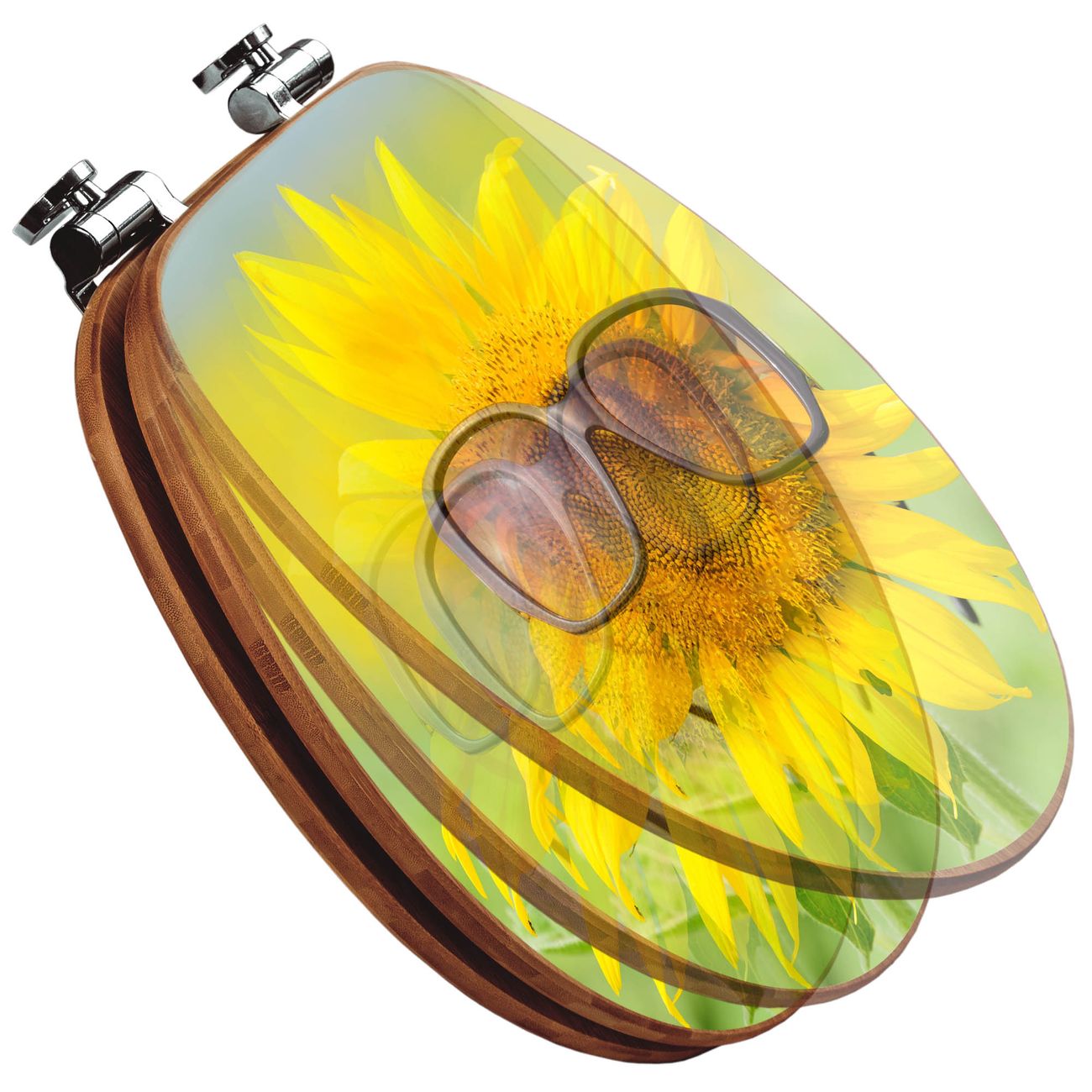 Mit dem banjado Toilettensitz in Bambus verbinden Sie Design und Funktionalität. Sie erhalten den WC-Sitz mit bewährter Holz Qualität und Universal Scharnieren. Das Motiv Motiv Sunny besteht aus einer schutzlaminierten Motivfolie, die durch das Schutzlaminat zusätzlich vor Kratzern schützt. Durch diesen Motivdruck wird der WC-Sitz zu einem Blickfang in Ihrem Bad.