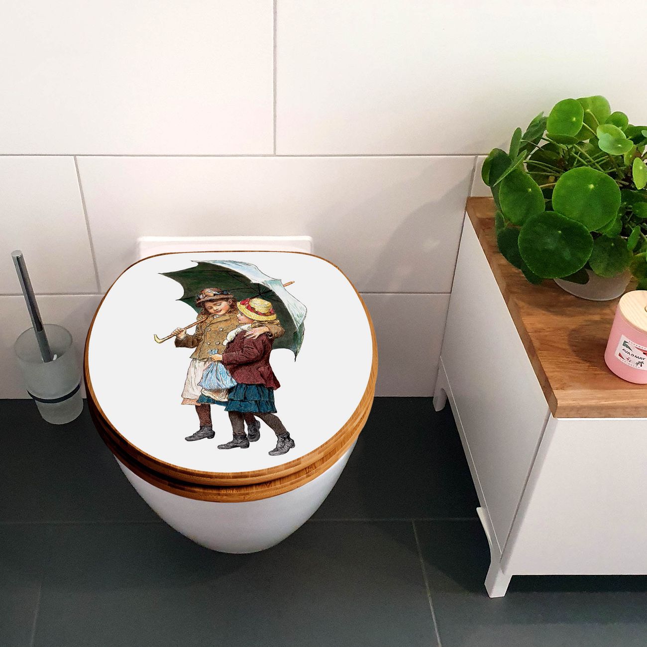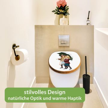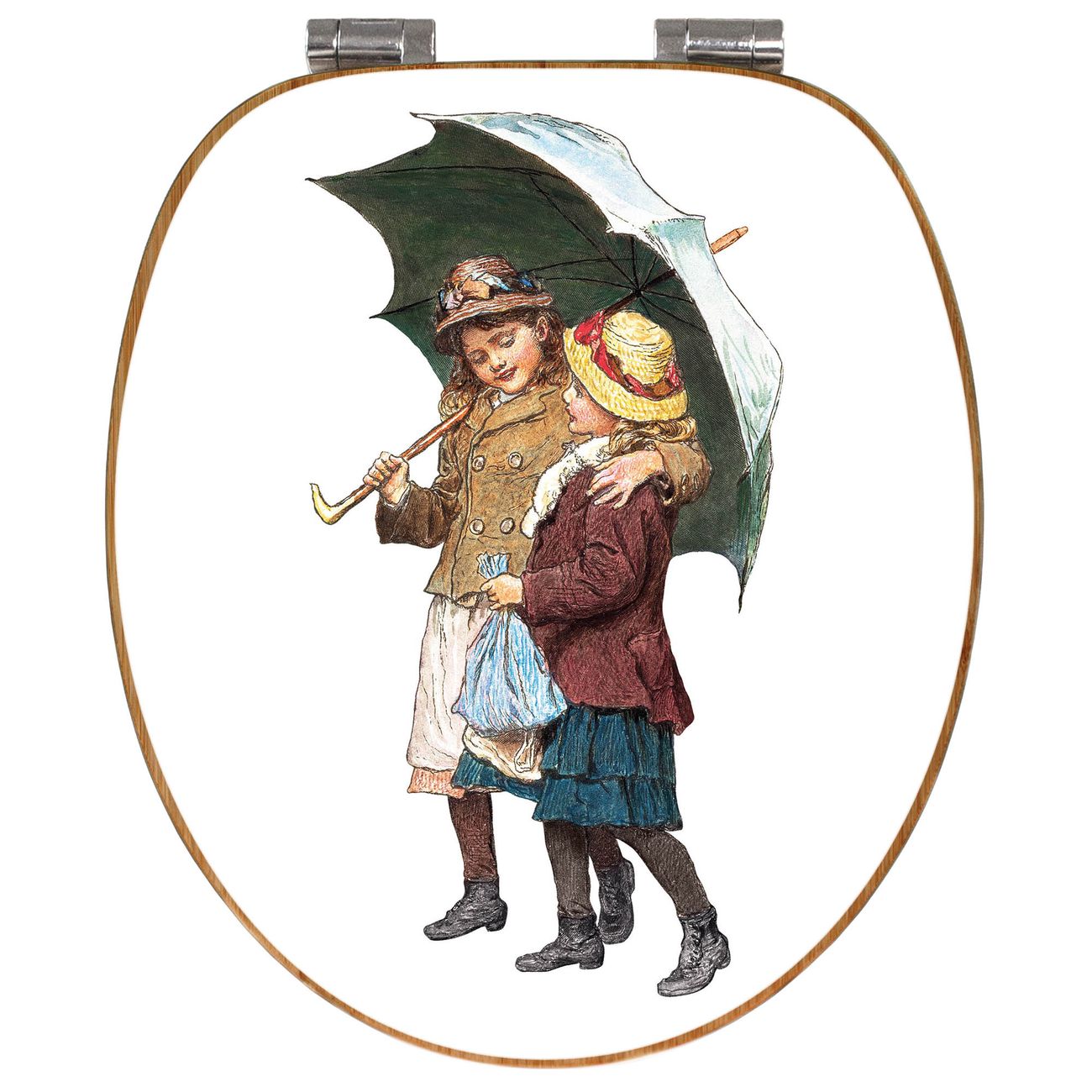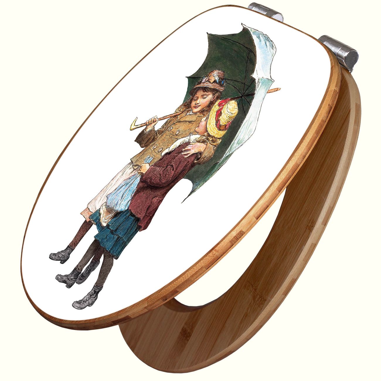 Design WC-Sitz Bambus Absenkautomatik Motiv zwei Kinder mit Regenschirm Vintage