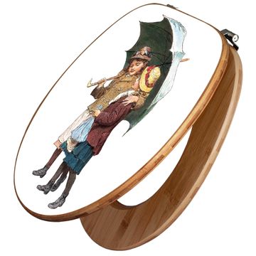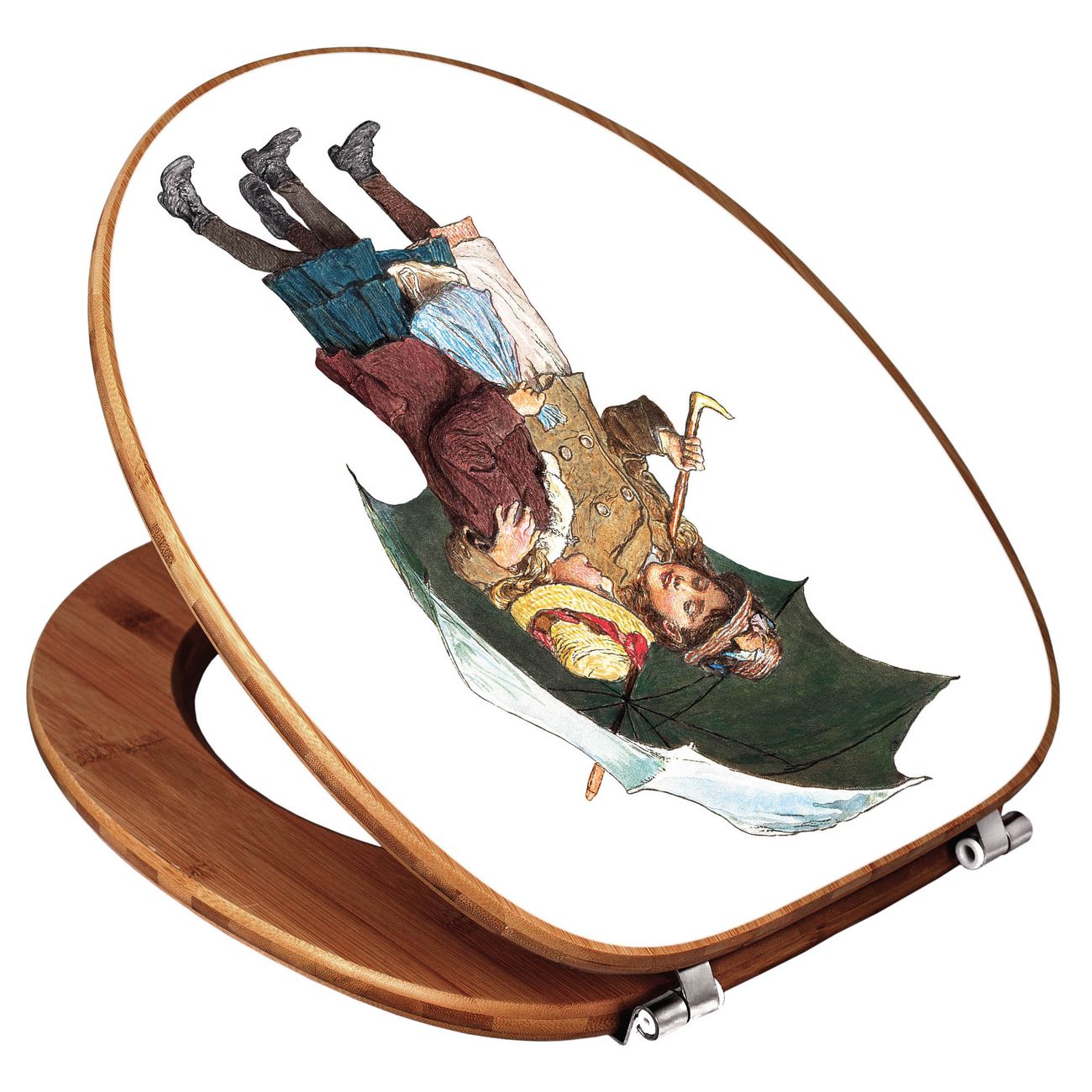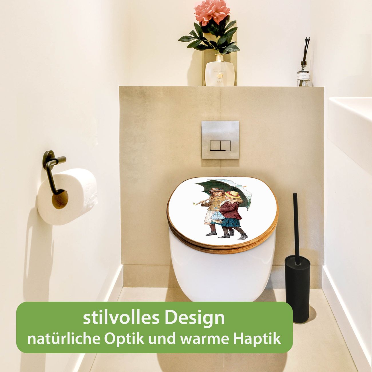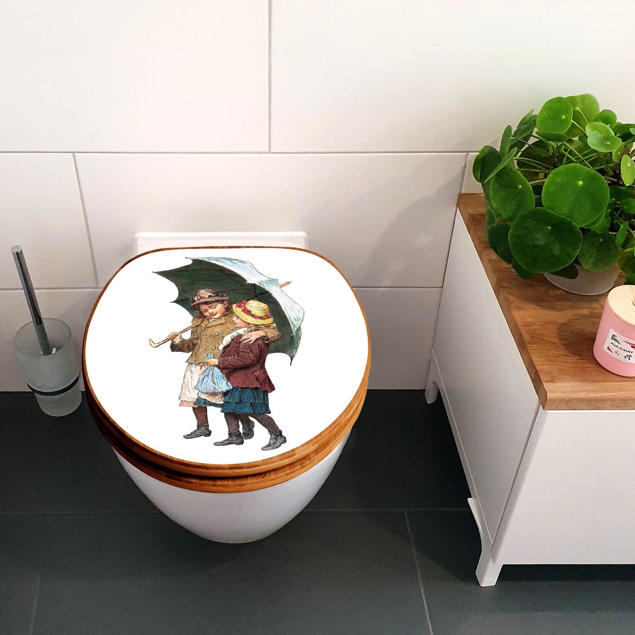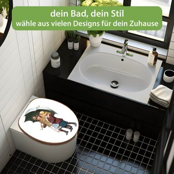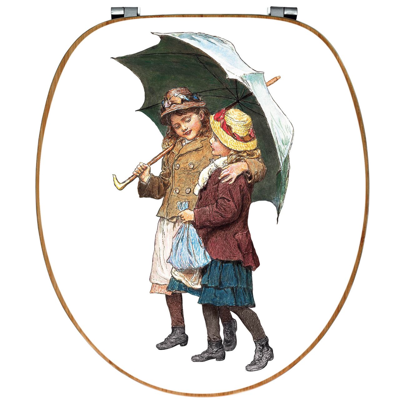 Design WC-Sitz Bambus Holz Motiv zwei Kinder mit Regenschirm Vintage