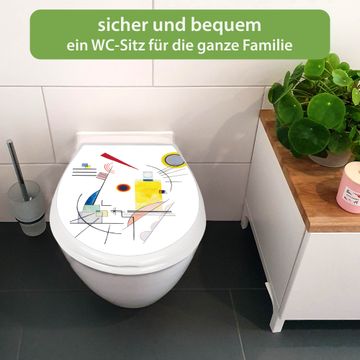 FUNKTION:Mit dem banjado Familien WC Sitz mit Absenkautomatik und dem Motiv Motiv Abstrakte Komposition verbinden Sie Design mit Funktionalität. Sie erhalten den Toilettendeckel in bewährt guter Qualität mit Montagematerial passend auf alle Euro-WC-Becken. Die Gesamtgröße beträgt 37,1cm x 44,9cm x 5cm, die Grundfarbe ist weiß.</p> DESIGN:Der Klodeckel in weiß mit Motiv Motiv Abstrakte Komposition hat eine ansprechende Optik, eine besondere Form und ist sehr stabil. Das Motiv besteht aus einer farbbrillianten Motivfolie, die durch ein Schutzlaminat zusätzlich vor Kratzern schützt. Der integrierte Kindersitz fügt sich harmonisch ein. DETAILS:Der Toilettensitz mit Soft Close besteht aus hochwertigem Polypropylen, ist geruchlos, ungiftig und kann mit handelsüblicher Seife gereinigt werden. Die Montage kann von von oben oder von unten erfolgen und ist kinderleicht. NUTZEN:Mit Hilfe der detaillierten Aufbauanleitung ermöglichen wir eine schnelle und unkomplizierte Montage. Die banjado Klobrille ist universell geeignet für alle Euro-WC-Schüsseln. Der Kindersitz kann unkompliziert entfernt werden. BANJADO:Ihr WC-Deckel wird in Sachsen in einer kleinen Manufaktur von Hand veredelt. Die Motivfolie ist lösungsmittelfrei und schutzlaminiert für einen langen Halt. Wir wünschen viel Freude bei der Auswahl eines schönen Motivs.