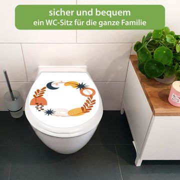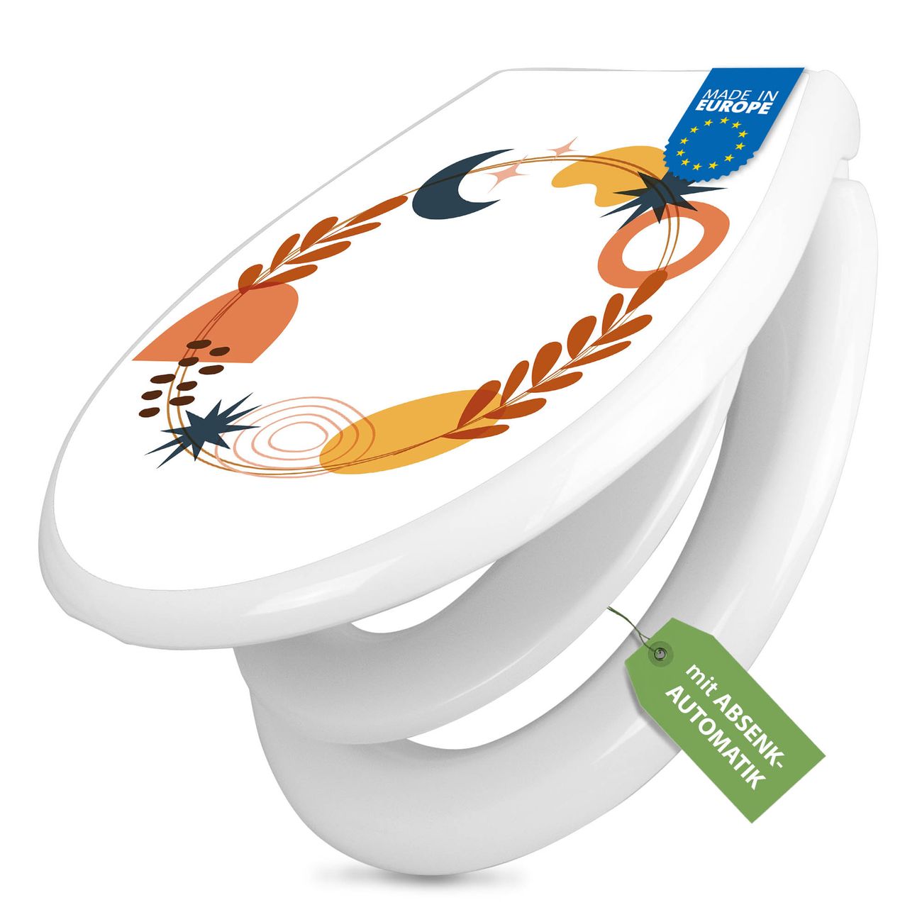 FUNKTION:Mit dem banjado Familien WC Sitz mit Absenkautomatik und dem Motiv Motiv Astro-Herbstkranz verbinden Sie Design mit Funktionalität. Sie erhalten den Toilettendeckel in bewährt guter Qualität mit Montagematerial passend auf alle Euro-WC-Becken. Die Gesamtgröße beträgt 37,1cm x 44,9cm x 5cm, die Grundfarbe ist weiß.</p> DESIGN:Der Klodeckel in weiß mit Motiv Motiv Astro-Herbstkranz hat eine ansprechende Optik, eine besondere Form und ist sehr stabil. Das Motiv besteht aus einer farbbrillianten Motivfolie, die durch ein Schutzlaminat zusätzlich vor Kratzern schützt. Der integrierte Kindersitz fügt sich harmonisch ein. DETAILS:Der Toilettensitz mit Soft Close besteht aus hochwertigem Polypropylen, ist geruchlos, ungiftig und kann mit handelsüblicher Seife gereinigt werden. Die Montage kann von von oben oder von unten erfolgen und ist kinderleicht. NUTZEN:Mit Hilfe der detaillierten Aufbauanleitung ermöglichen wir eine schnelle und unkomplizierte Montage. Die banjado Klobrille ist universell geeignet für alle Euro-WC-Schüsseln. Der Kindersitz kann unkompliziert entfernt werden. BANJADO:Ihr WC-Deckel wird in Sachsen in einer kleinen Manufaktur von Hand veredelt. Die Motivfolie ist lösungsmittelfrei und schutzlaminiert für einen langen Halt. Wir wünschen viel Freude bei der Auswahl eines schönen Motivs.