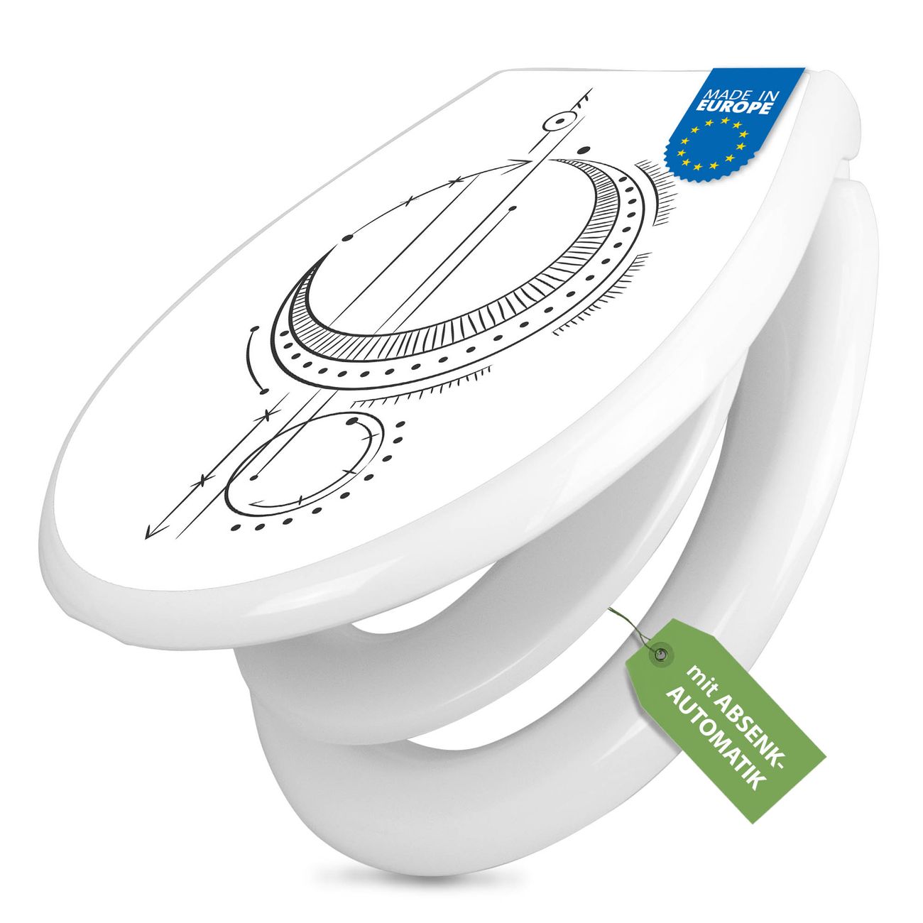 FUNKTION:Mit dem banjado Familien WC Sitz mit Absenkautomatik und dem Motiv Motiv Astronomie 6 verbinden Sie Design mit Funktionalität. Sie erhalten den Toilettendeckel in bewährt guter Qualität mit Montagematerial passend auf alle Euro-WC-Becken. Die Gesamtgröße beträgt 37,1cm x 44,9cm x 5cm, die Grundfarbe ist weiß.</p> DESIGN:Der Klodeckel in weiß mit Motiv Motiv Astronomie 6 hat eine ansprechende Optik, eine besondere Form und ist sehr stabil. Das Motiv besteht aus einer farbbrillianten Motivfolie, die durch ein Schutzlaminat zusätzlich vor Kratzern schützt. Der integrierte Kindersitz fügt sich harmonisch ein. DETAILS:Der Toilettensitz mit Soft Close besteht aus hochwertigem Polypropylen, ist geruchlos, ungiftig und kann mit handelsüblicher Seife gereinigt werden. Die Montage kann von von oben oder von unten erfolgen und ist kinderleicht. NUTZEN:Mit Hilfe der detaillierten Aufbauanleitung ermöglichen wir eine schnelle und unkomplizierte Montage. Die banjado Klobrille ist universell geeignet für alle Euro-WC-Schüsseln. Der Kindersitz kann unkompliziert entfernt werden. BANJADO:Ihr WC-Deckel wird in Sachsen in einer kleinen Manufaktur von Hand veredelt. Die Motivfolie ist lösungsmittelfrei und schutzlaminiert für einen langen Halt. Wir wünschen viel Freude bei der Auswahl eines schönen Motivs.