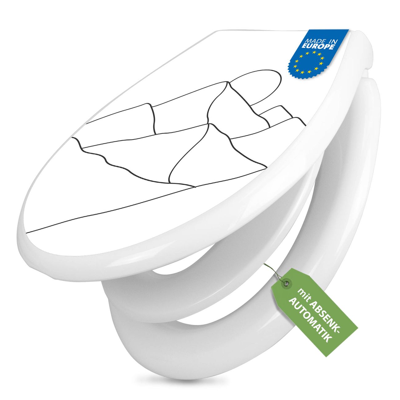 FUNKTION:Mit dem banjado Familien WC Sitz mit Absenkautomatik und dem Motiv Motiv Bergsilhouette Lineart 2 verbinden Sie Design mit Funktionalität. Sie erhalten den Toilettendeckel in bewährt guter Qualität mit Montagematerial passend auf alle Euro-WC-Becken. Die Gesamtgröße beträgt 37,1cm x 44,9cm x 5cm, die Grundfarbe ist weiß.</p> DESIGN:Der Klodeckel in weiß mit Motiv Motiv Bergsilhouette Lineart 2 hat eine ansprechende Optik, eine besondere Form und ist sehr stabil. Das Motiv besteht aus einer farbbrillianten Motivfolie, die durch ein Schutzlaminat zusätzlich vor Kratzern schützt. Der integrierte Kindersitz fügt sich harmonisch ein. DETAILS:Der Toilettensitz mit Soft Close besteht aus hochwertigem Polypropylen, ist geruchlos, ungiftig und kann mit handelsüblicher Seife gereinigt werden. Die Montage kann von von oben oder von unten erfolgen und ist kinderleicht. NUTZEN:Mit Hilfe der detaillierten Aufbauanleitung ermöglichen wir eine schnelle und unkomplizierte Montage. Die banjado Klobrille ist universell geeignet für alle Euro-WC-Schüsseln. Der Kindersitz kann unkompliziert entfernt werden. BANJADO:Ihr WC-Deckel wird in Sachsen in einer kleinen Manufaktur von Hand veredelt. Die Motivfolie ist lösungsmittelfrei und schutzlaminiert für einen langen Halt. Wir wünschen viel Freude bei der Auswahl eines schönen Motivs.
