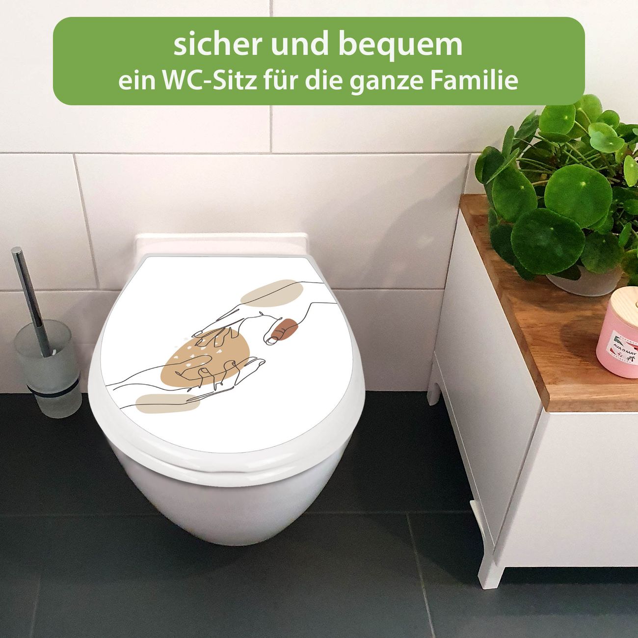 FUNKTION:Mit dem banjado Familien WC Sitz mit Absenkautomatik und dem Motiv Motiv Berührende Verbindung Lineart verbinden Sie Design mit Funktionalität. Sie erhalten den Toilettendeckel in bewährt guter Qualität mit Montagematerial passend auf alle Euro-WC-Becken. Die Gesamtgröße beträgt 37,1cm x 44,9cm x 5cm, die Grundfarbe ist weiß.</p> DESIGN:Der Klodeckel in weiß mit Motiv Motiv Berührende Verbindung Lineart hat eine ansprechende Optik, eine besondere Form und ist sehr stabil. Das Motiv besteht aus einer farbbrillianten Motivfolie, die durch ein Schutzlaminat zusätzlich vor Kratzern schützt. Der integrierte Kindersitz fügt sich harmonisch ein. DETAILS:Der Toilettensitz mit Soft Close besteht aus hochwertigem Polypropylen, ist geruchlos, ungiftig und kann mit handelsüblicher Seife gereinigt werden. Die Montage kann von von oben oder von unten erfolgen und ist kinderleicht. NUTZEN:Mit Hilfe der detaillierten Aufbauanleitung ermöglichen wir eine schnelle und unkomplizierte Montage. Die banjado Klobrille ist universell geeignet für alle Euro-WC-Schüsseln. Der Kindersitz kann unkompliziert entfernt werden. BANJADO:Ihr WC-Deckel wird in Sachsen in einer kleinen Manufaktur von Hand veredelt. Die Motivfolie ist lösungsmittelfrei und schutzlaminiert für einen langen Halt. Wir wünschen viel Freude bei der Auswahl eines schönen Motivs.