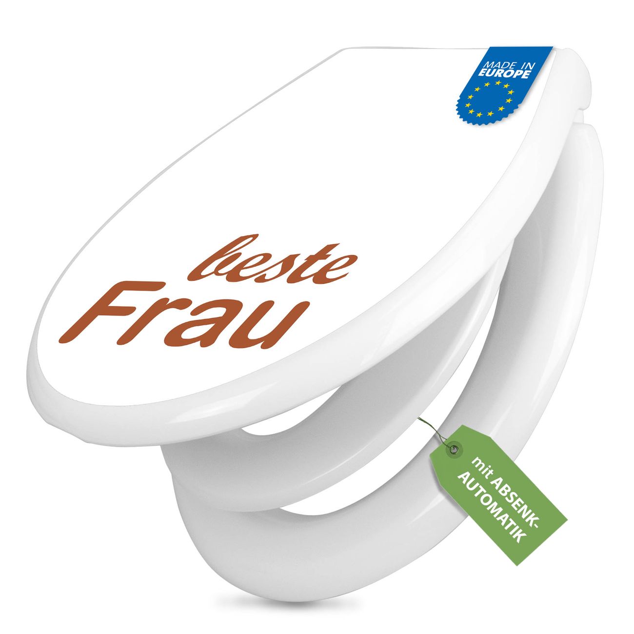 FUNKTION:Mit dem banjado Familien WC Sitz mit Absenkautomatik und dem Motiv Motiv beste Frau 2 verbinden Sie Design mit Funktionalität. Sie erhalten den Toilettendeckel in bewährt guter Qualität mit Montagematerial passend auf alle Euro-WC-Becken. Die Gesamtgröße beträgt 37,1cm x 44,9cm x 5cm, die Grundfarbe ist weiß.</p> DESIGN:Der Klodeckel in weiß mit Motiv Motiv beste Frau 2 hat eine ansprechende Optik, eine besondere Form und ist sehr stabil. Das Motiv besteht aus einer farbbrillianten Motivfolie, die durch ein Schutzlaminat zusätzlich vor Kratzern schützt. Der integrierte Kindersitz fügt sich harmonisch ein. DETAILS:Der Toilettensitz mit Soft Close besteht aus hochwertigem Polypropylen, ist geruchlos, ungiftig und kann mit handelsüblicher Seife gereinigt werden. Die Montage kann von von oben oder von unten erfolgen und ist kinderleicht. NUTZEN:Mit Hilfe der detaillierten Aufbauanleitung ermöglichen wir eine schnelle und unkomplizierte Montage. Die banjado Klobrille ist universell geeignet für alle Euro-WC-Schüsseln. Der Kindersitz kann unkompliziert entfernt werden. BANJADO:Ihr WC-Deckel wird in Sachsen in einer kleinen Manufaktur von Hand veredelt. Die Motivfolie ist lösungsmittelfrei und schutzlaminiert für einen langen Halt. Wir wünschen viel Freude bei der Auswahl eines schönen Motivs.
