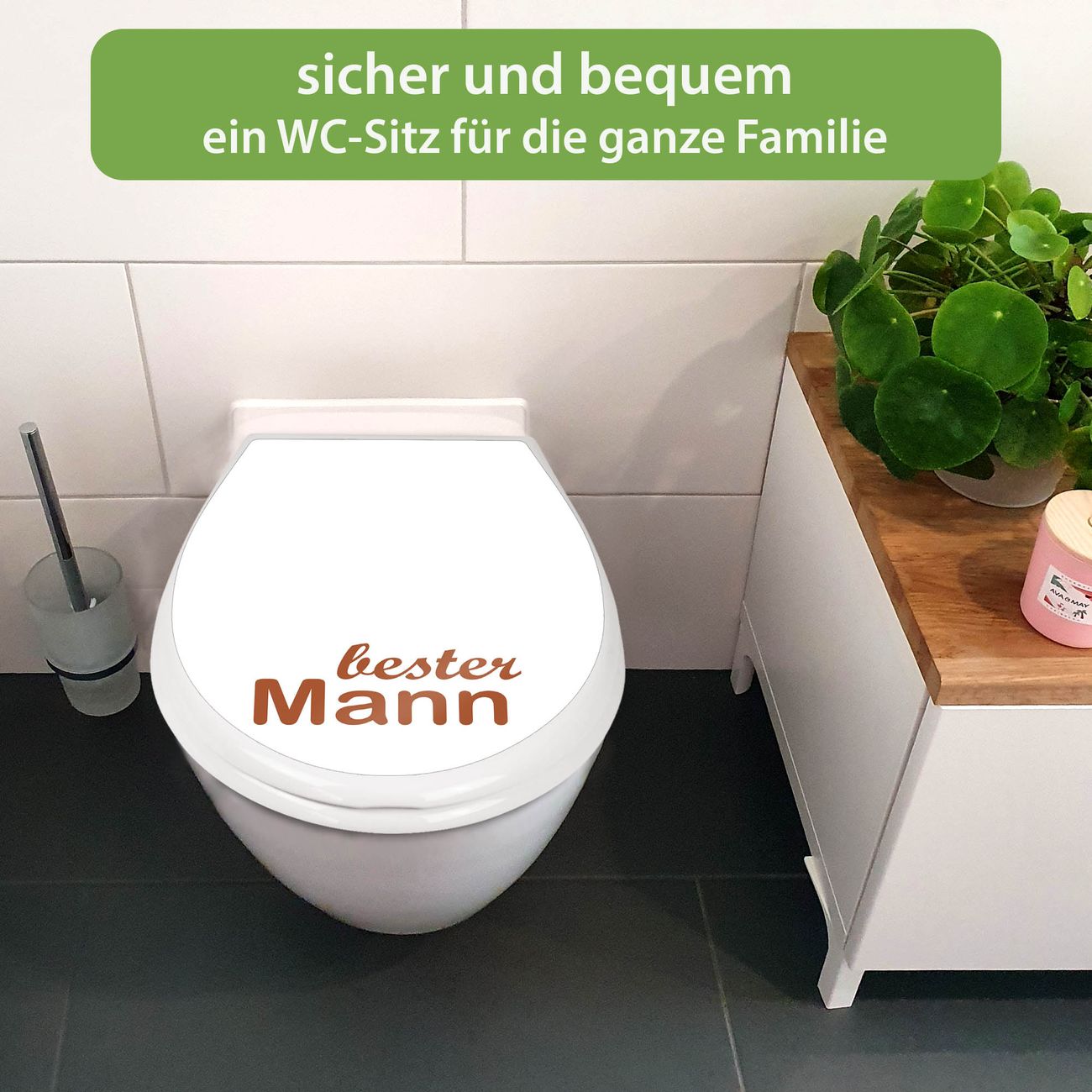 FUNKTION:Mit dem banjado Familien WC Sitz mit Absenkautomatik und dem Motiv Motiv bester Mann 2 verbinden Sie Design mit Funktionalität. Sie erhalten den Toilettendeckel in bewährt guter Qualität mit Montagematerial passend auf alle Euro-WC-Becken. Die Gesamtgröße beträgt 37,1cm x 44,9cm x 5cm, die Grundfarbe ist weiß.</p> DESIGN:Der Klodeckel in weiß mit Motiv Motiv bester Mann 2 hat eine ansprechende Optik, eine besondere Form und ist sehr stabil. Das Motiv besteht aus einer farbbrillianten Motivfolie, die durch ein Schutzlaminat zusätzlich vor Kratzern schützt. Der integrierte Kindersitz fügt sich harmonisch ein. DETAILS:Der Toilettensitz mit Soft Close besteht aus hochwertigem Polypropylen, ist geruchlos, ungiftig und kann mit handelsüblicher Seife gereinigt werden. Die Montage kann von von oben oder von unten erfolgen und ist kinderleicht. NUTZEN:Mit Hilfe der detaillierten Aufbauanleitung ermöglichen wir eine schnelle und unkomplizierte Montage. Die banjado Klobrille ist universell geeignet für alle Euro-WC-Schüsseln. Der Kindersitz kann unkompliziert entfernt werden. BANJADO:Ihr WC-Deckel wird in Sachsen in einer kleinen Manufaktur von Hand veredelt. Die Motivfolie ist lösungsmittelfrei und schutzlaminiert für einen langen Halt. Wir wünschen viel Freude bei der Auswahl eines schönen Motivs.