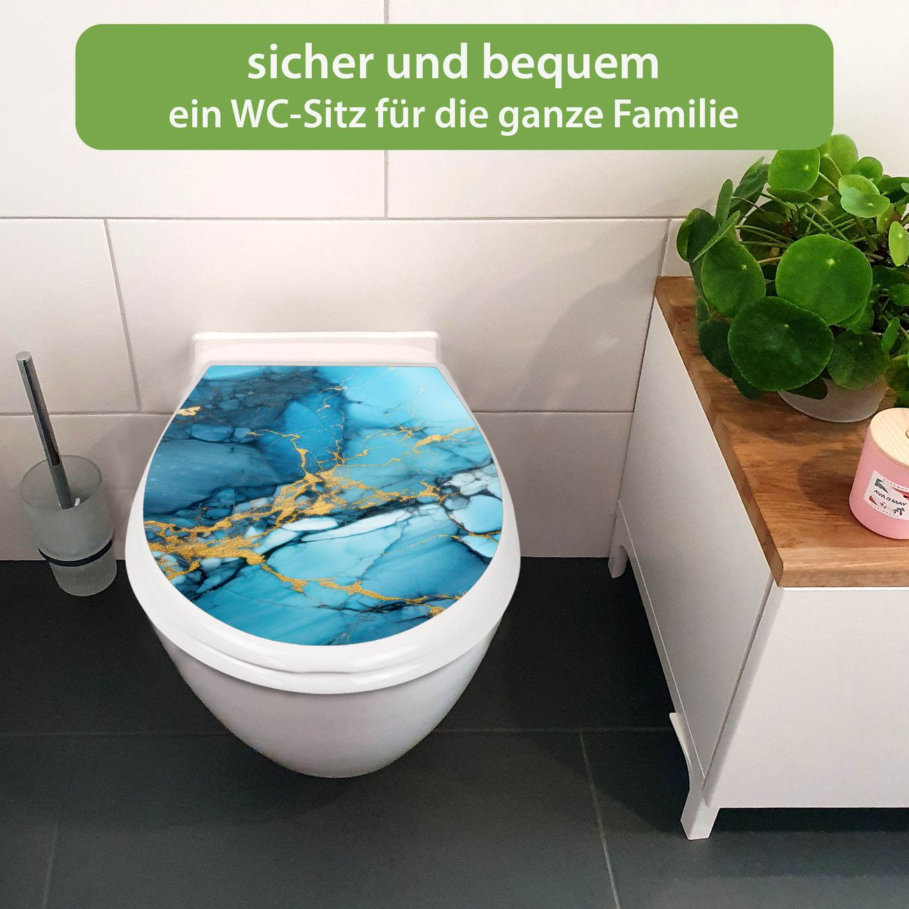 FUNKTION:Mit dem banjado Familien WC Sitz mit Absenkautomatik und dem Motiv Motiv Blauer Marmor mit Gold 2 verbinden Sie Design mit Funktionalität. Sie erhalten den Toilettendeckel in bewährt guter Qualität mit Montagematerial passend auf alle Euro-WC-Becken. Die Gesamtgröße beträgt 37,1cm x 44,9cm x 5cm, die Grundfarbe ist weiß.</p> DESIGN:Der Klodeckel in weiß mit Motiv Motiv Blauer Marmor mit Gold 2 hat eine ansprechende Optik, eine besondere Form und ist sehr stabil. Das Motiv besteht aus einer farbbrillianten Motivfolie, die durch ein Schutzlaminat zusätzlich vor Kratzern schützt. Der integrierte Kindersitz fügt sich harmonisch ein. DETAILS:Der Toilettensitz mit Soft Close besteht aus hochwertigem Polypropylen, ist geruchlos, ungiftig und kann mit handelsüblicher Seife gereinigt werden. Die Montage kann von von oben oder von unten erfolgen und ist kinderleicht. NUTZEN:Mit Hilfe der detaillierten Aufbauanleitung ermöglichen wir eine schnelle und unkomplizierte Montage. Die banjado Klobrille ist universell geeignet für alle Euro-WC-Schüsseln. Der Kindersitz kann unkompliziert entfernt werden. BANJADO:Ihr WC-Deckel wird in Sachsen in einer kleinen Manufaktur von Hand veredelt. Die Motivfolie ist lösungsmittelfrei und schutzlaminiert für einen langen Halt. Wir wünschen viel Freude bei der Auswahl eines schönen Motivs.