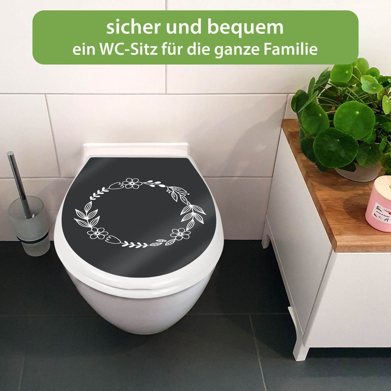 FUNKTION:Mit dem banjado Familien WC Sitz mit Absenkautomatik und dem Motiv Motiv Blütenkranz verbinden Sie Design mit Funktionalität. Sie erhalten den Toilettendeckel in bewährt guter Qualität mit Montagematerial passend auf alle Euro-WC-Becken. Die Gesamtgröße beträgt 37,1cm x 44,9cm x 5cm, die Grundfarbe ist weiß.</p> DESIGN:Der Klodeckel in weiß mit Motiv Motiv Blütenkranz hat eine ansprechende Optik, eine besondere Form und ist sehr stabil. Das Motiv besteht aus einer farbbrillianten Motivfolie, die durch ein Schutzlaminat zusätzlich vor Kratzern schützt. Der integrierte Kindersitz fügt sich harmonisch ein. DETAILS:Der Toilettensitz mit Soft Close besteht aus hochwertigem Polypropylen, ist geruchlos, ungiftig und kann mit handelsüblicher Seife gereinigt werden. Die Montage kann von von oben oder von unten erfolgen und ist kinderleicht. NUTZEN:Mit Hilfe der detaillierten Aufbauanleitung ermöglichen wir eine schnelle und unkomplizierte Montage. Die banjado Klobrille ist universell geeignet für alle Euro-WC-Schüsseln. Der Kindersitz kann unkompliziert entfernt werden. BANJADO:Ihr WC-Deckel wird in Sachsen in einer kleinen Manufaktur von Hand veredelt. Die Motivfolie ist lösungsmittelfrei und schutzlaminiert für einen langen Halt. Wir wünschen viel Freude bei der Auswahl eines schönen Motivs.