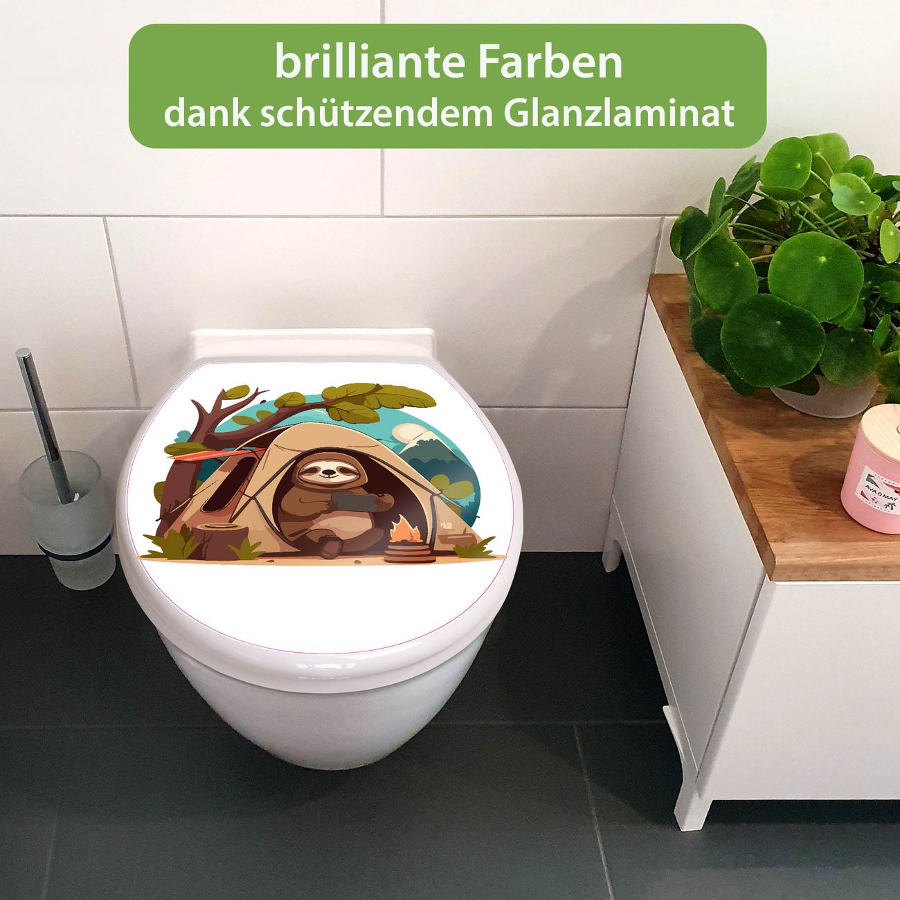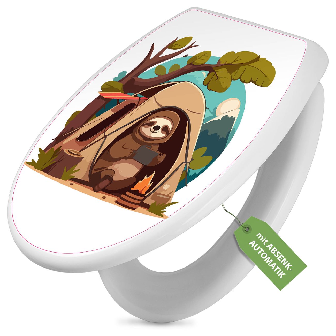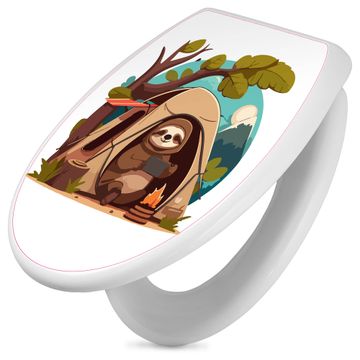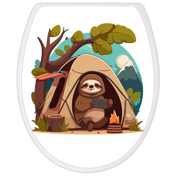 Toilettendeckel weiß mit Absenkautomatik Motiv Camping mit Faultier