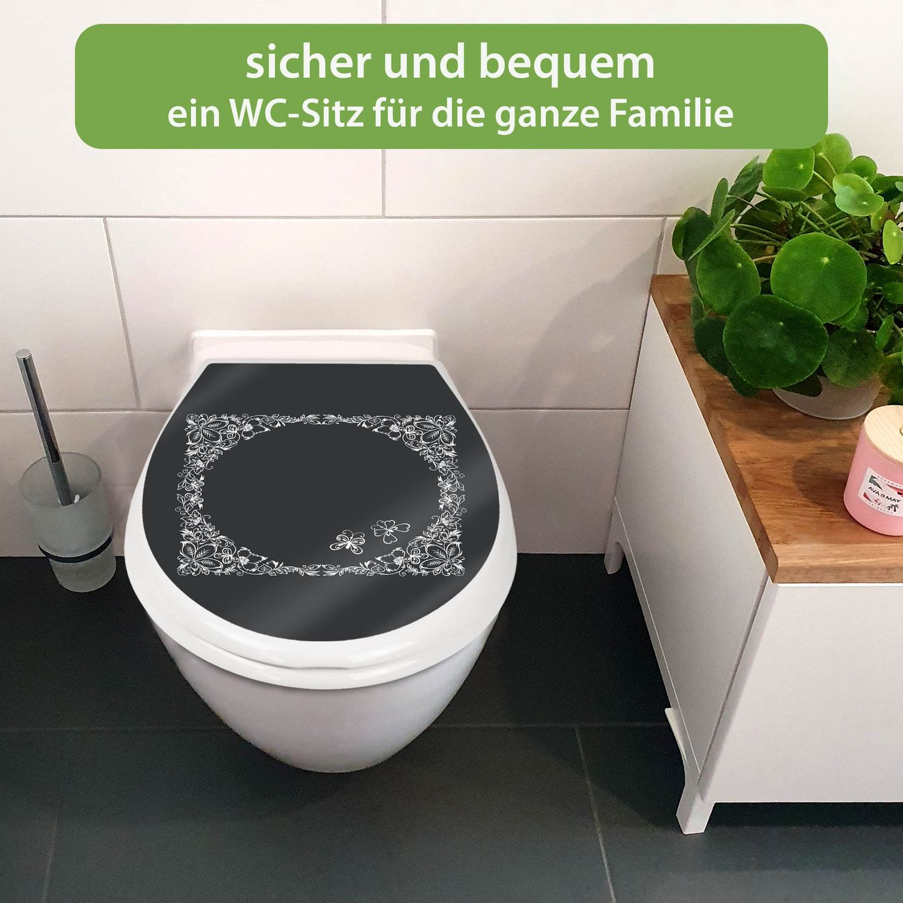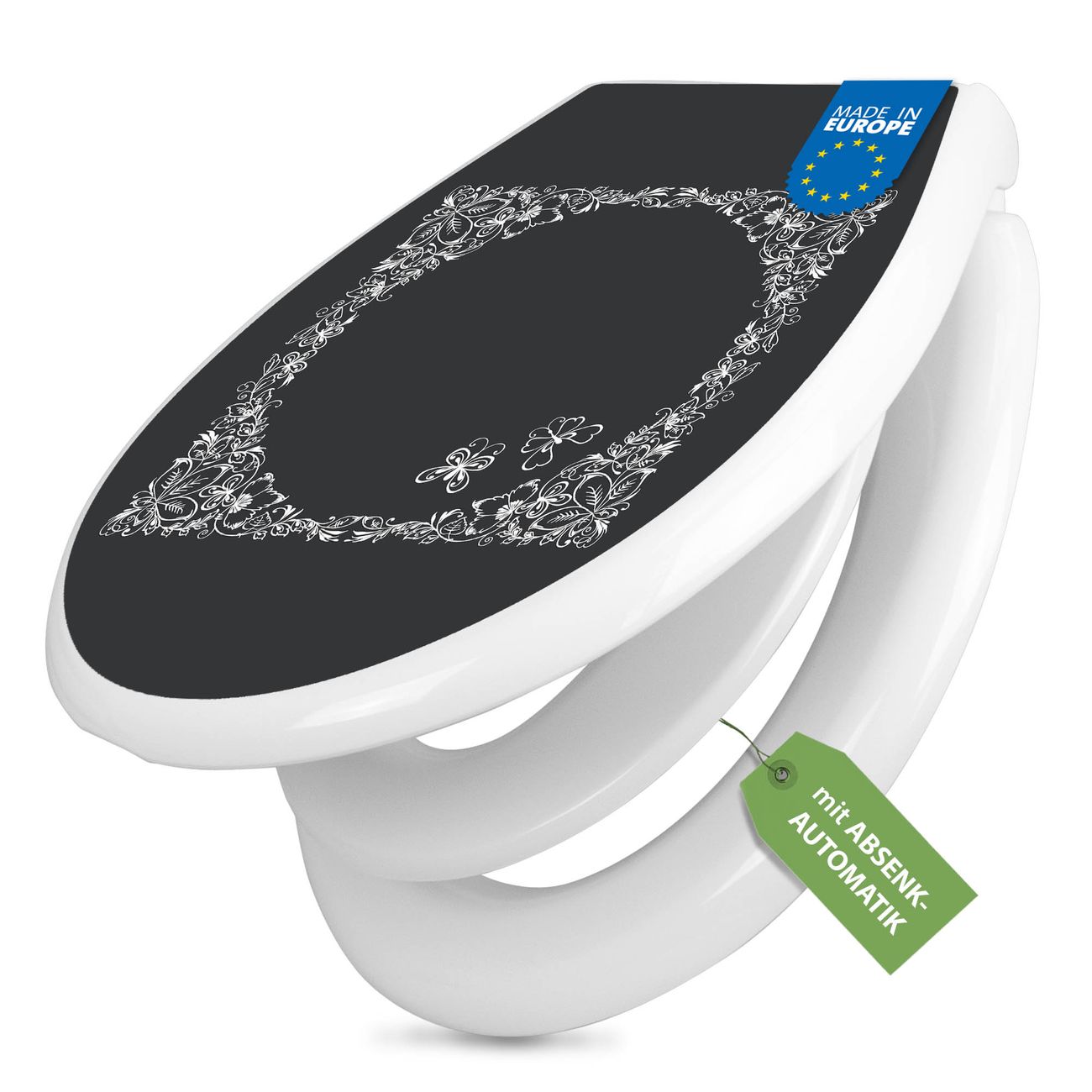FUNKTION:Mit dem banjado Familien WC Sitz mit Absenkautomatik und dem Motiv Motiv Floraler Rahmen 3 verbinden Sie Design mit Funktionalität. Sie erhalten den Toilettendeckel in bewährt guter Qualität mit Montagematerial passend auf alle Euro-WC-Becken. Die Gesamtgröße beträgt 37,1cm x 44,9cm x 5cm, die Grundfarbe ist weiß.</p> DESIGN:Der Klodeckel in weiß mit Motiv Motiv Floraler Rahmen 3 hat eine ansprechende Optik, eine besondere Form und ist sehr stabil. Das Motiv besteht aus einer farbbrillianten Motivfolie, die durch ein Schutzlaminat zusätzlich vor Kratzern schützt. Der integrierte Kindersitz fügt sich harmonisch ein. DETAILS:Der Toilettensitz mit Soft Close besteht aus hochwertigem Polypropylen, ist geruchlos, ungiftig und kann mit handelsüblicher Seife gereinigt werden. Die Montage kann von von oben oder von unten erfolgen und ist kinderleicht. NUTZEN:Mit Hilfe der detaillierten Aufbauanleitung ermöglichen wir eine schnelle und unkomplizierte Montage. Die banjado Klobrille ist universell geeignet für alle Euro-WC-Schüsseln. Der Kindersitz kann unkompliziert entfernt werden. BANJADO:Ihr WC-Deckel wird in Sachsen in einer kleinen Manufaktur von Hand veredelt. Die Motivfolie ist lösungsmittelfrei und schutzlaminiert für einen langen Halt. Wir wünschen viel Freude bei der Auswahl eines schönen Motivs.