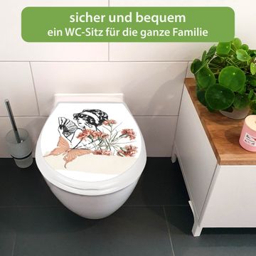 FUNKTION:Mit dem banjado Familien WC Sitz mit Absenkautomatik und dem Motiv Motiv Frau und Blühten Vintage 2 verbinden Sie Design mit Funktionalität. Sie erhalten den Toilettendeckel in bewährt guter Qualität mit Montagematerial passend auf alle Euro-WC-Becken. Die Gesamtgröße beträgt 37,1cm x 44,9cm x 5cm, die Grundfarbe ist weiß.</p> DESIGN:Der Klodeckel in weiß mit Motiv Motiv Frau und Blühten Vintage 2 hat eine ansprechende Optik, eine besondere Form und ist sehr stabil. Das Motiv besteht aus einer farbbrillianten Motivfolie, die durch ein Schutzlaminat zusätzlich vor Kratzern schützt. Der integrierte Kindersitz fügt sich harmonisch ein. DETAILS:Der Toilettensitz mit Soft Close besteht aus hochwertigem Polypropylen, ist geruchlos, ungiftig und kann mit handelsüblicher Seife gereinigt werden. Die Montage kann von von oben oder von unten erfolgen und ist kinderleicht. NUTZEN:Mit Hilfe der detaillierten Aufbauanleitung ermöglichen wir eine schnelle und unkomplizierte Montage. Die banjado Klobrille ist universell geeignet für alle Euro-WC-Schüsseln. Der Kindersitz kann unkompliziert entfernt werden. BANJADO:Ihr WC-Deckel wird in Sachsen in einer kleinen Manufaktur von Hand veredelt. Die Motivfolie ist lösungsmittelfrei und schutzlaminiert für einen langen Halt. Wir wünschen viel Freude bei der Auswahl eines schönen Motivs.