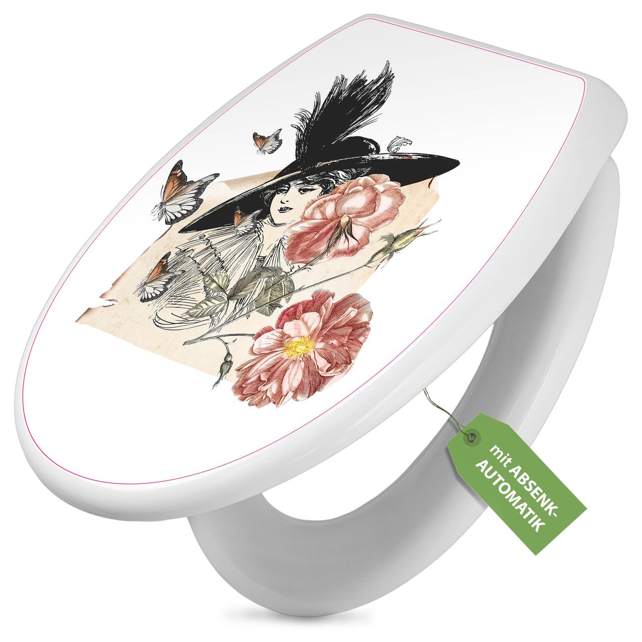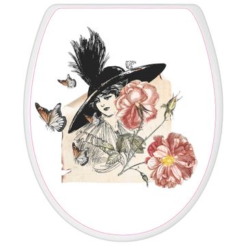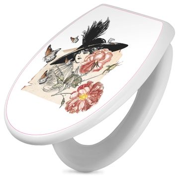 Toilettendeckel weiß mit Absenkautomatik Motiv Frau und Blühten Vintage