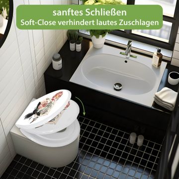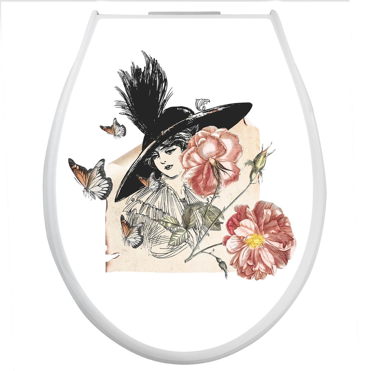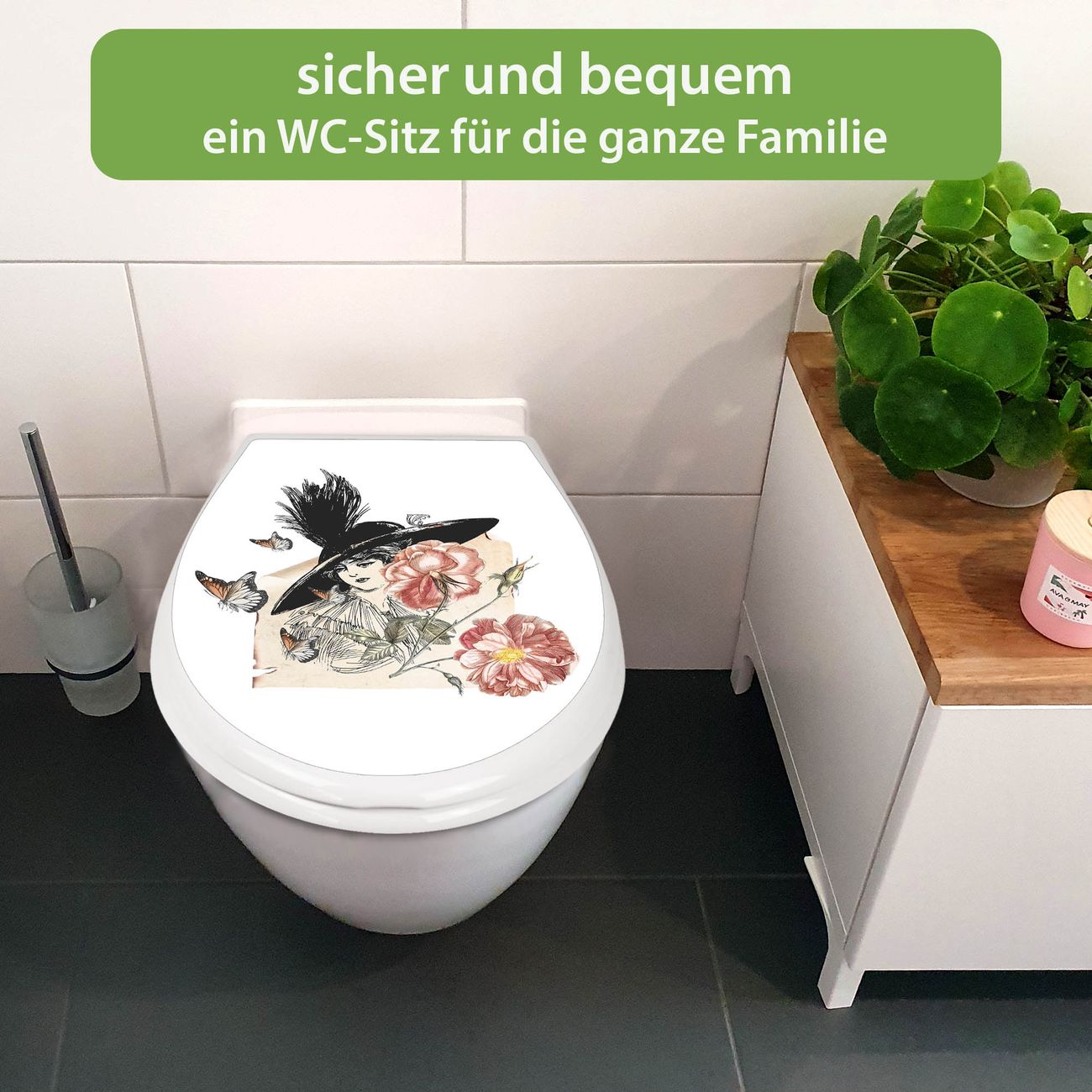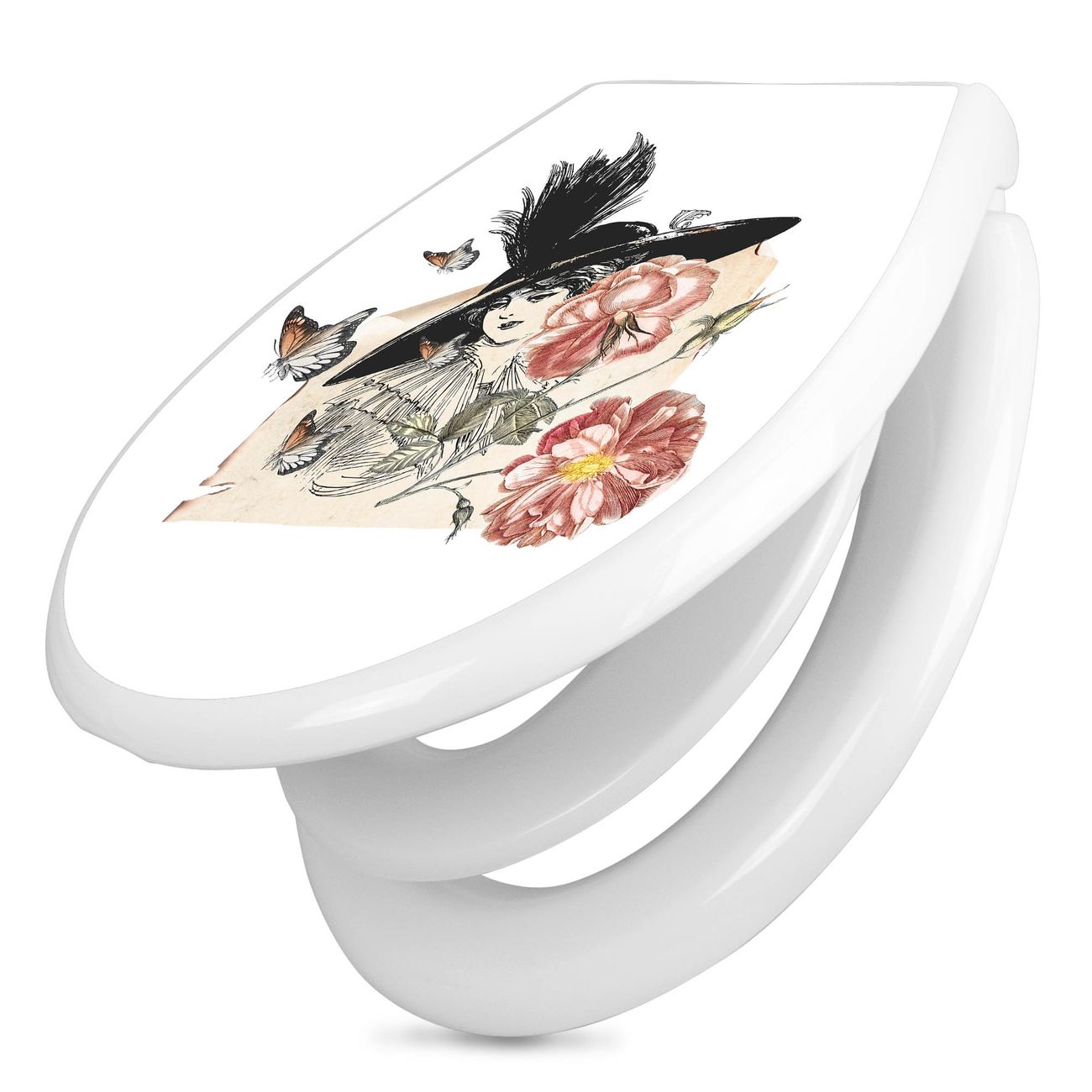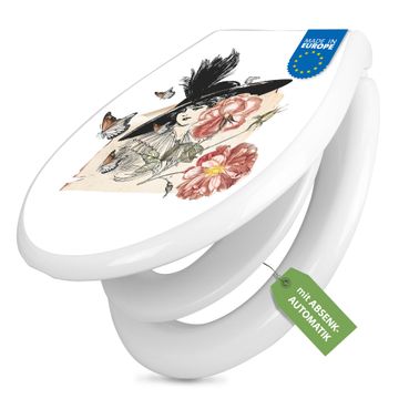 Toilettendeckel weiß mit Absenkautomatik Motiv Frau und Blühten Vintage
