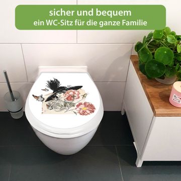 FUNKTION:Mit dem banjado Familien WC Sitz mit Absenkautomatik und dem Motiv Motiv Frau und Blühten Vintage verbinden Sie Design mit Funktionalität. Sie erhalten den Toilettendeckel in bewährt guter Qualität mit Montagematerial passend auf alle Euro-WC-Becken. Die Gesamtgröße beträgt 37,1cm x 44,9cm x 5cm, die Grundfarbe ist weiß.</p> DESIGN:Der Klodeckel in weiß mit Motiv Motiv Frau und Blühten Vintage hat eine ansprechende Optik, eine besondere Form und ist sehr stabil. Das Motiv besteht aus einer farbbrillianten Motivfolie, die durch ein Schutzlaminat zusätzlich vor Kratzern schützt. Der integrierte Kindersitz fügt sich harmonisch ein. DETAILS:Der Toilettensitz mit Soft Close besteht aus hochwertigem Polypropylen, ist geruchlos, ungiftig und kann mit handelsüblicher Seife gereinigt werden. Die Montage kann von von oben oder von unten erfolgen und ist kinderleicht. NUTZEN:Mit Hilfe der detaillierten Aufbauanleitung ermöglichen wir eine schnelle und unkomplizierte Montage. Die banjado Klobrille ist universell geeignet für alle Euro-WC-Schüsseln. Der Kindersitz kann unkompliziert entfernt werden. BANJADO:Ihr WC-Deckel wird in Sachsen in einer kleinen Manufaktur von Hand veredelt. Die Motivfolie ist lösungsmittelfrei und schutzlaminiert für einen langen Halt. Wir wünschen viel Freude bei der Auswahl eines schönen Motivs.
