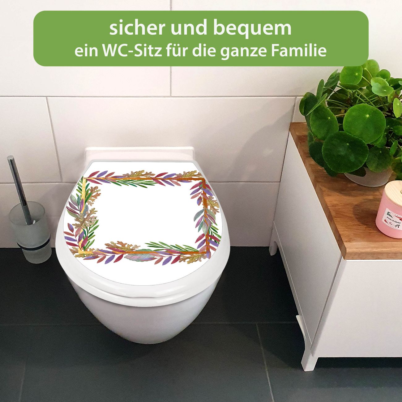 FUNKTION:Mit dem banjado Familien WC Sitz mit Absenkautomatik und dem Motiv Motiv Herbstliche Blattgirlande verbinden Sie Design mit Funktionalität. Sie erhalten den Toilettendeckel in bewährt guter Qualität mit Montagematerial passend auf alle Euro-WC-Becken. Die Gesamtgröße beträgt 37,1cm x 44,9cm x 5cm, die Grundfarbe ist weiß.</p> DESIGN:Der Klodeckel in weiß mit Motiv Motiv Herbstliche Blattgirlande hat eine ansprechende Optik, eine besondere Form und ist sehr stabil. Das Motiv besteht aus einer farbbrillianten Motivfolie, die durch ein Schutzlaminat zusätzlich vor Kratzern schützt. Der integrierte Kindersitz fügt sich harmonisch ein. DETAILS:Der Toilettensitz mit Soft Close besteht aus hochwertigem Polypropylen, ist geruchlos, ungiftig und kann mit handelsüblicher Seife gereinigt werden. Die Montage kann von von oben oder von unten erfolgen und ist kinderleicht. NUTZEN:Mit Hilfe der detaillierten Aufbauanleitung ermöglichen wir eine schnelle und unkomplizierte Montage. Die banjado Klobrille ist universell geeignet für alle Euro-WC-Schüsseln. Der Kindersitz kann unkompliziert entfernt werden. BANJADO:Ihr WC-Deckel wird in Sachsen in einer kleinen Manufaktur von Hand veredelt. Die Motivfolie ist lösungsmittelfrei und schutzlaminiert für einen langen Halt. Wir wünschen viel Freude bei der Auswahl eines schönen Motivs.