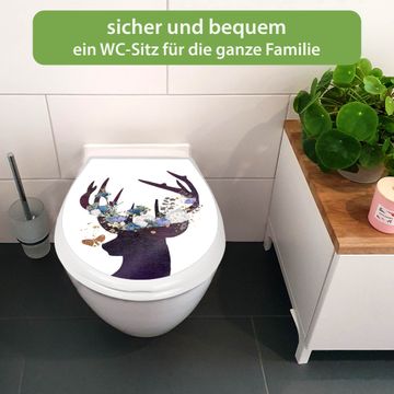 FUNKTION:Mit dem banjado Familien WC Sitz mit Absenkautomatik und dem Motiv Motiv Hirsch Blumengeweih verbinden Sie Design mit Funktionalität. Sie erhalten den Toilettendeckel in bewährt guter Qualität mit Montagematerial passend auf alle Euro-WC-Becken. Die Gesamtgröße beträgt 37,1cm x 44,9cm x 5cm, die Grundfarbe ist weiß.</p> DESIGN:Der Klodeckel in weiß mit Motiv Motiv Hirsch Blumengeweih hat eine ansprechende Optik, eine besondere Form und ist sehr stabil. Das Motiv besteht aus einer farbbrillianten Motivfolie, die durch ein Schutzlaminat zusätzlich vor Kratzern schützt. Der integrierte Kindersitz fügt sich harmonisch ein. DETAILS:Der Toilettensitz mit Soft Close besteht aus hochwertigem Polypropylen, ist geruchlos, ungiftig und kann mit handelsüblicher Seife gereinigt werden. Die Montage kann von von oben oder von unten erfolgen und ist kinderleicht. NUTZEN:Mit Hilfe der detaillierten Aufbauanleitung ermöglichen wir eine schnelle und unkomplizierte Montage. Die banjado Klobrille ist universell geeignet für alle Euro-WC-Schüsseln. Der Kindersitz kann unkompliziert entfernt werden. BANJADO:Ihr WC-Deckel wird in Sachsen in einer kleinen Manufaktur von Hand veredelt. Die Motivfolie ist lösungsmittelfrei und schutzlaminiert für einen langen Halt. Wir wünschen viel Freude bei der Auswahl eines schönen Motivs.